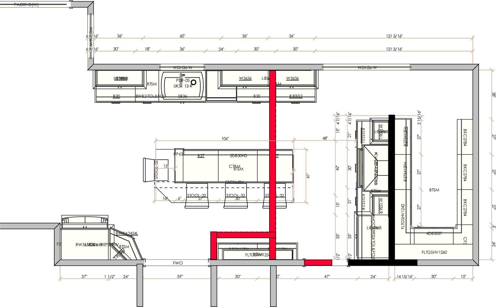 This layout shows the previous wall(s) that will be removed in red, and the new pantry wall in black