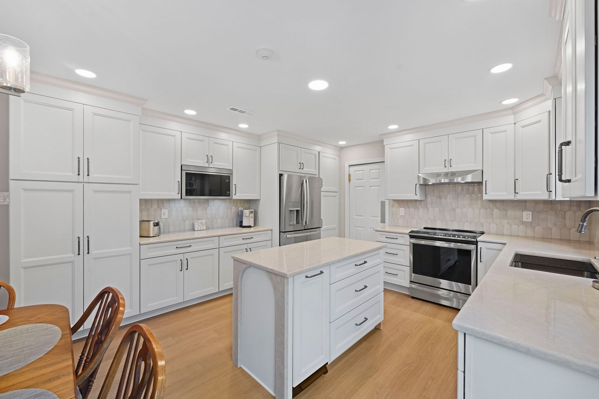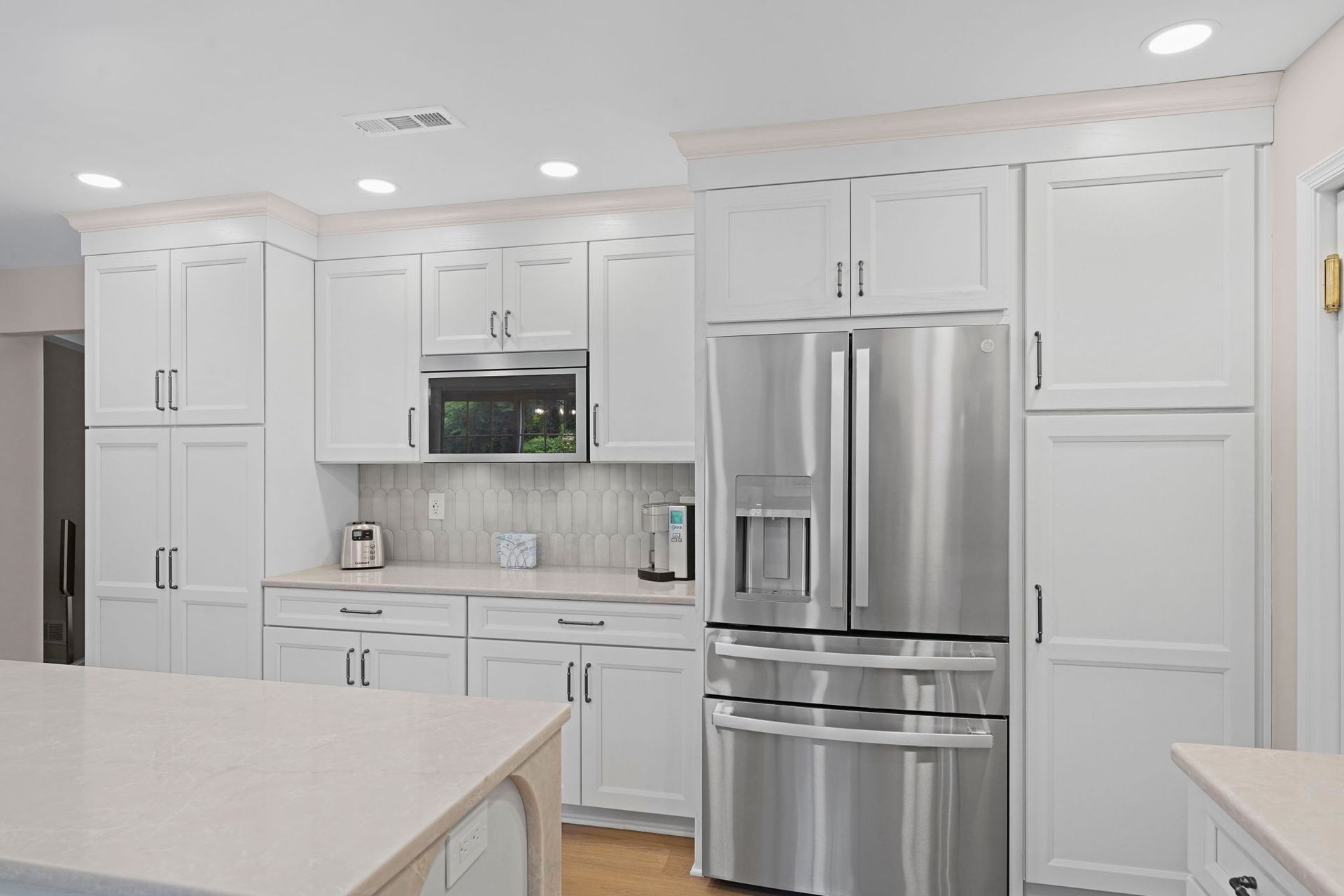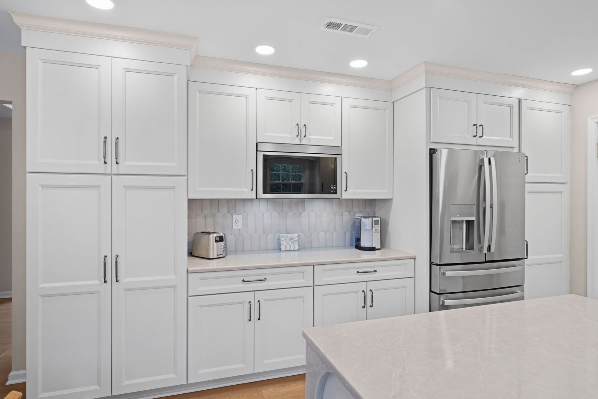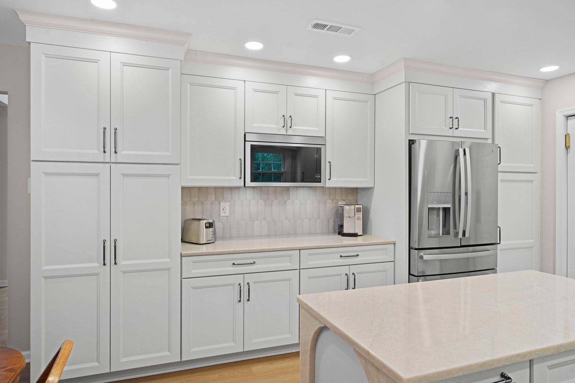 Pretty and pinkish, this kitchen combines white cabinets with rose-toned stone. The stone is actually more tan/neutral in person. The cabinets are Wellborn, oak wood painted alabaster. The countertops and island are Wilsonart Quartz in the selection marathi marble, and there's elegant side and back details on the island. The backsplash is mist grey mix arranged vertically. The flooring is Durato LVP in the color cyprus. The lighting includes high hats and under cabinet LEDs. Special features in this kitchen include the quartz details, and the ceiling molding painted to match the walls.