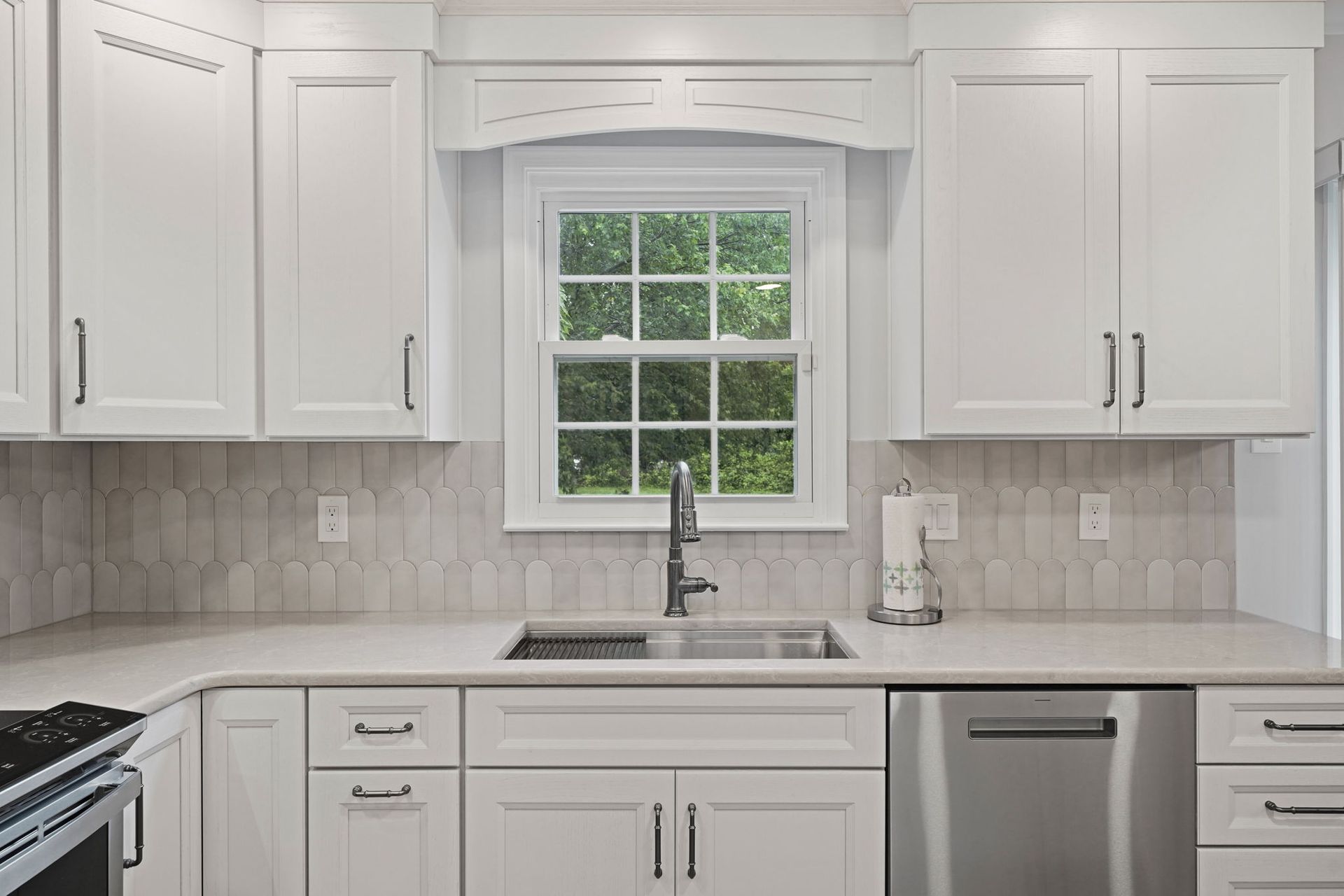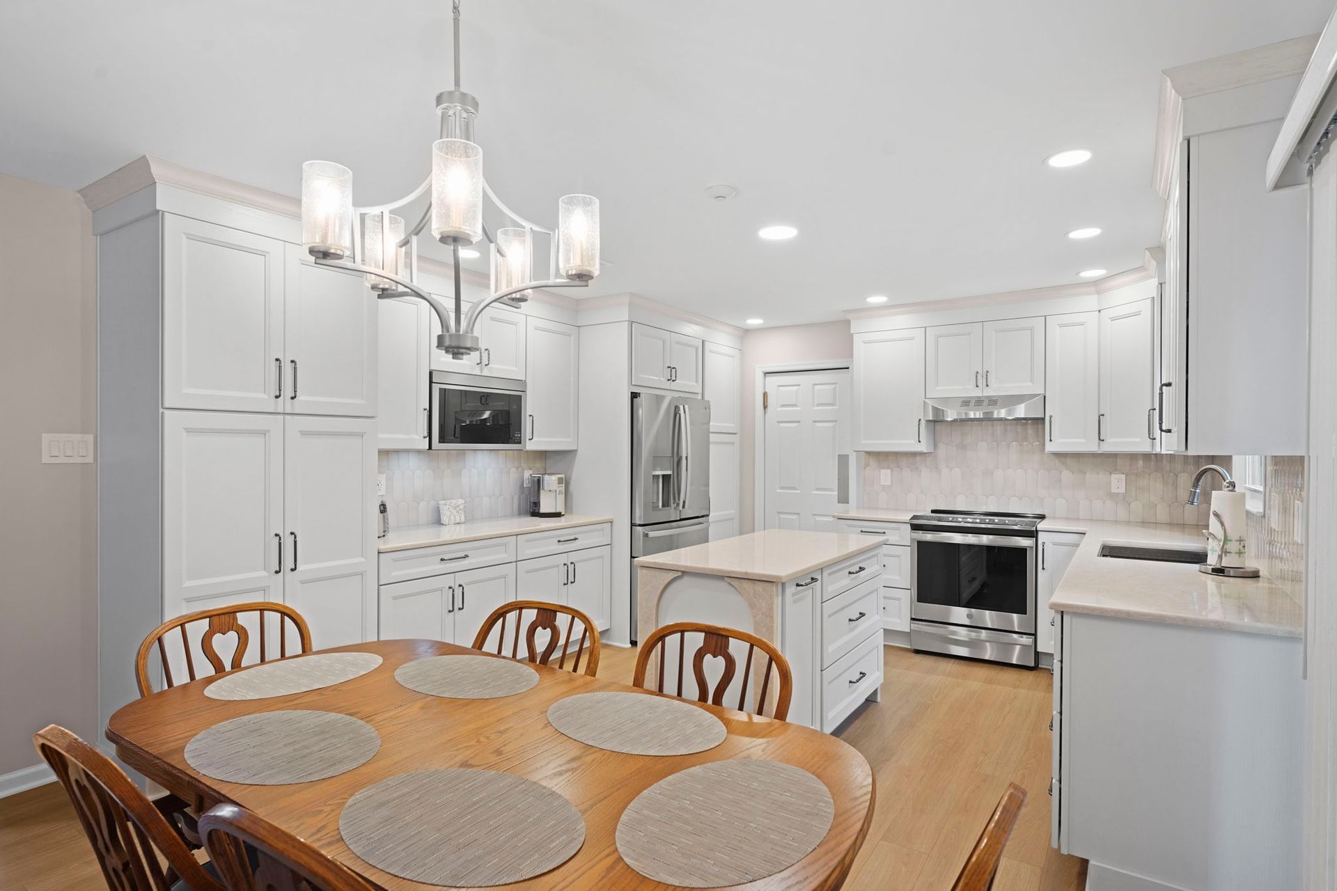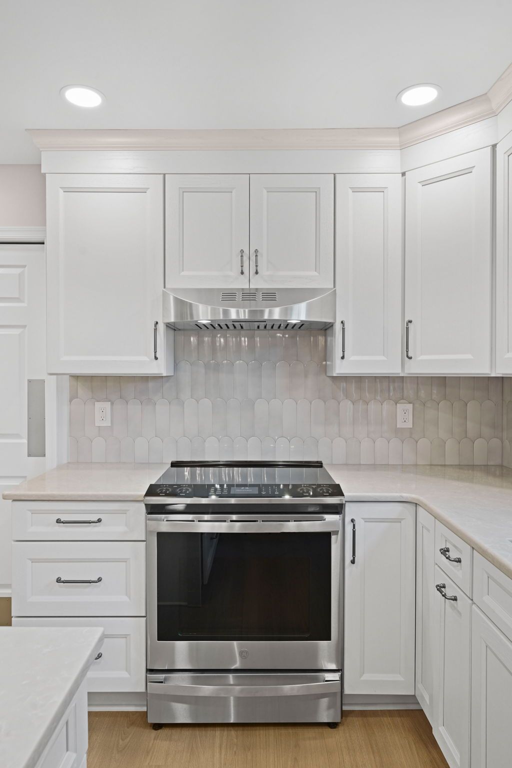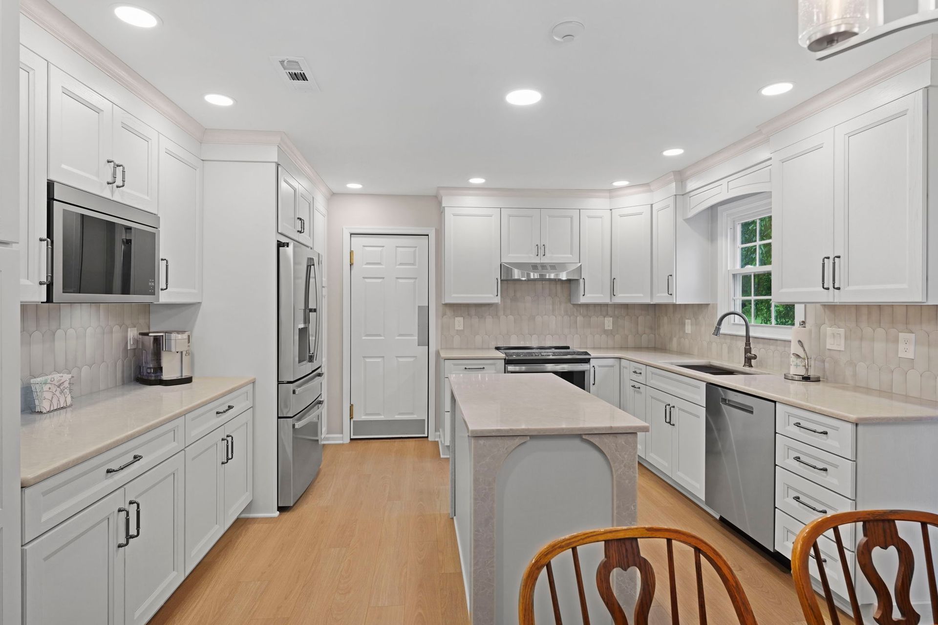Pretty and pinkish, this kitchen combines white cabinets with rose-toned stone. The stone is actually more tan/neutral in person. The cabinets are Wellborn, oak wood painted alabaster. The countertops and island are Wilsonart Quartz in the selection marathi marble, and there's elegant side and back details on the island. The backsplash is mist grey mix arranged vertically. The flooring is Durato LVP in the color cyprus. The lighting includes high hats and under cabinet LEDs. Special features in this kitchen include the quartz details, and the ceiling molding painted to match the walls.