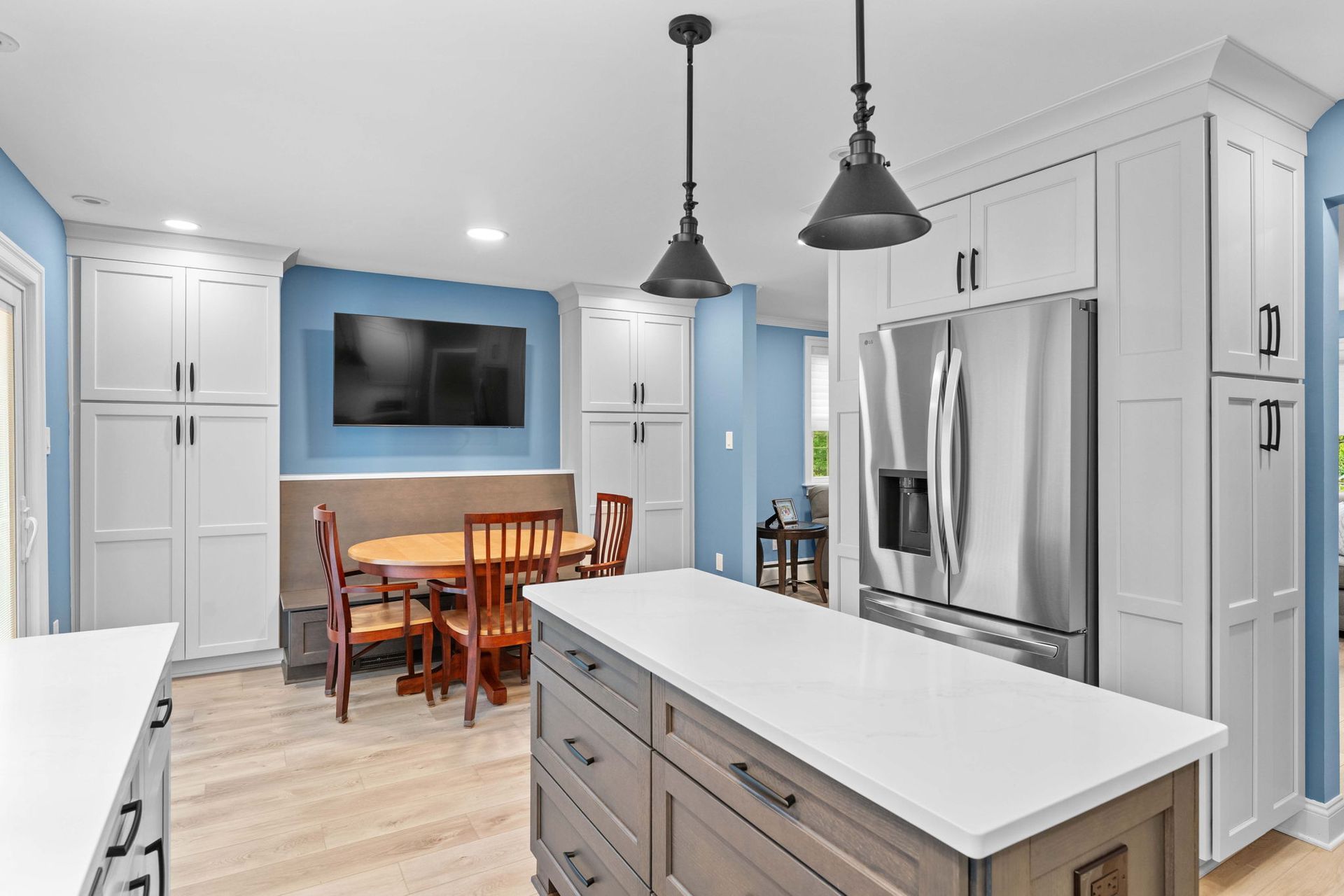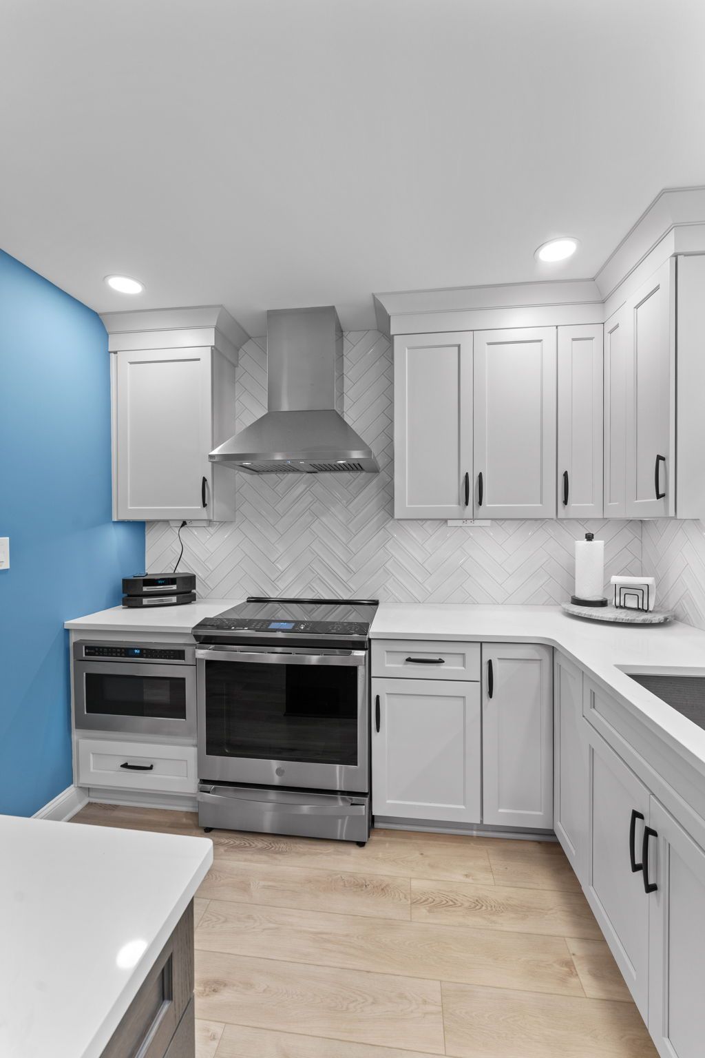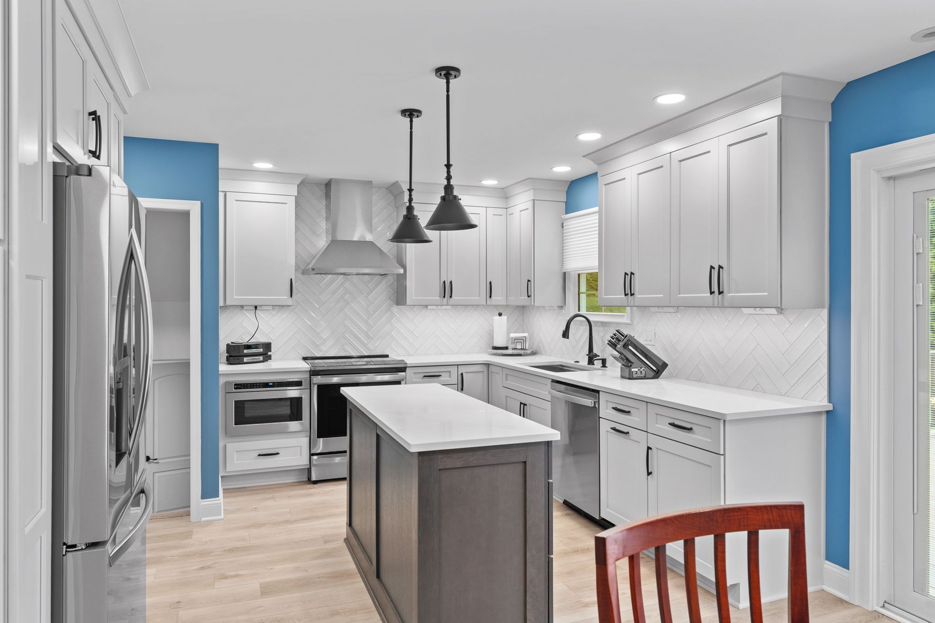A modern kitchen with a colorful background. The cabinets are Wellborn, MDF painted alabaster for the perimeter and oak wood stained in gauntlet for the island and bench. The countertop is quartz, Calcutta Chicago style. The backsplash is white contour groove arranged in a herringbone pattern for added dimension. The flooring is LVP, Azul Tortuga in the color blue sands. Lighting includes pendants, high hats, and under cabinet LEDs. Special features include a drawer microwave, metal range hood, toe space heaters beneath the sink and bench, and a small marble lazy suzan in the corner.