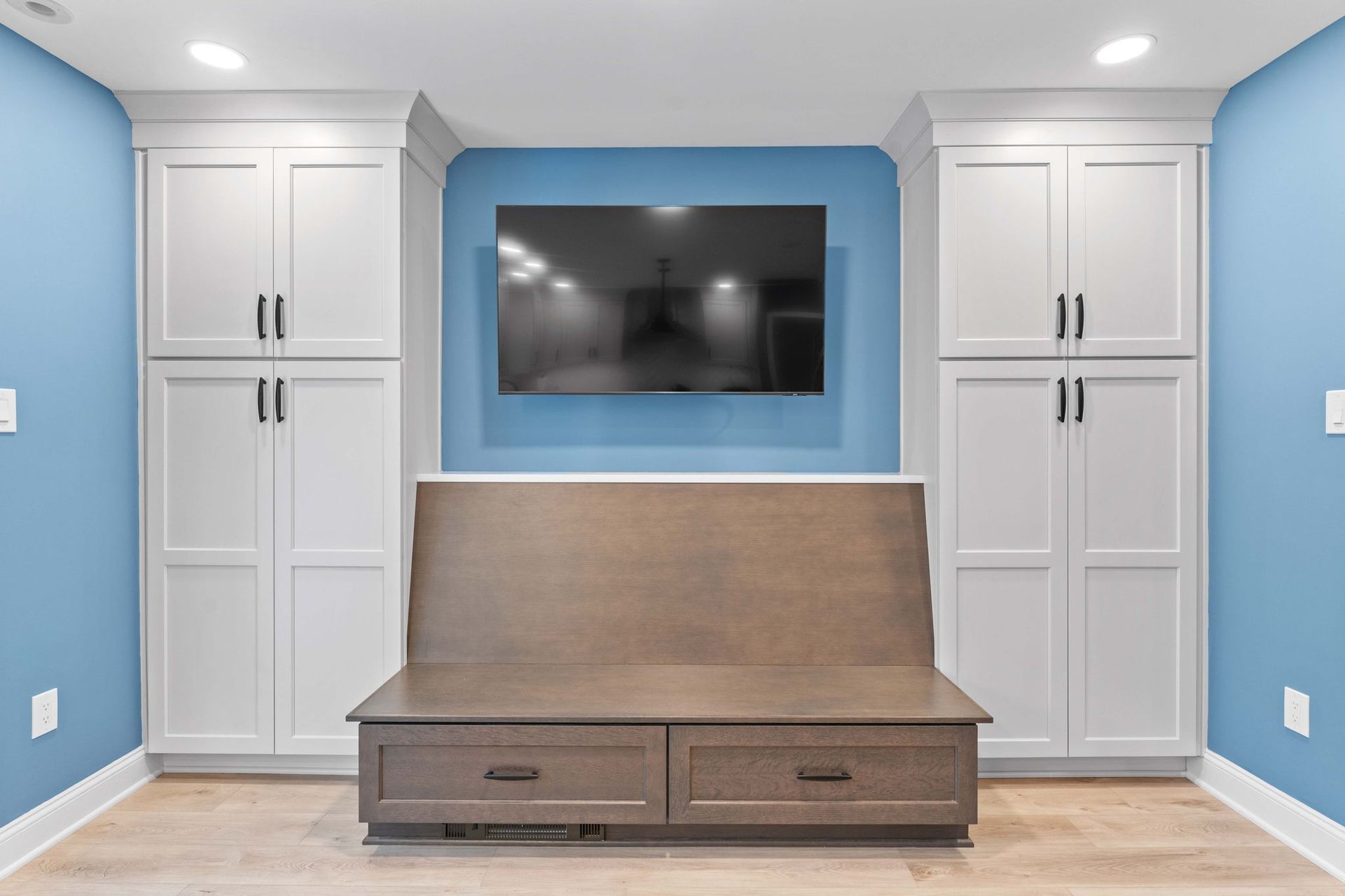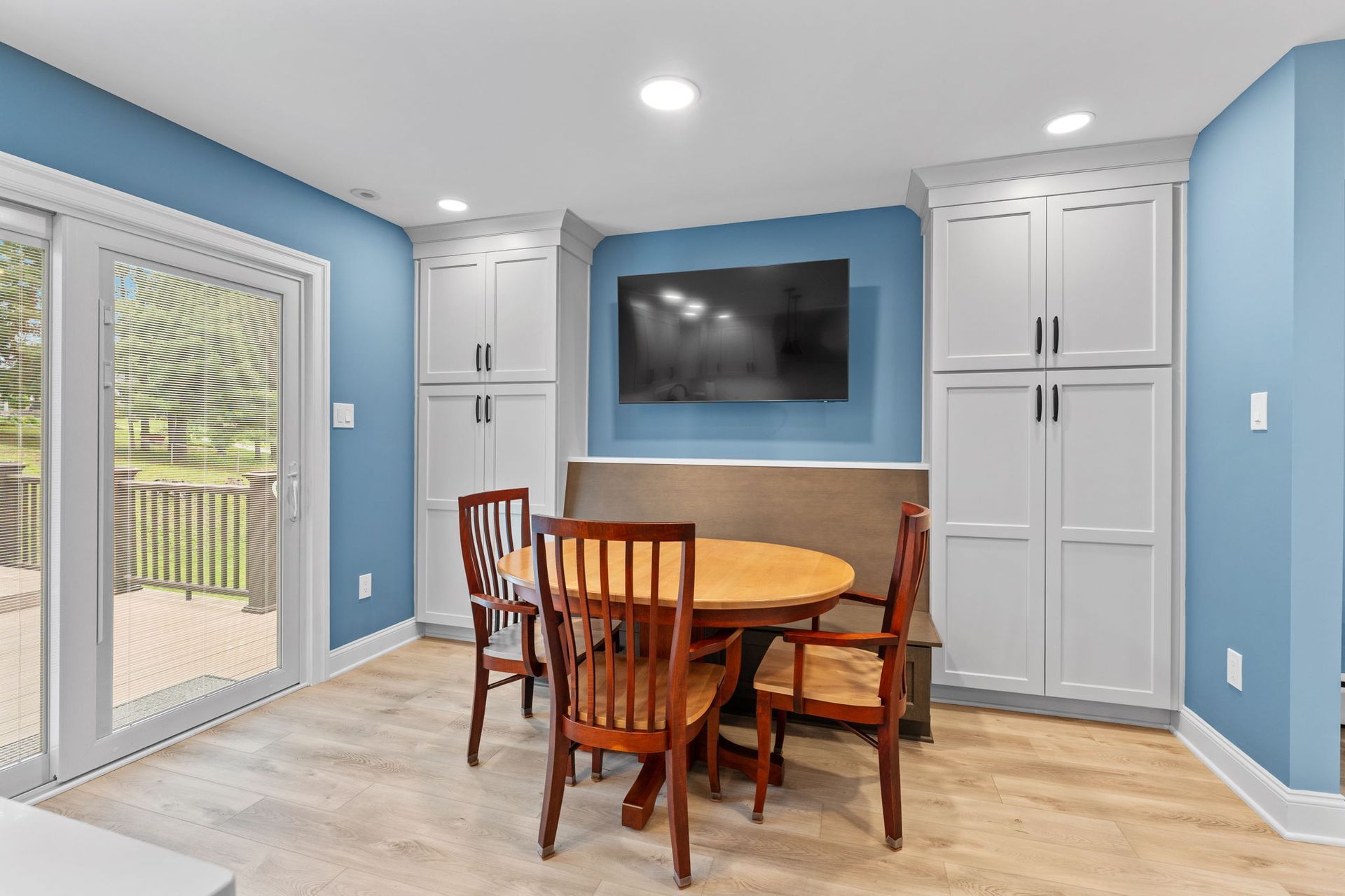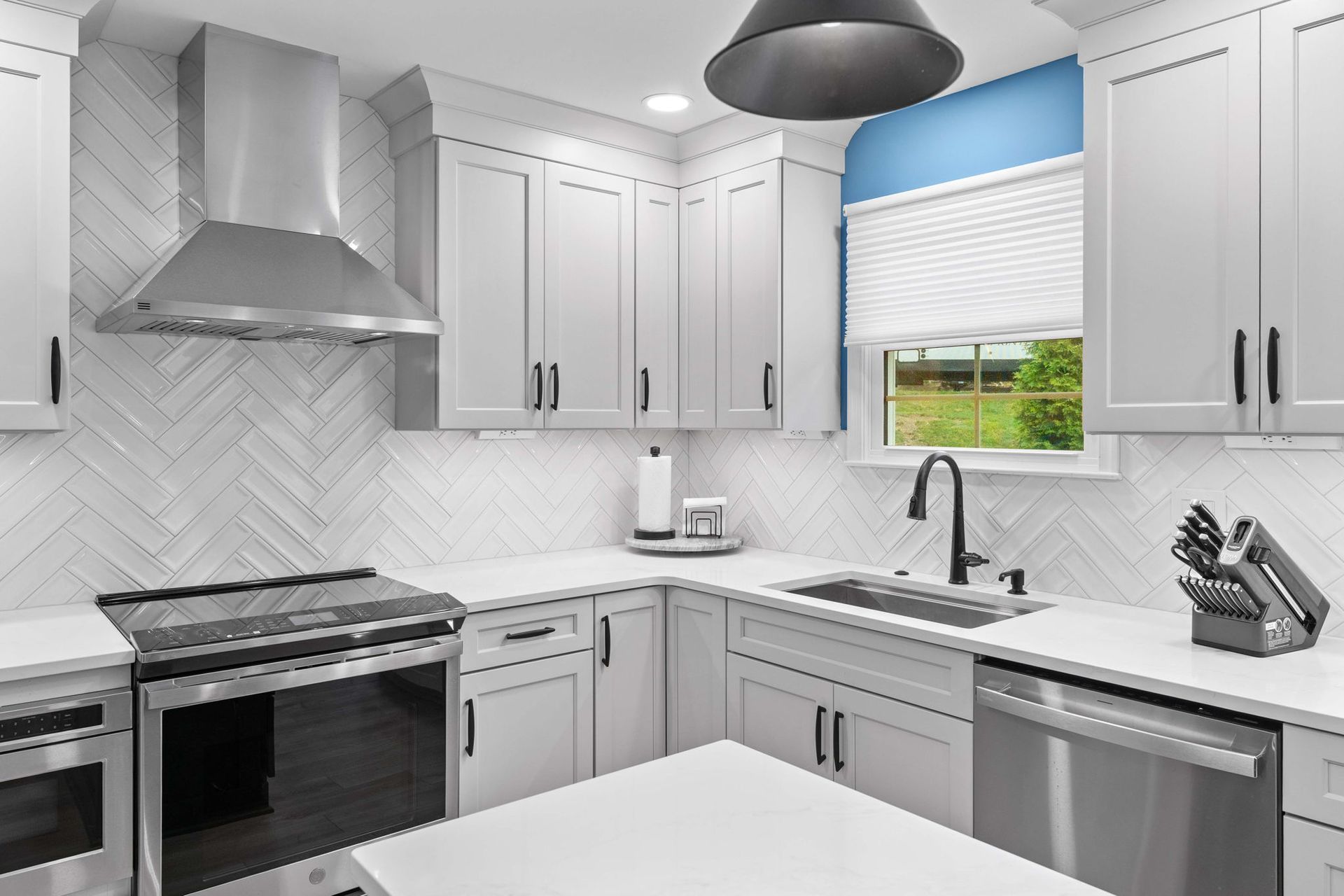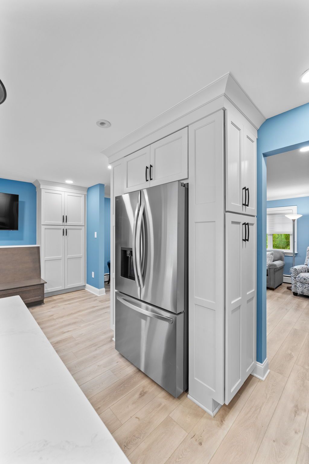 A modern kitchen with a colorful background. The cabinets are Wellborn, MDF painted alabaster for the perimeter and oak wood stained in gauntlet for the island and bench. The countertop is quartz, Calcutta Chicago style. The backsplash is white contour groove arranged in a herringbone pattern for added dimension. The flooring is LVP, Azul Tortuga in the color blue sands. Lighting includes pendants, high hats, and under cabinet LEDs. Special features include a drawer microwave, metal range hood, toe space heaters beneath the sink and bench, and a small marble lazy suzan in the corner.