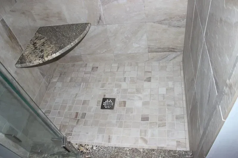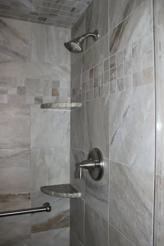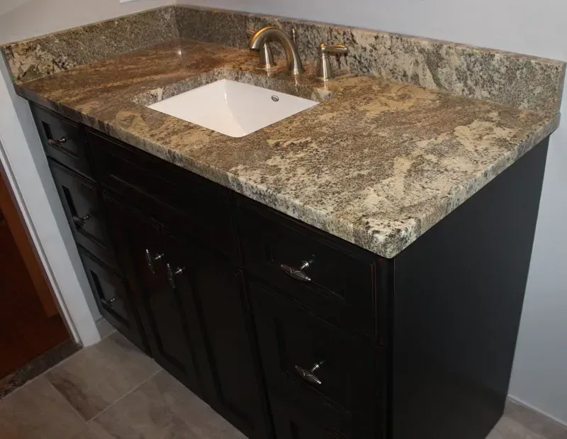This bathroom in Southampton, PA was updated with Omega Dynasty vanity in cherry with blackberry stain, granite countertops, tile floor, expanded shower with custom tile work and heavy glass door and granite accents.