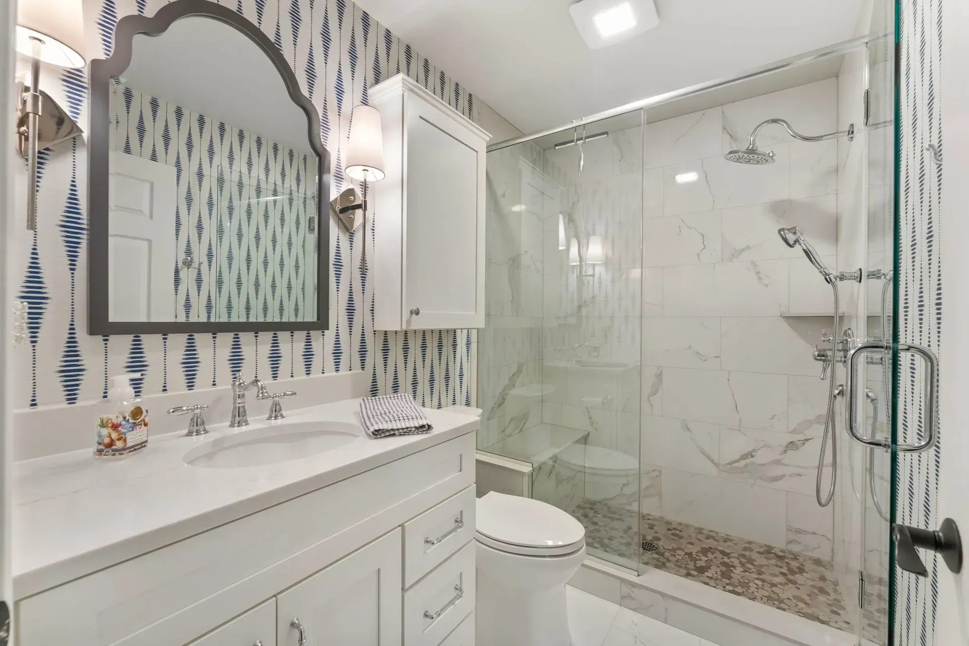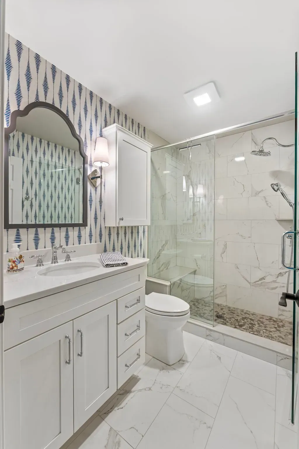 Echoing the master bath’s soothing aesthetic, the guest bathroom also features a walk-in shower with a built-in seat and the same tranquil pebble floor. White cabinetry keeps the room bright and fresh, while a single-sink vanity provides everyday functionality. To increase storage without compromising style, a custom cabinet was added above the toilet, seamlessly blending into the design. For a personal and playful touch, the homeowner introduced blue-patterned wallpaper—an elegant splash of color that brings personality and charm to the guest space. Matching fixtures from the master bath tie the two rooms together, reinforcing the home’s sense of cohesion.