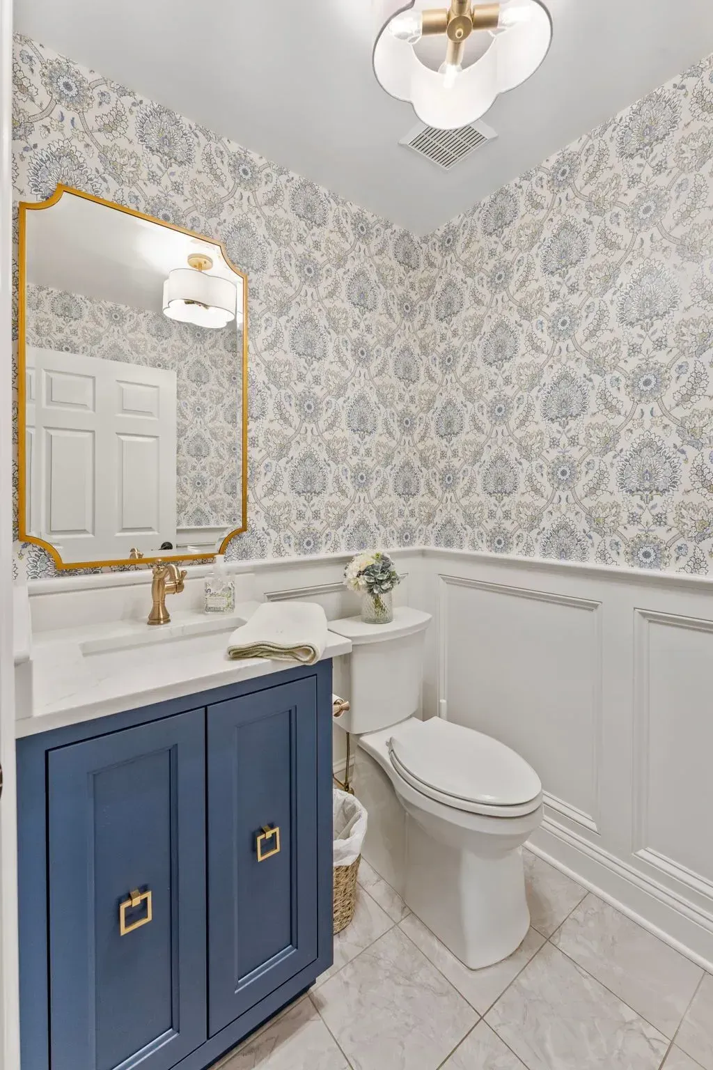 The powder room, though smaller in size, makes a bold and beautiful statement. Here, blue takes a more prominent role, with richly detailed wallpaper wrapping the space in coastal-inspired elegance. The single vanity is both functional and striking, with the blue motif carried through in its design. Distinct from the other bathrooms, the powder room features brighter gold-toned hardware, introducing a sense of vibrancy and warmth that echoes the natural tones of the other two bathrooms while standing confidently on its own.