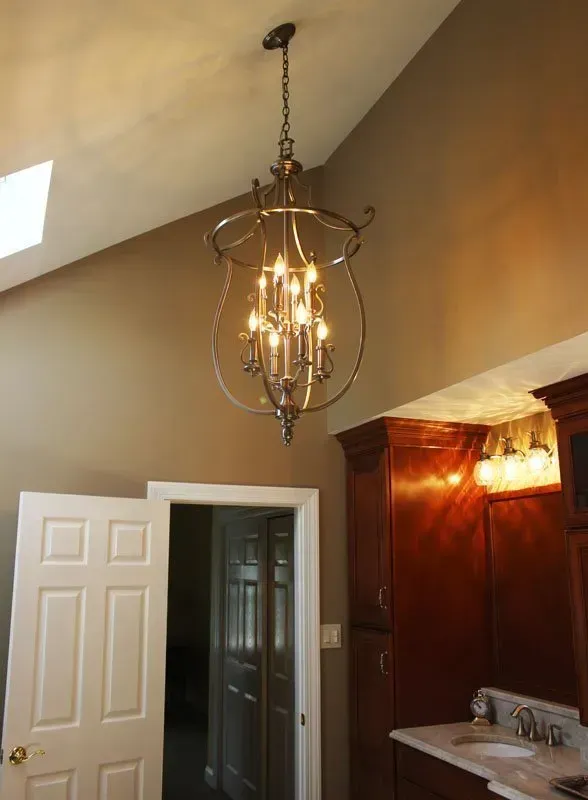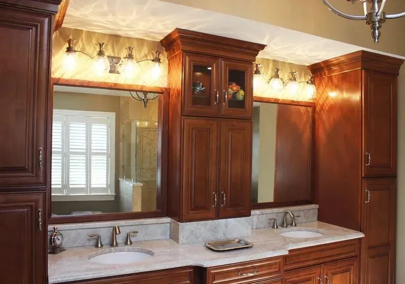 Bathroom in Newtown, PA Double sink vanity with plenty of storage space, mirrors and lighting. The cabinets are Waypoint maple cabinets auburn glaze.