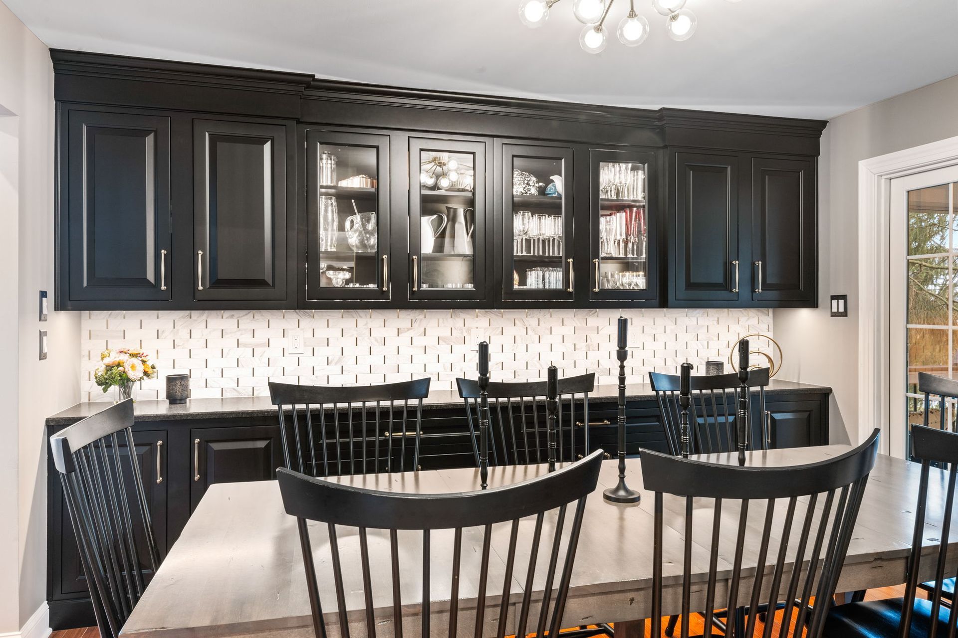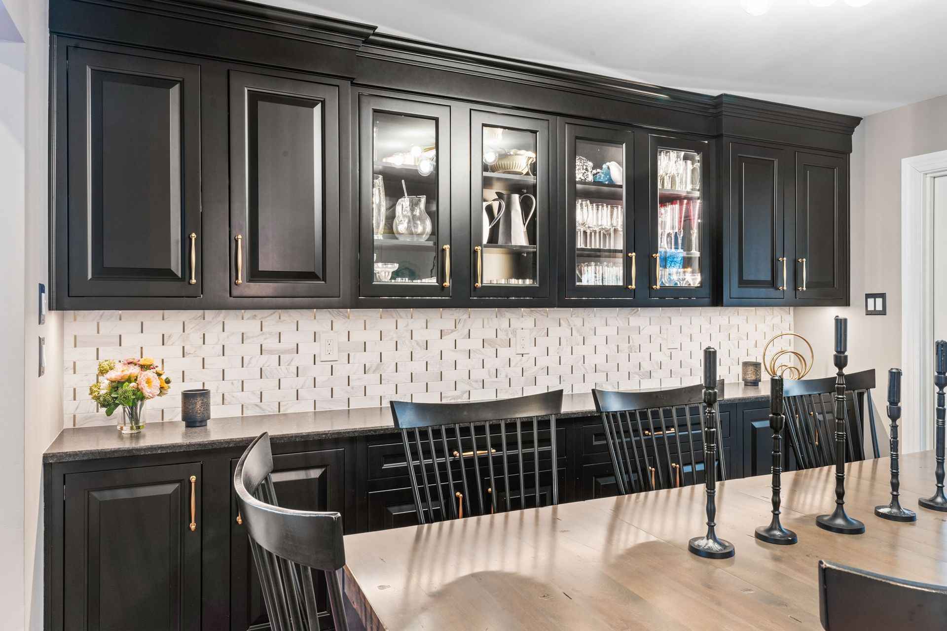 Completed while we remodeled this client's kitchen, this contemporary dining room give off an almost gothic feel. Black Wellborn cabinets match the dining room chairs as well as matching the black pearl leathered countertop, providing a striking contrast against the pale backsplash and lighter dining room table. Glass front cabinets showcase the family's fine dishware.