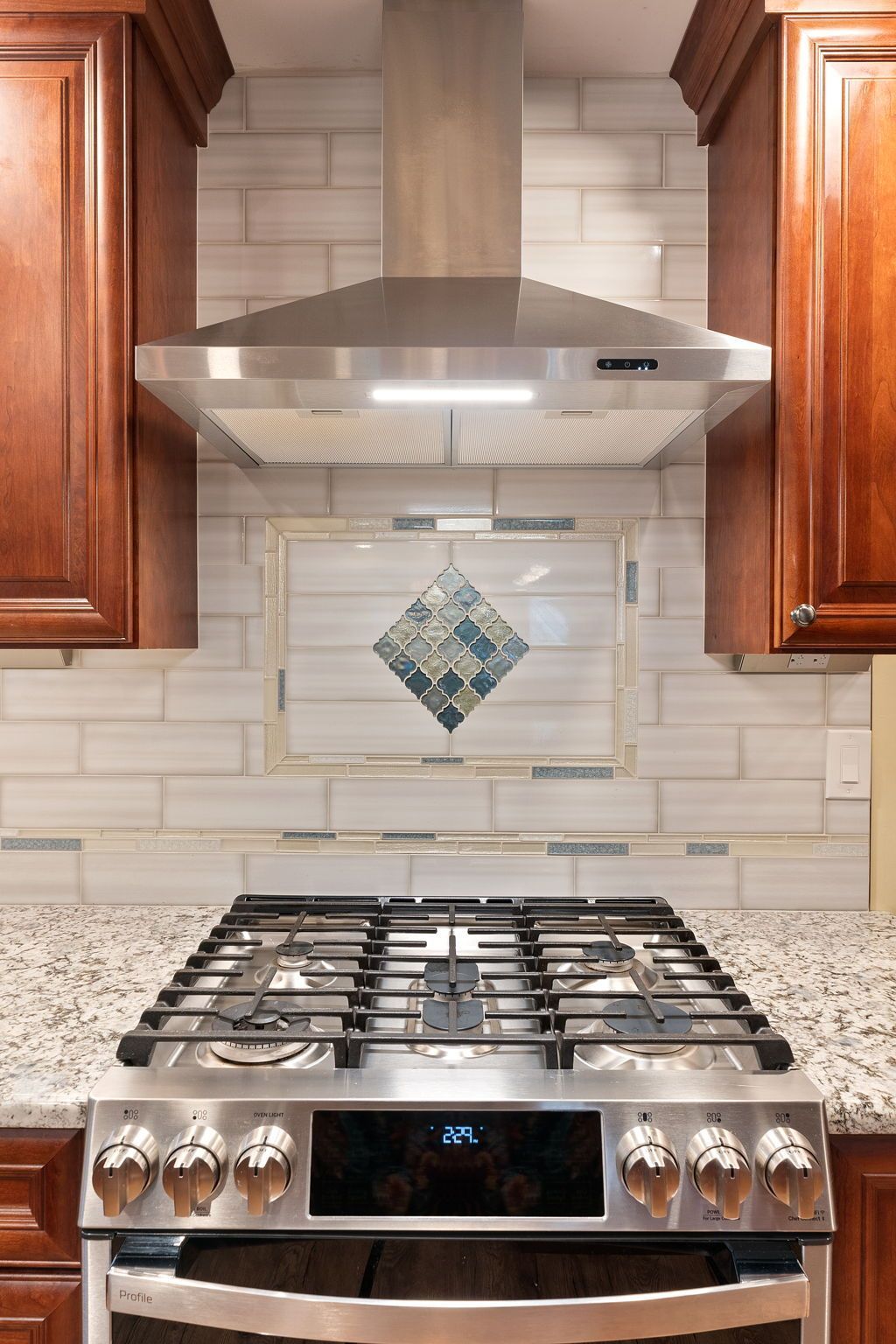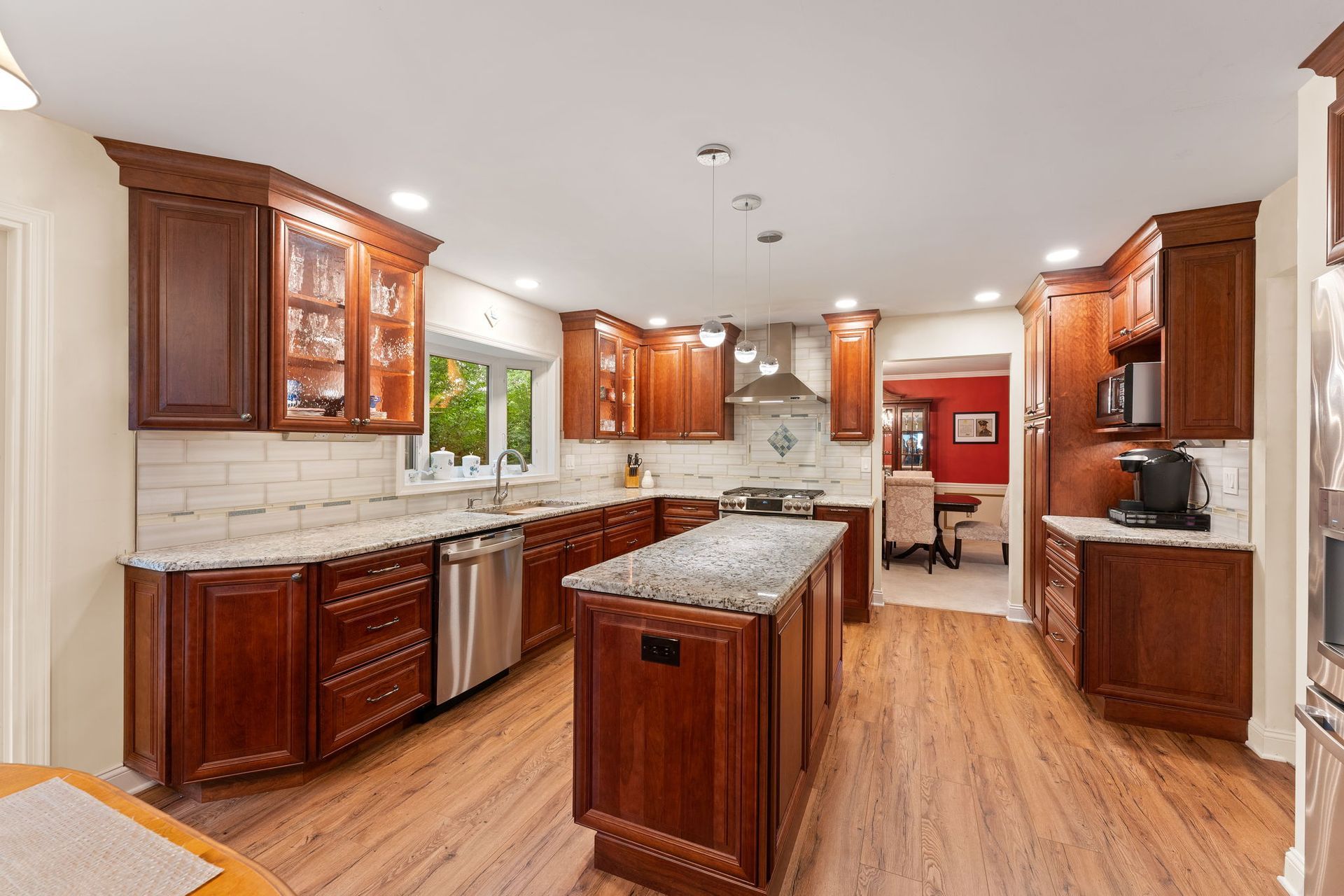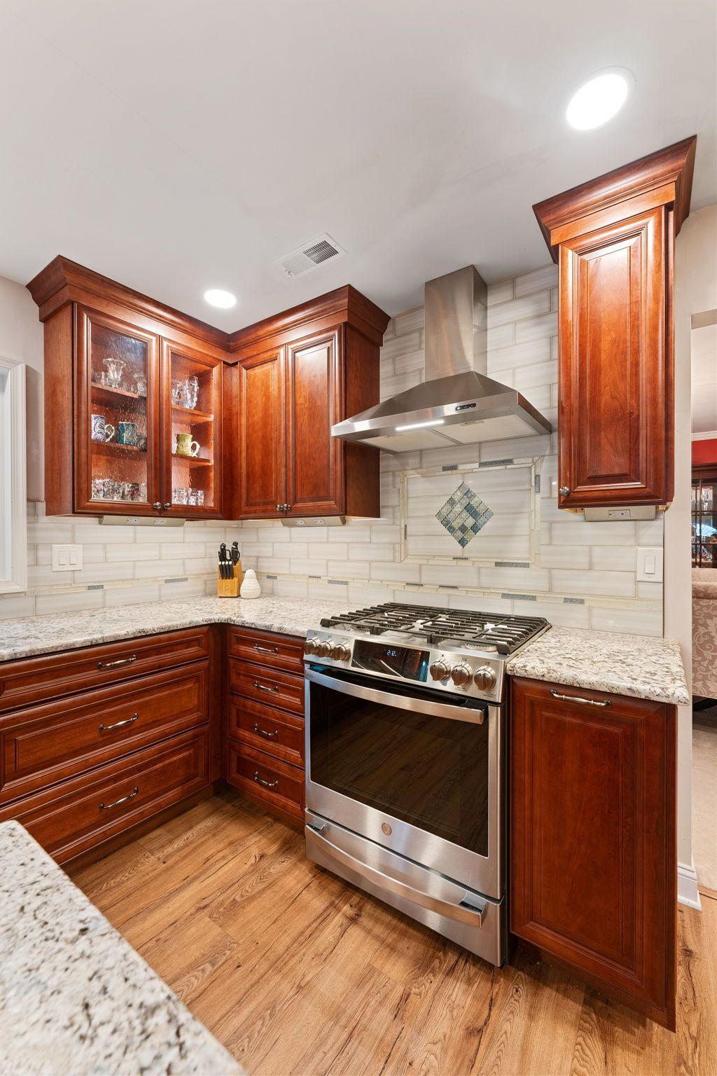 A mix between traditional American and Tuscan style, this kitchen uses bright cabinets to bring warmth to the space. Cabinets are Wellborn cherry wood with a dark finish and extend to the ceiling, with some glass transom cabinets. The backsplash is Everglow by Glazzio installed subway style with hints of light blue on the surrounding stripe and in the design beneath the range. It's not as noticeable but the countertop also has hints of blue, it's granite in the color selection Blue Flowers. The flooring is LVP, not quite as reddish/orange as the cabinets but still in that warm range. Lighting includes pendants over the island, high hats, and inner and under-cabinet LEDs. We love how this kitchen turned out, and we're sure our clients love it just as much.