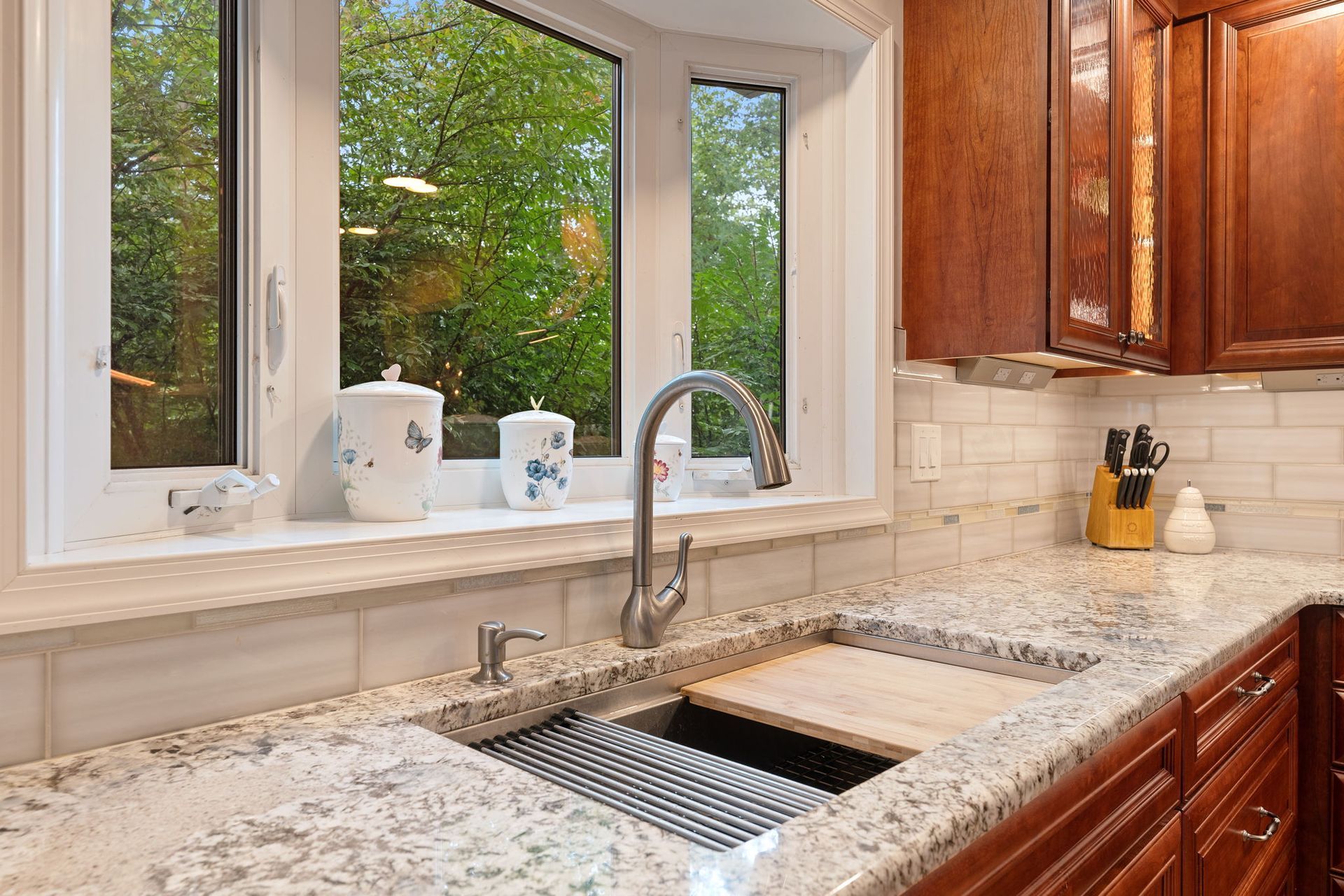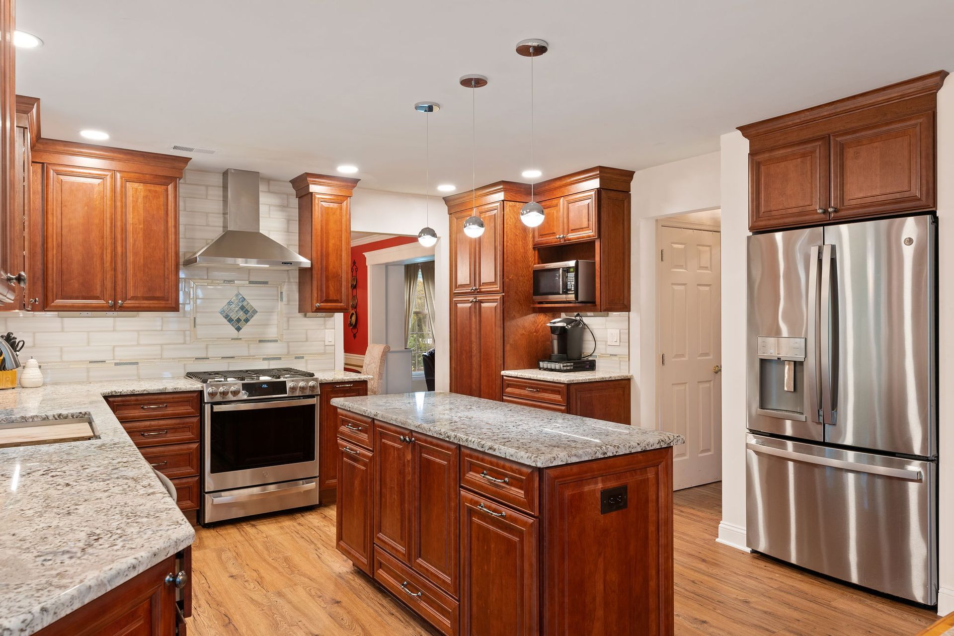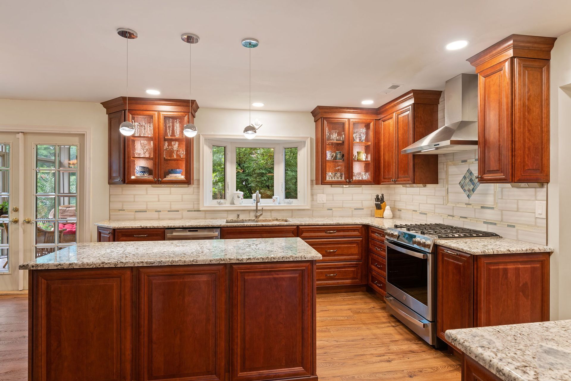 A mix between traditional American and Tuscan style, this kitchen uses bright cabinets to bring warmth to the space. Cabinets are Wellborn cherry wood with a dark finish and extend to the ceiling, with some glass transom cabinets. The backsplash is Everglow by Glazzio installed subway style with hints of light blue on the surrounding stripe and in the design beneath the range. It's not as noticeable but the countertop also has hints of blue, it's granite in the color selection Blue Flowers. The flooring is LVP, not quite as reddish/orange as the cabinets but still in that warm range. Lighting includes pendants over the island, high hats, and inner and under-cabinet LEDs. We love how this kitchen turned out, and we're sure our clients love it just as much.