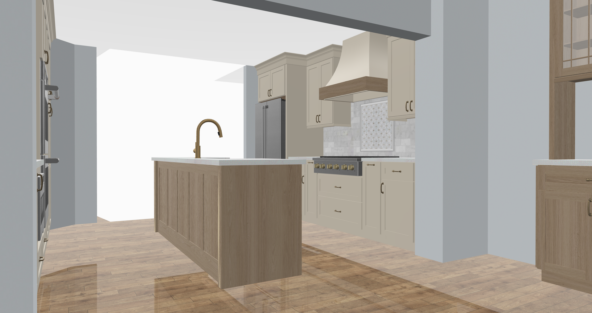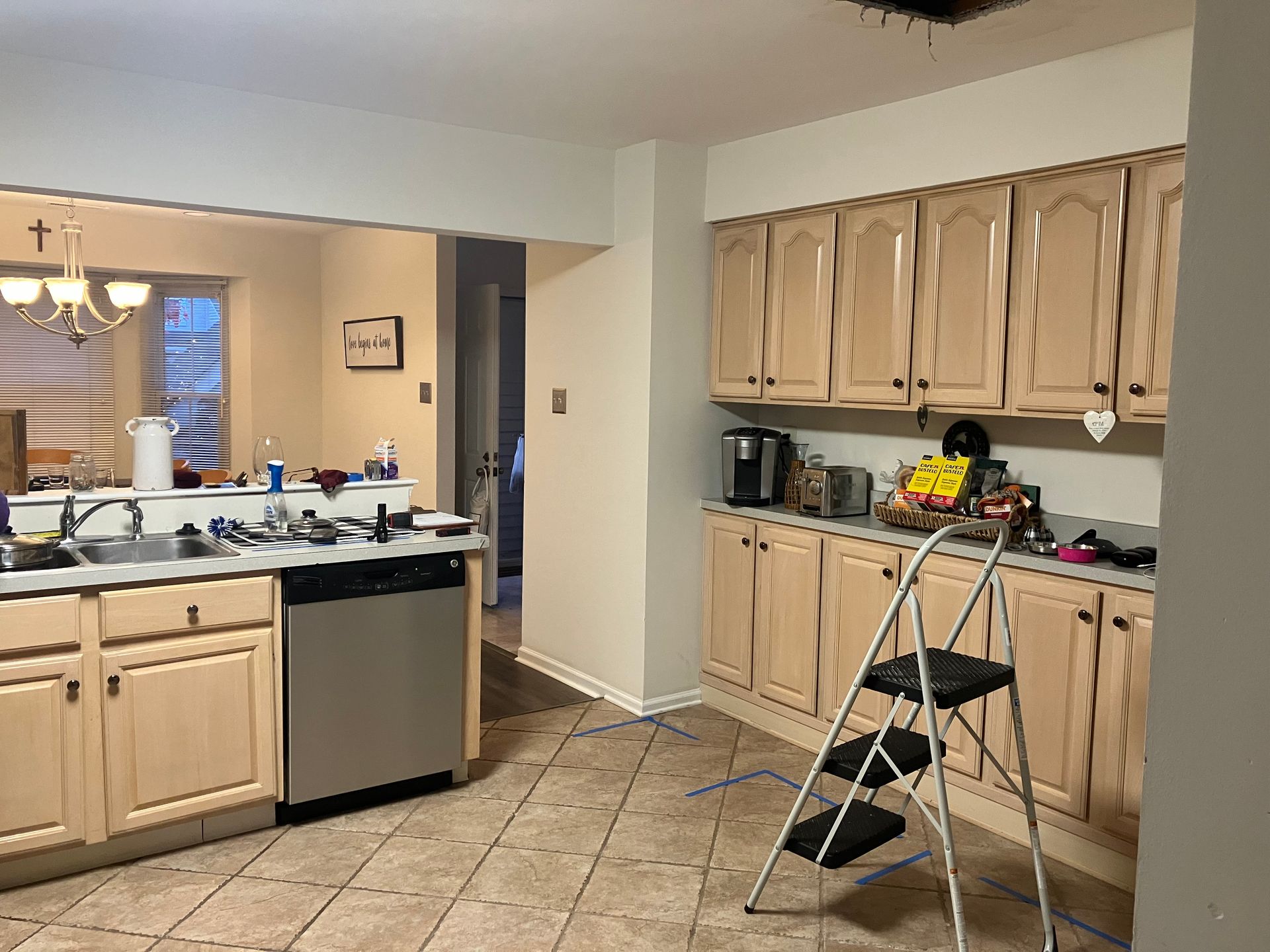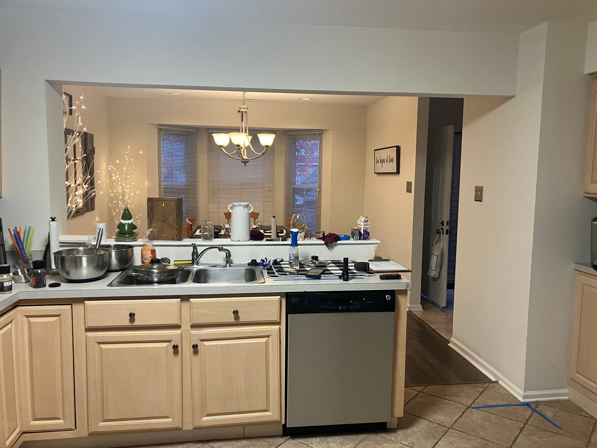 The goal was to create a space that would be better connected to the rest of the house, and suited to our client’s lifestyle. She’s big into entertaining so she wanted ease of access to all parts of her kitchen, and having a nice island was really important to her to provide a central prep and gathering area for guests. To open up the kitchen both half walls and the peninsula were removed, and the sink and dishwasher were relocated from the peninsula to the new island. The soffit to the left of the peninsula would be removed. That way all the new cabinets could extend to the ceiling for a more modern design. For more storage and for hosting purposes a beverage/coffee bar was built along the side wall in the dining room.