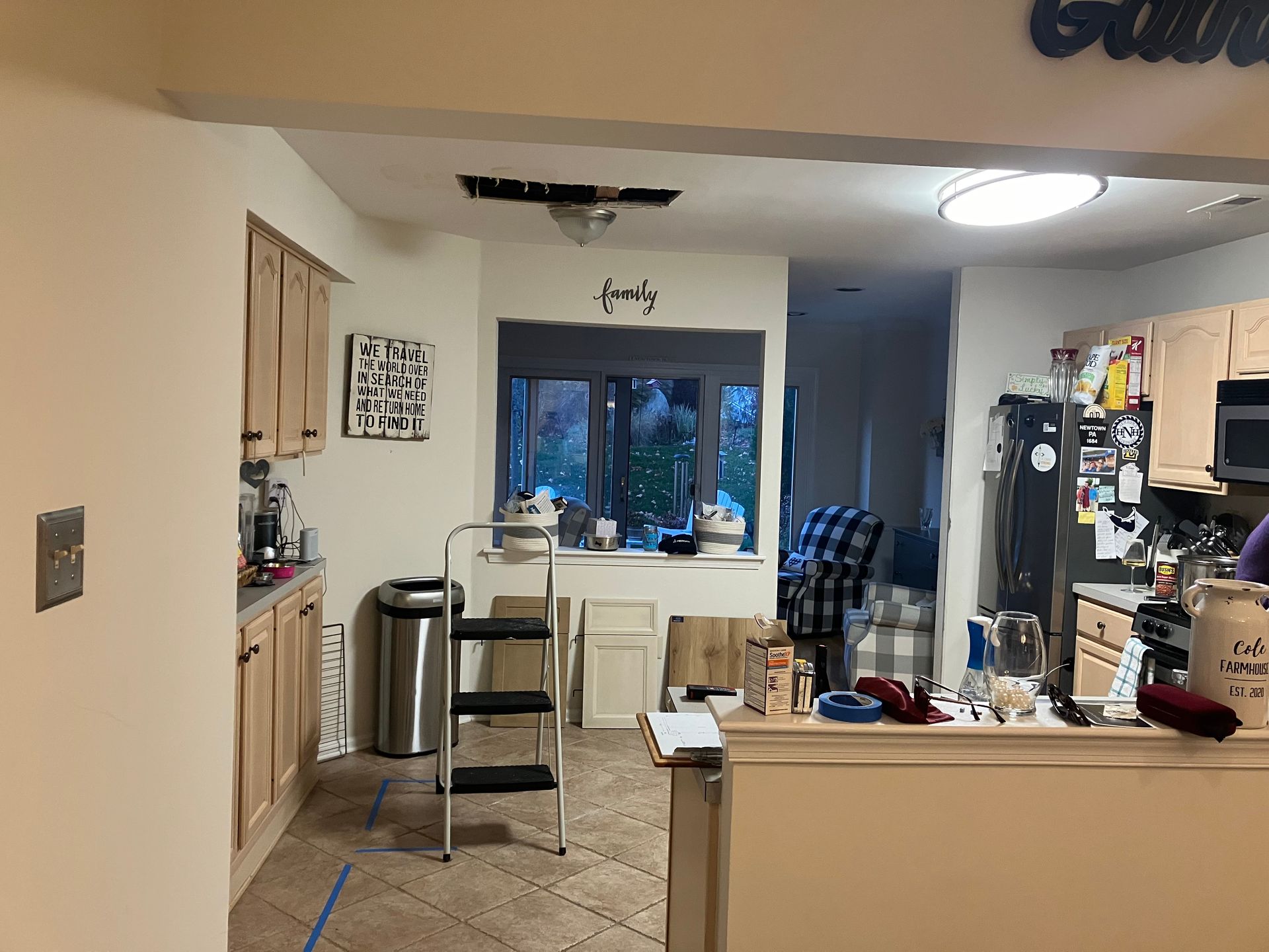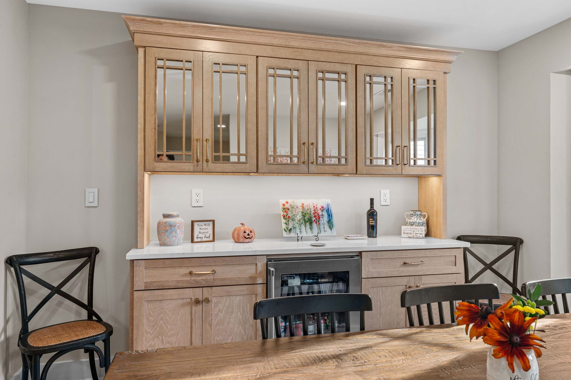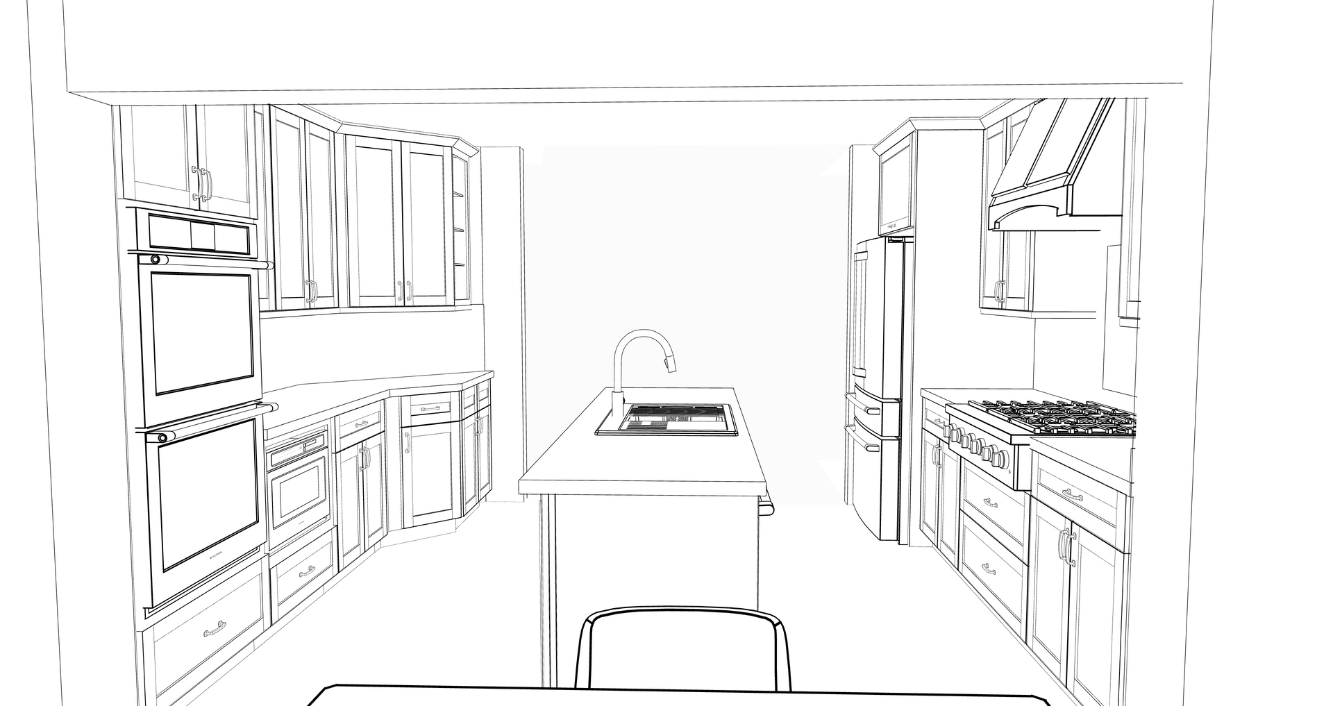 The goal was to create a space that would be better connected to the rest of the house, and suited to our client’s lifestyle. She’s big into entertaining so she wanted ease of access to all parts of her kitchen, and having a nice island was really important to her to provide a central prep and gathering area for guests. To open up the kitchen both half walls and the peninsula were removed, and the sink and dishwasher were relocated from the peninsula to the new island. The soffit to the left of the peninsula would be removed. That way all the new cabinets could extend to the ceiling for a more modern design. For more storage and for hosting purposes a beverage/coffee bar was built along the side wall in the dining room.