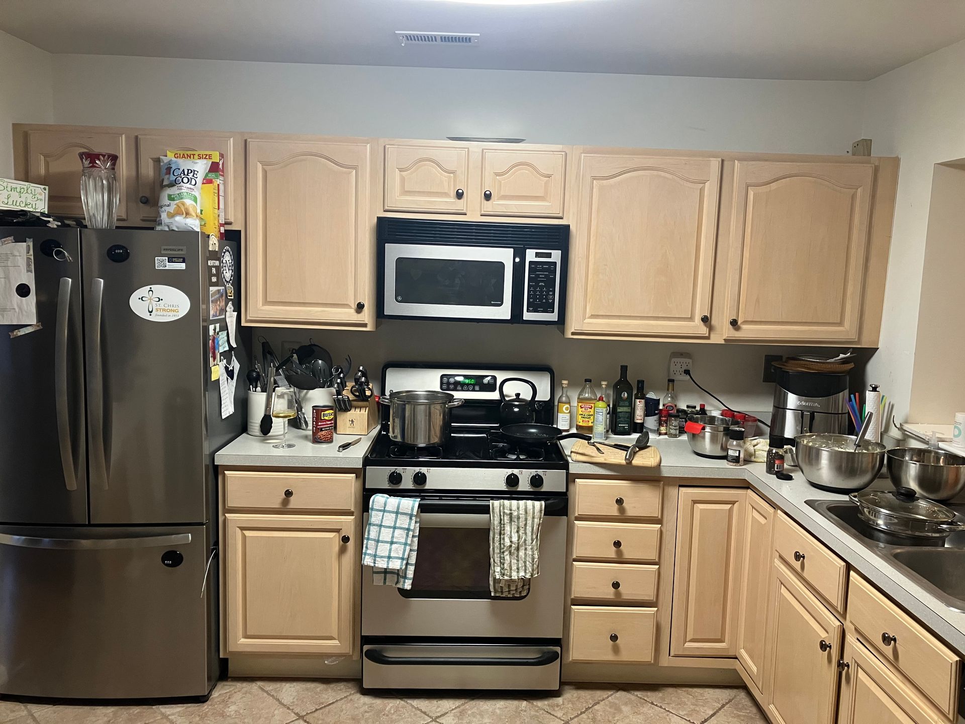 Our client lives in a center unit town home in Newtown, Bucks County PA. She only has windows in the front and back of the house, so she wanted her space to feel more continuous and open. The original kitchen was builder grade, it had a peninsula/half wall and a soffit above that separated the dining room from the kitchen, and a half wall on the opposite side to enclose the space. To the left of the peninsula there were cabinets nestled between walls and beneath another soffit, opposite that was the majority of cabinets, stove, microwave, and fridge. The sink and dishwasher were located in the peninsula. The cabinets were short and didn’t continue to the ceiling, they were blond colored natural wood with an antiquated door style. The client didn’t have much countertop space to work with either, so not only was the space outdated it was also nonfunctional for her entertaining lifestyle.