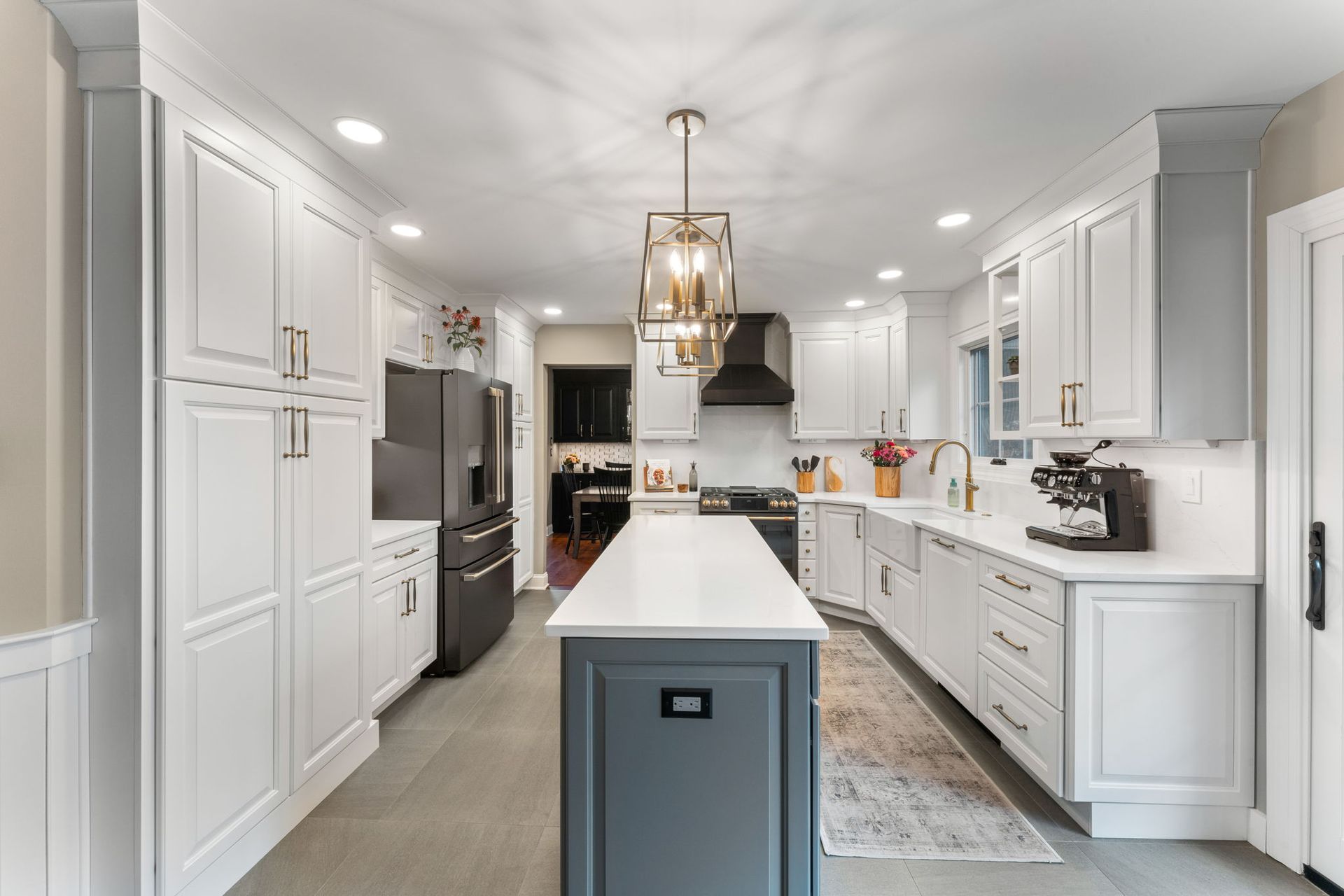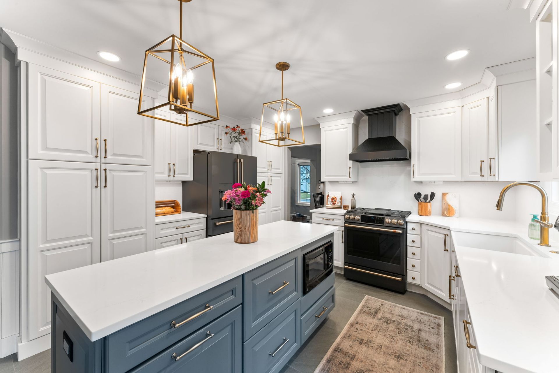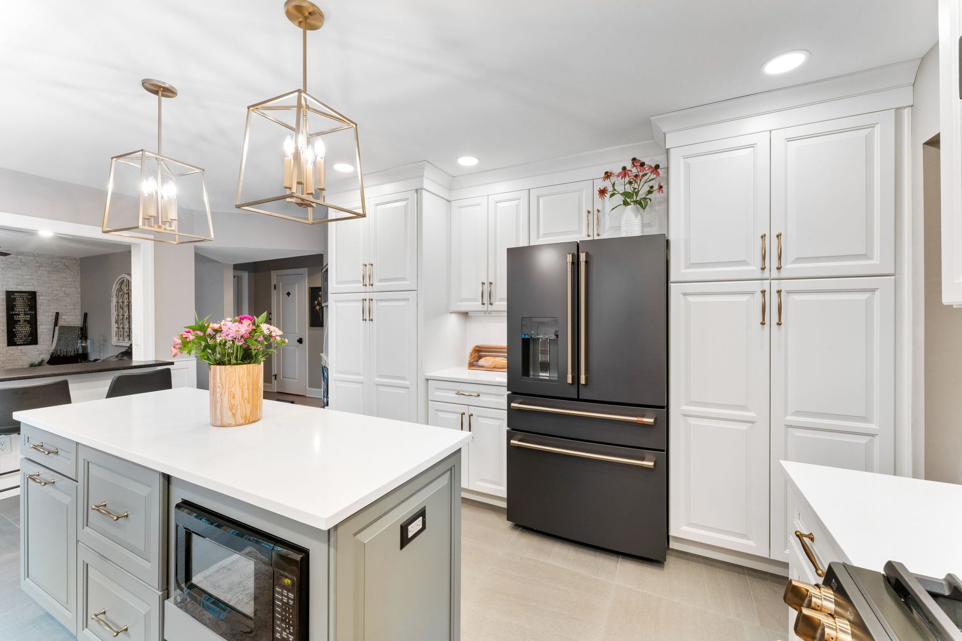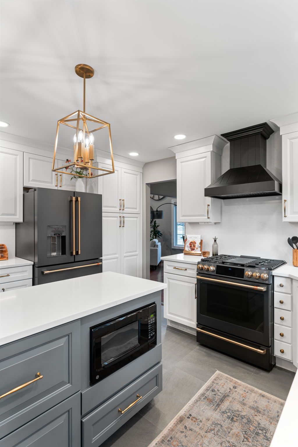This kitchen is modern and on trend, mixing white cabinets with a gray island, and using darker appliances for contrast. The cabinets are all Wellborn, white cabinets surrounding and the island is painted willow (it's closest to the rightmost photo in the first row, the bluish look is due to lighting and editing). The floor is tile, Happy Floors kursaal slate, a nice neutral match for the island. The countertop and backsplash are quartz, calacatta sonata, it has a subtle veining pattern on it and brings a bit of luxury when combined with the brass hardware and accents. The lighting includes pendants, high hats, and under-cabinet LEDs. This kitchen includes a drawer microwave in the island and a black metal range. We also did the cabinets in their dining room which you can see in the corner of the first photo, those details are in the miscellaneous gallery.
