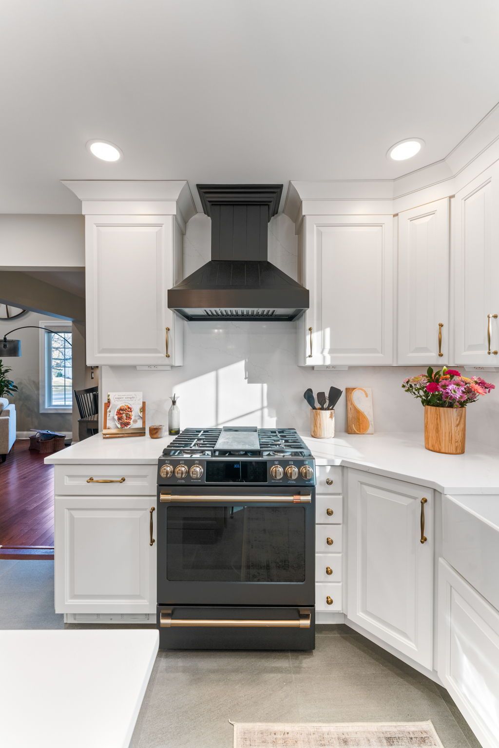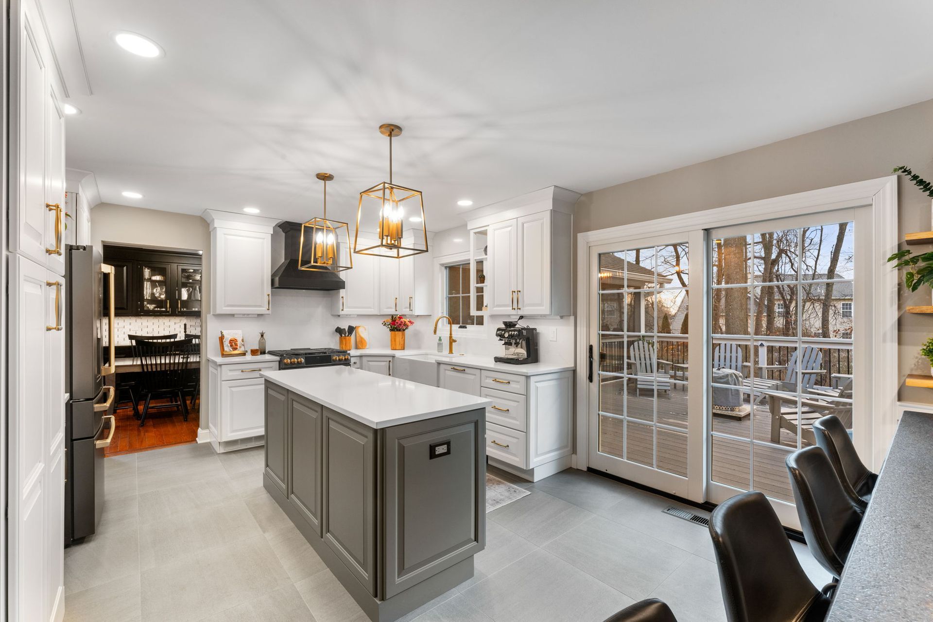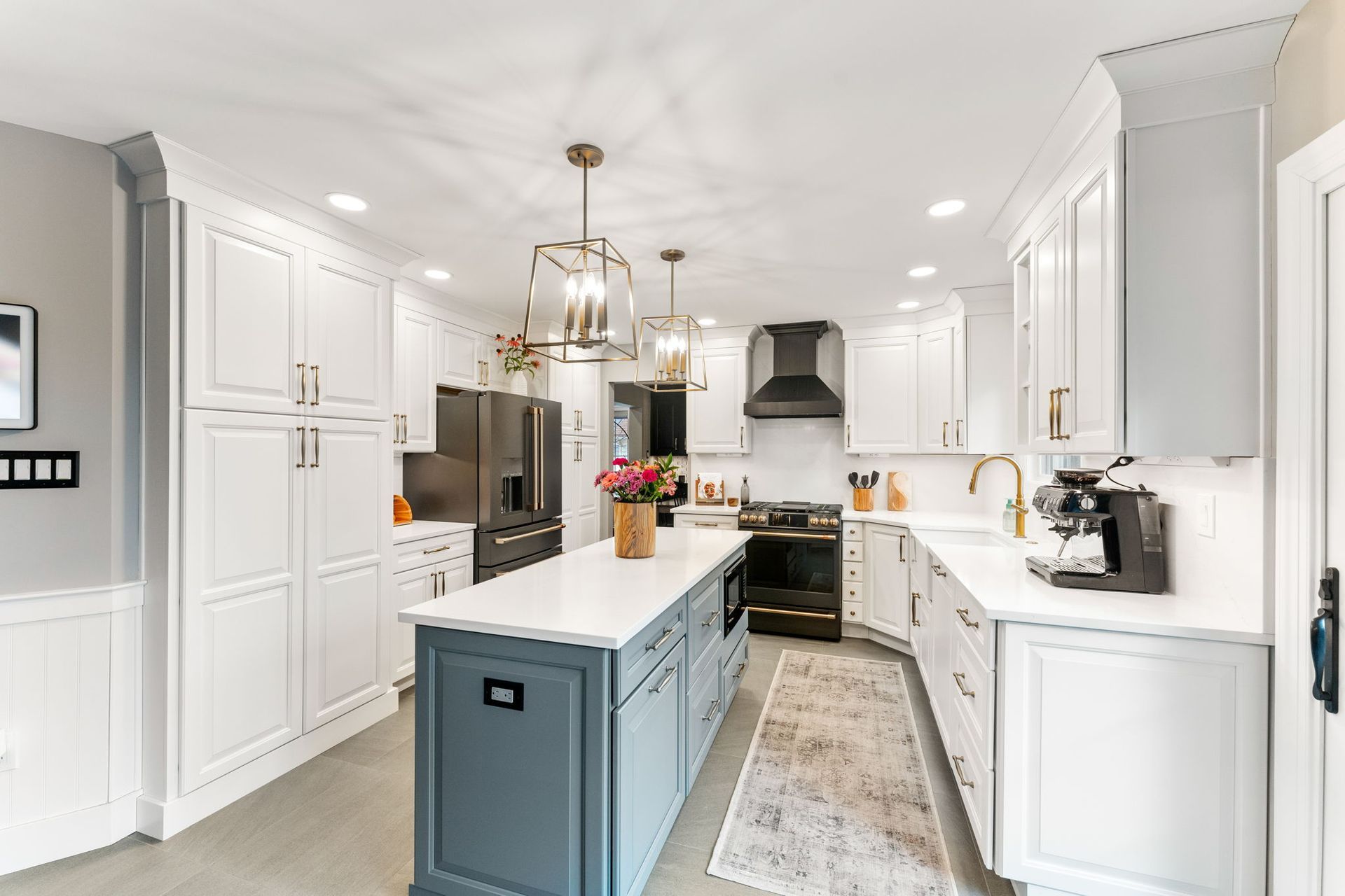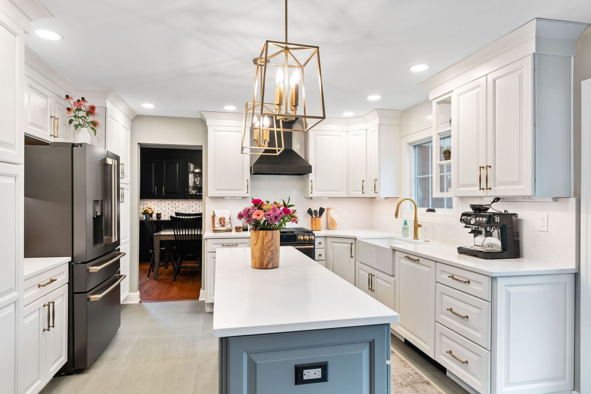 This kitchen is modern and on trend, mixing white cabinets with a gray island, and using darker appliances for contrast. The cabinets are all Wellborn, white cabinets surrounding and the island is painted willow (it's closest to the rightmost photo in the first row, the bluish look is due to lighting and editing). The floor is tile, Happy Floors kursaal slate, a nice neutral match for the island. The countertop and backsplash are quartz, calacatta sonata, it has a subtle veining pattern on it and brings a bit of luxury when combined with the brass hardware and accents. The lighting includes pendants, high hats, and under-cabinet LEDs. This kitchen includes a drawer microwave in the island and a black metal range. We also did the cabinets in their dining room which you can see in the corner of the first photo, those details are in the miscellaneous gallery.