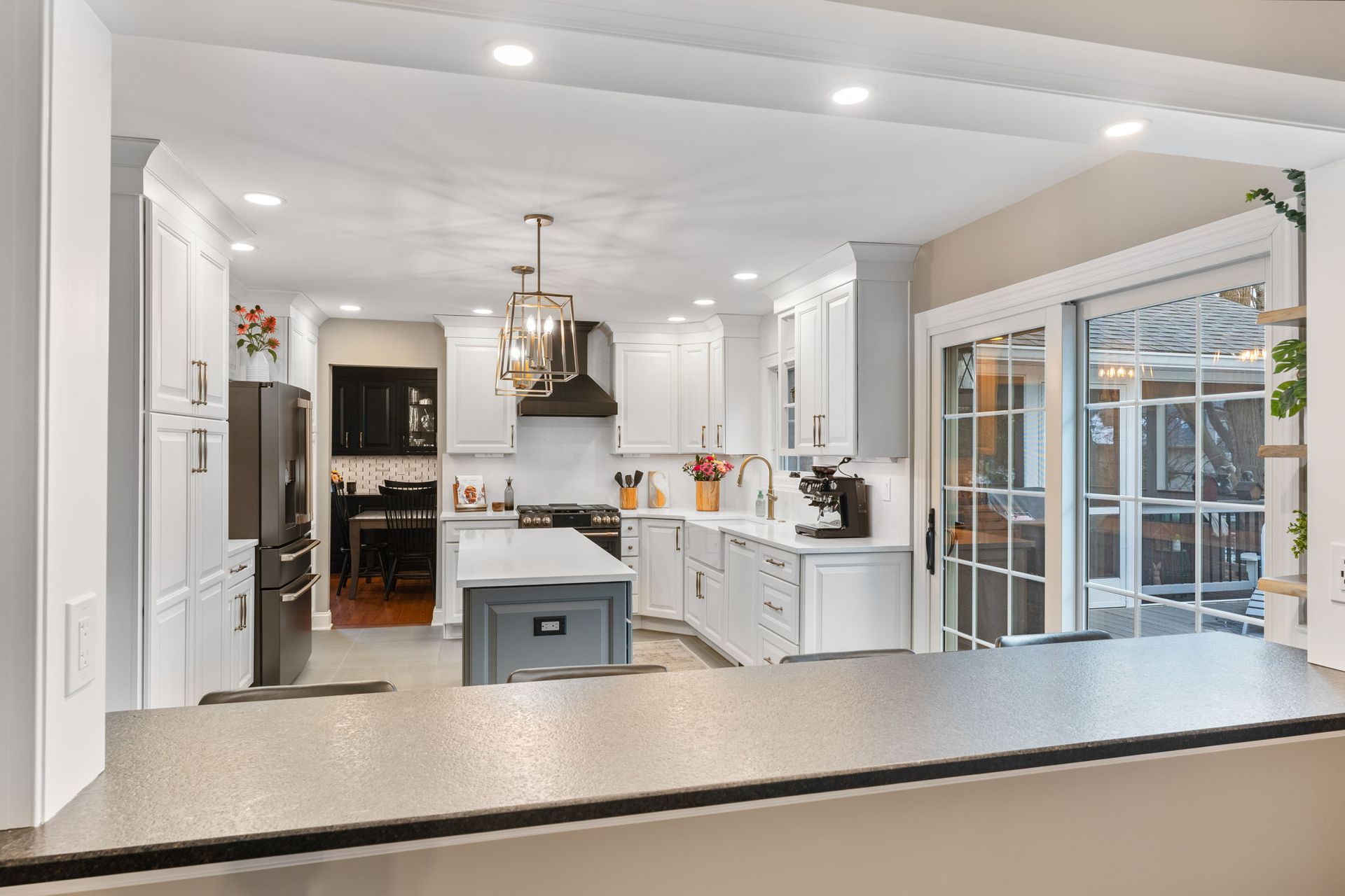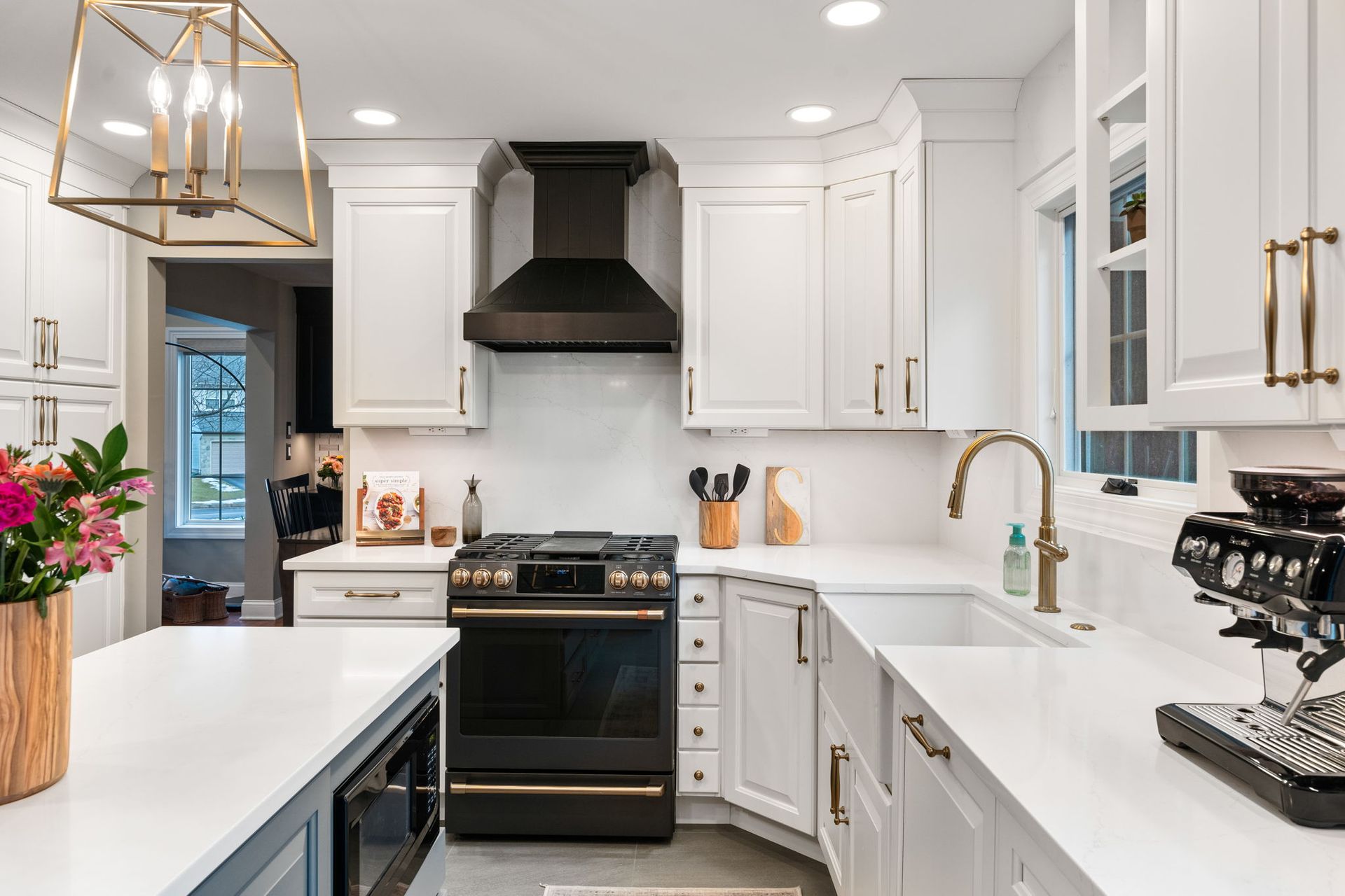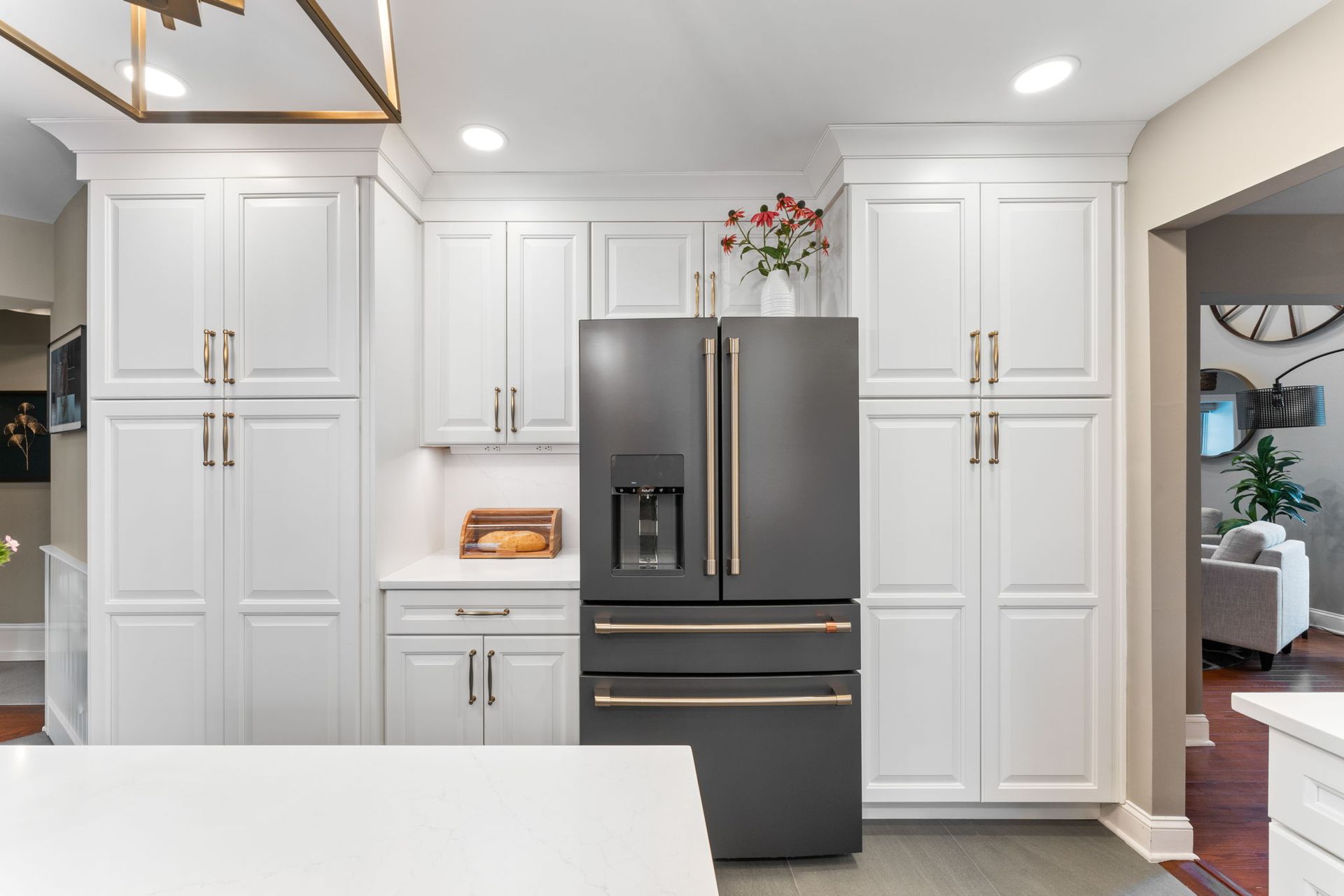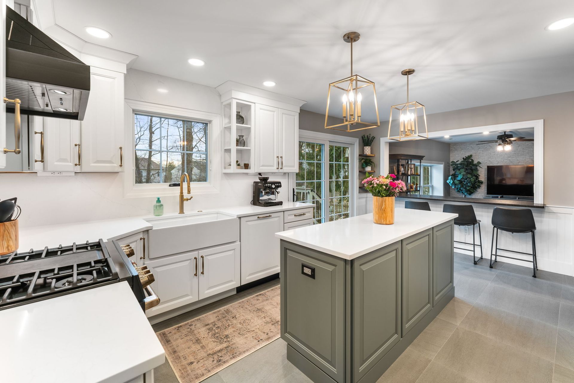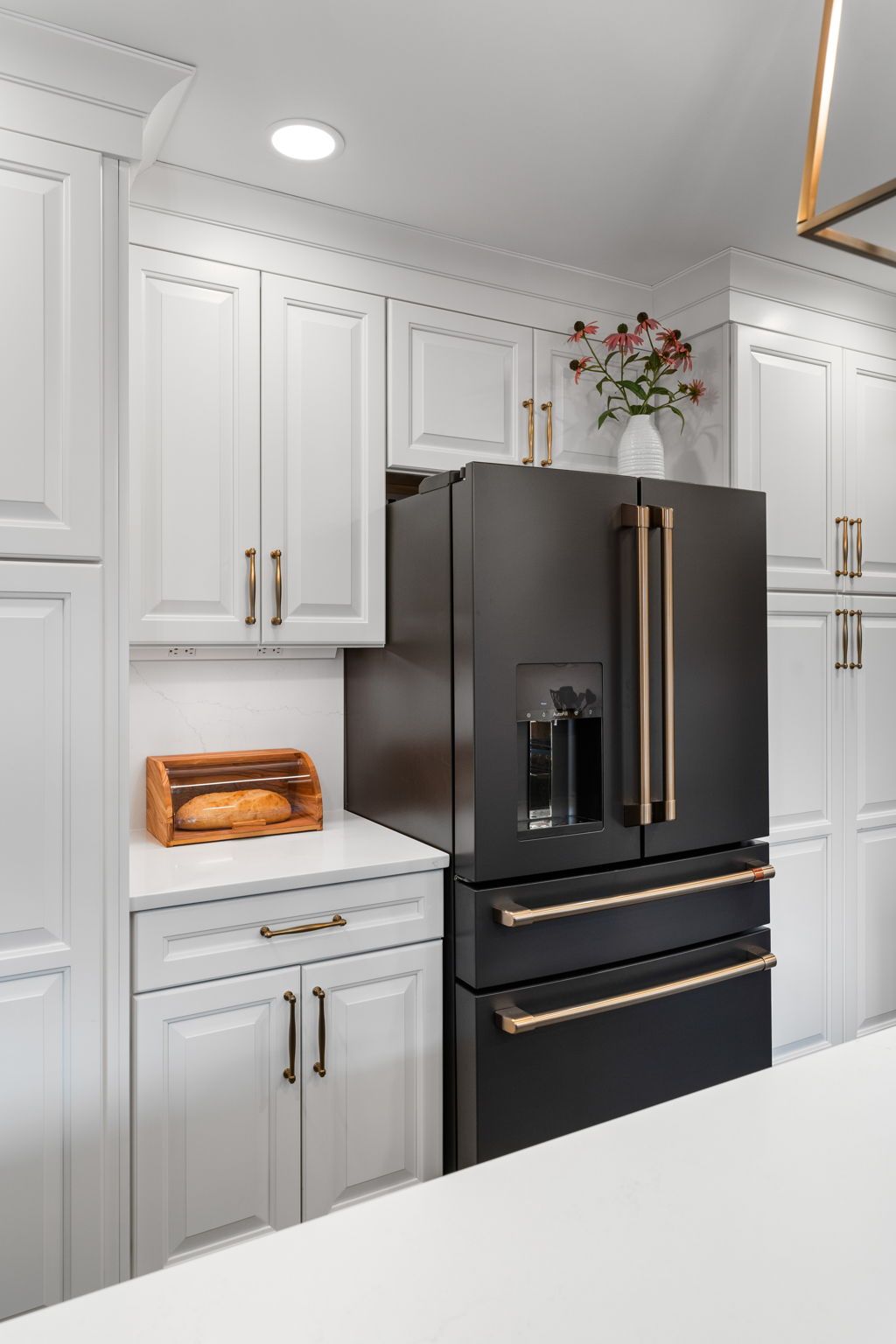 This kitchen is modern and on trend, mixing white cabinets with a gray island, and using darker appliances for contrast. The cabinets are all Wellborn, white cabinets surrounding and the island is painted willow (it's closest to the rightmost photo in the first row, the bluish look is due to lighting and editing). The floor is tile, Happy Floors kursaal slate, a nice neutral match for the island. The countertop and backsplash are quartz, calacatta sonata, it has a subtle veining pattern on it and brings a bit of luxury when combined with the brass hardware and accents. The lighting includes pendants, high hats, and under-cabinet LEDs. This kitchen includes a drawer microwave in the island and a black metal range. We also did the cabinets in their dining room which you can see in the corner of the first photo, those details are in the miscellaneous gallery.