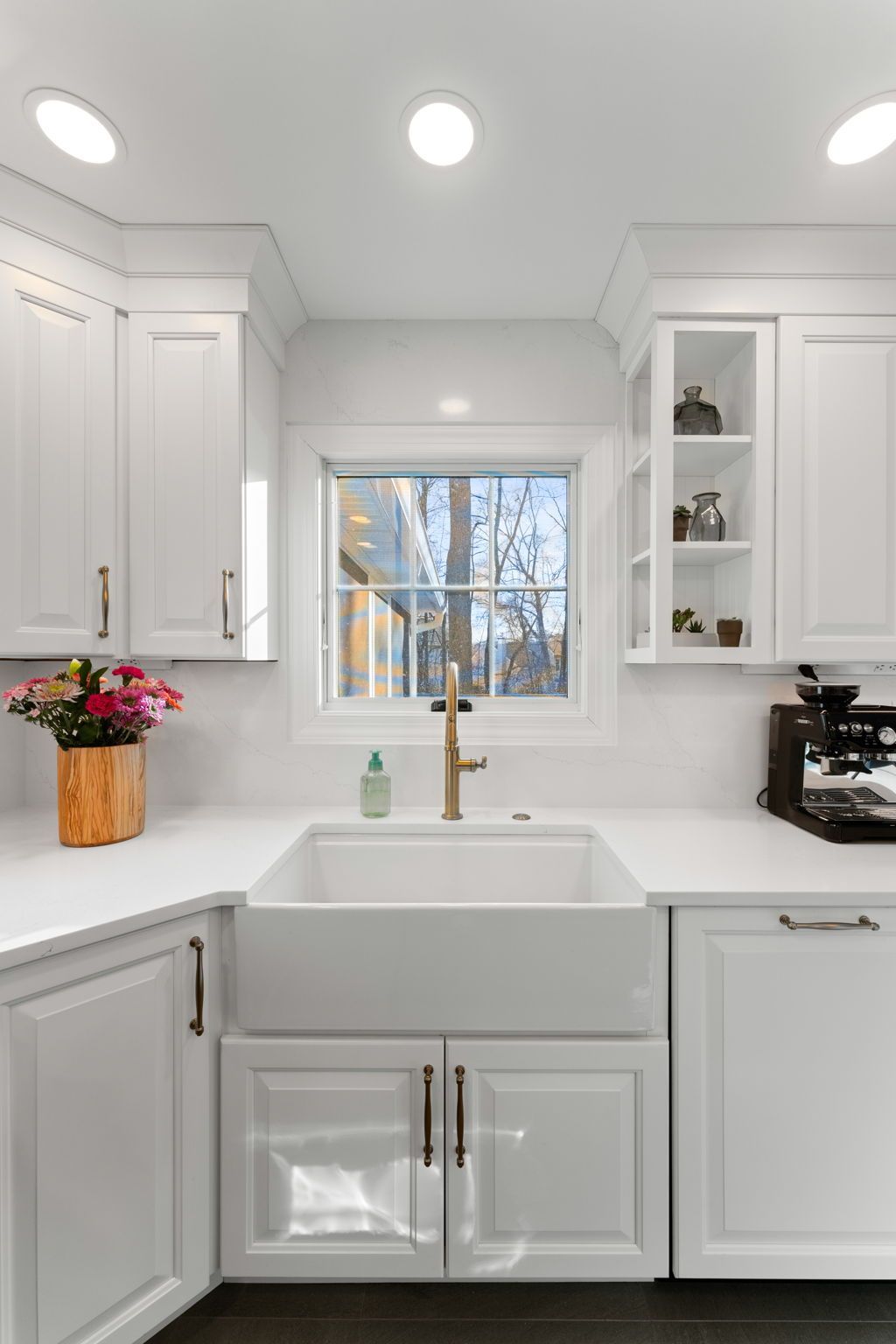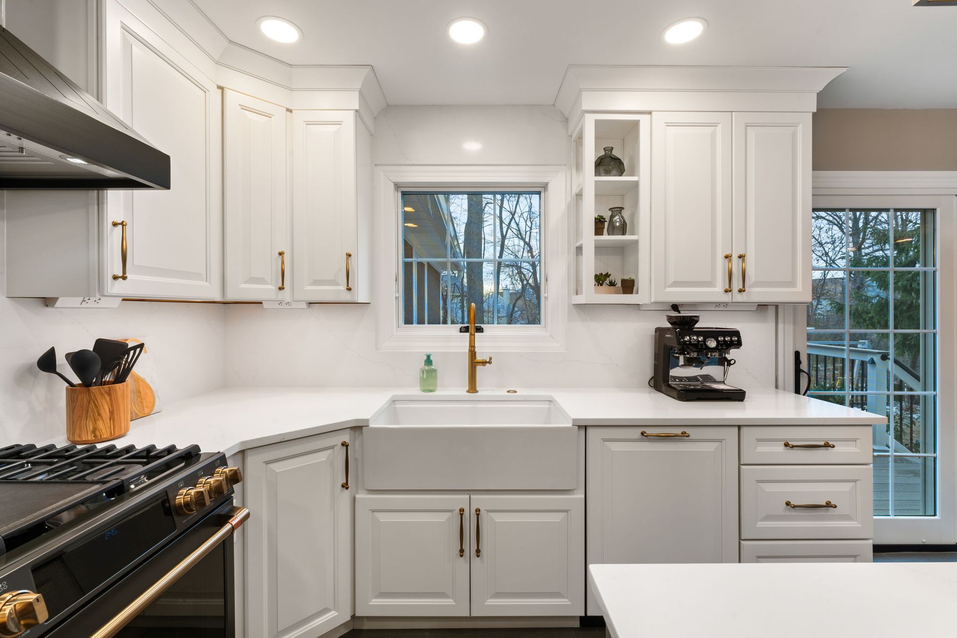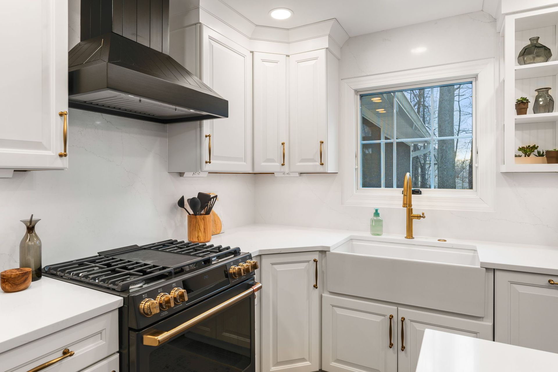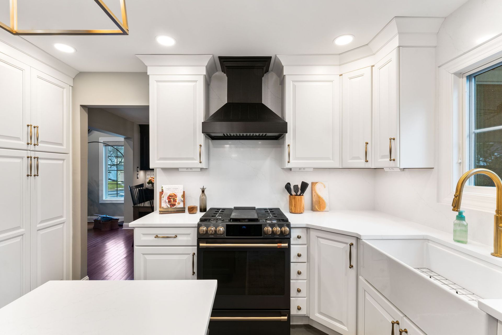 This kitchen is modern and on trend, mixing white cabinets with a gray island, and using darker appliances for contrast. The cabinets are all Wellborn, white cabinets surrounding and the island is painted willow (it's closest to the rightmost photo in the first row, the bluish look is due to lighting and editing). The floor is tile, Happy Floors kursaal slate, a nice neutral match for the island. The countertop and backsplash are quartz, calacatta sonata, it has a subtle veining pattern on it and brings a bit of luxury when combined with the brass hardware and accents. The lighting includes pendants, high hats, and under-cabinet LEDs. This kitchen includes a drawer microwave in the island and a black metal range. We also did the cabinets in their dining room which you can see in the corner of the first photo, those details are in the miscellaneous gallery.