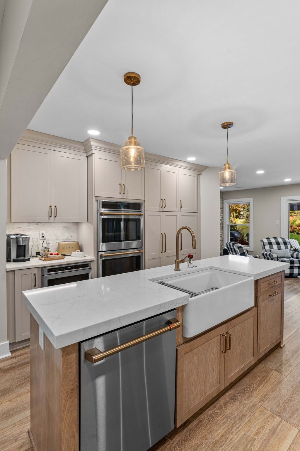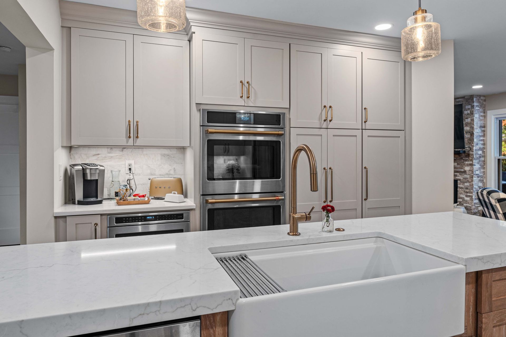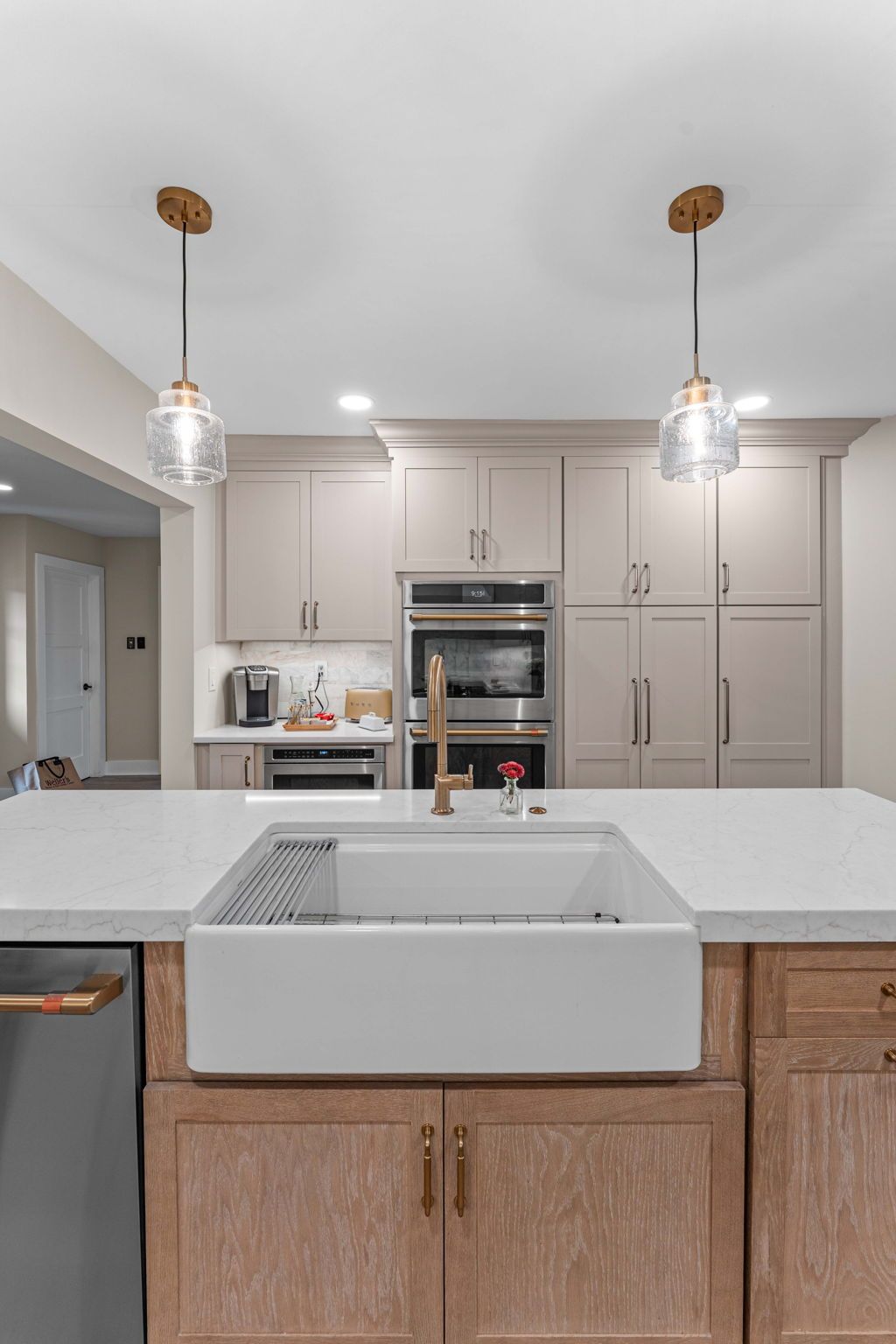 This gorgeous kitchen was built with materials purchased through Weiler's and assembled with the client's own contractor. The mix of warm painted and wood tones combined with brass hardware gives this space an elegant feminine aesthetic. The cabinets are Omega, the painted are maple wood in the shade magnolia, and the stained cabinets which make up the island, bar area, and apron of the range hood are oak natural ceruse. The counter and backsplash are both from MSI, the counter is quartz in the style calacatta miraggio, this client chose to go with an extra thick slab for their island and normal width for the surrounding counters. The backsplash is made up of a few different tiles, arabescato venato honey for the subway-style section, and elegante pinwheel gold outlined by arabescato cararra pencil for the decoration above the stove. Lighting includes pendants, high hats, and under counter LEDS. The sink is a Bocci farm sink with accessories like the drying rack that sit on a small inner ledge. Other features in this kitchen include a drawer style microwave, and a beverage fridge in the bar/dining area.