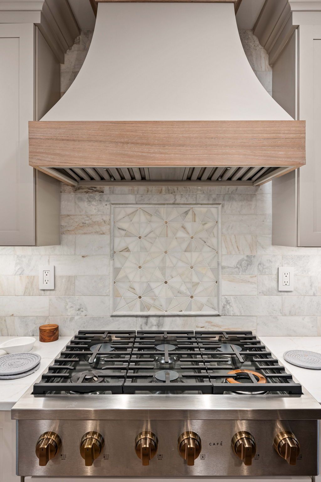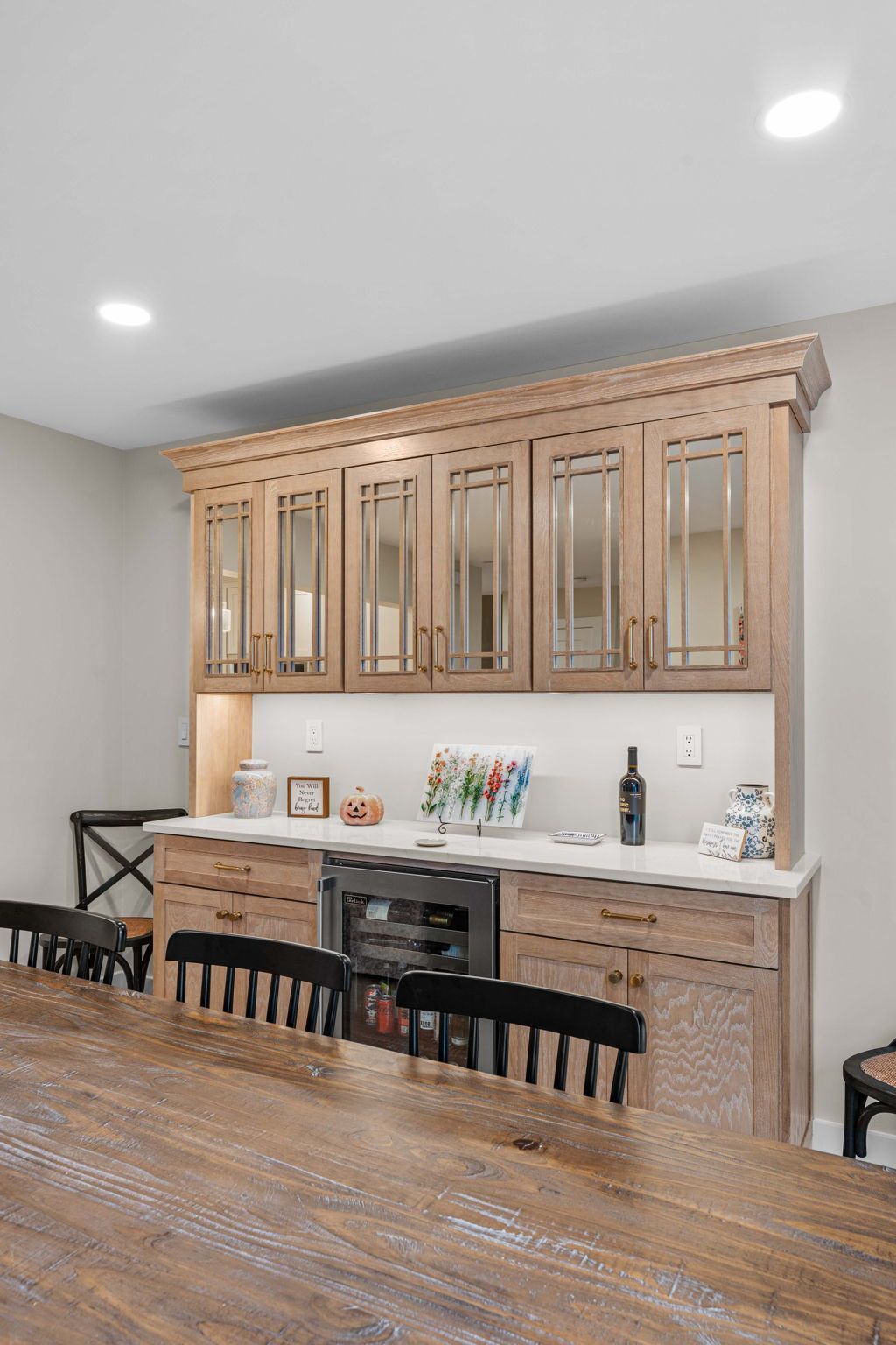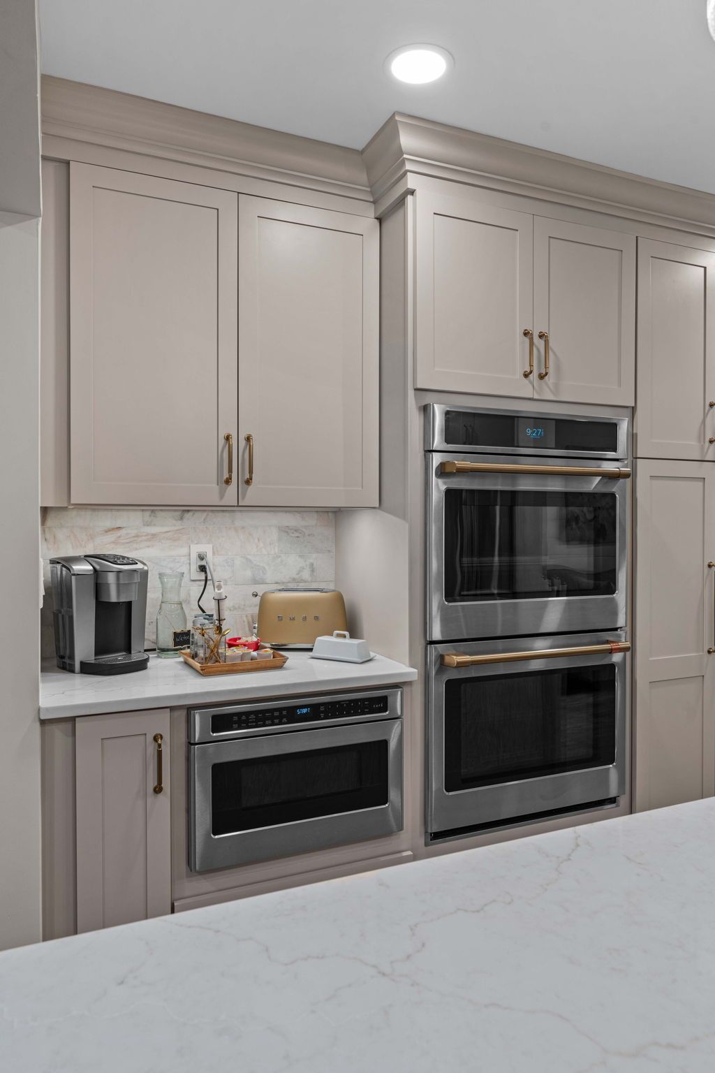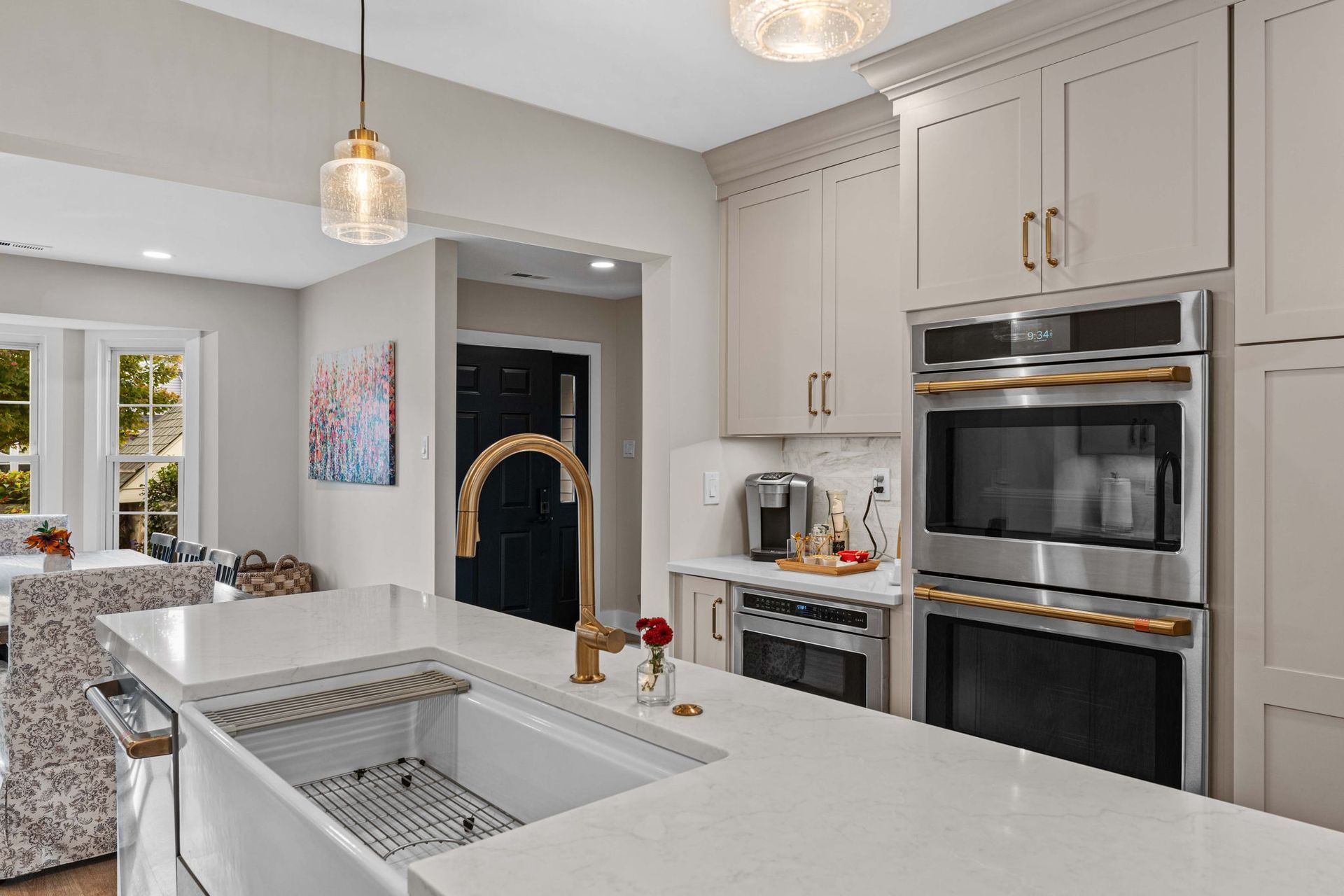 This gorgeous kitchen was built with materials purchased through Weiler's and assembled with the client's own contractor. The mix of warm painted and wood tones combined with brass hardware gives this space an elegant feminine aesthetic. The cabinets are Omega, the painted are maple wood in the shade magnolia, and the stained cabinets which make up the island, bar area, and apron of the range hood are oak natural ceruse. The counter and backsplash are both from MSI, the counter is quartz in the style calacatta miraggio, this client chose to go with an extra thick slab for their island and normal width for the surrounding counters. The backsplash is made up of a few different tiles, arabescato venato honey for the subway-style section, and elegante pinwheel gold outlined by arabescato cararra pencil for the decoration above the stove. Lighting includes pendants, high hats, and under counter LEDS. The sink is a Bocci farm sink with accessories like the drying rack that sit on a small inner ledge. Other features in this kitchen include a drawer style microwave, and a beverage fridge in the bar/dining area.