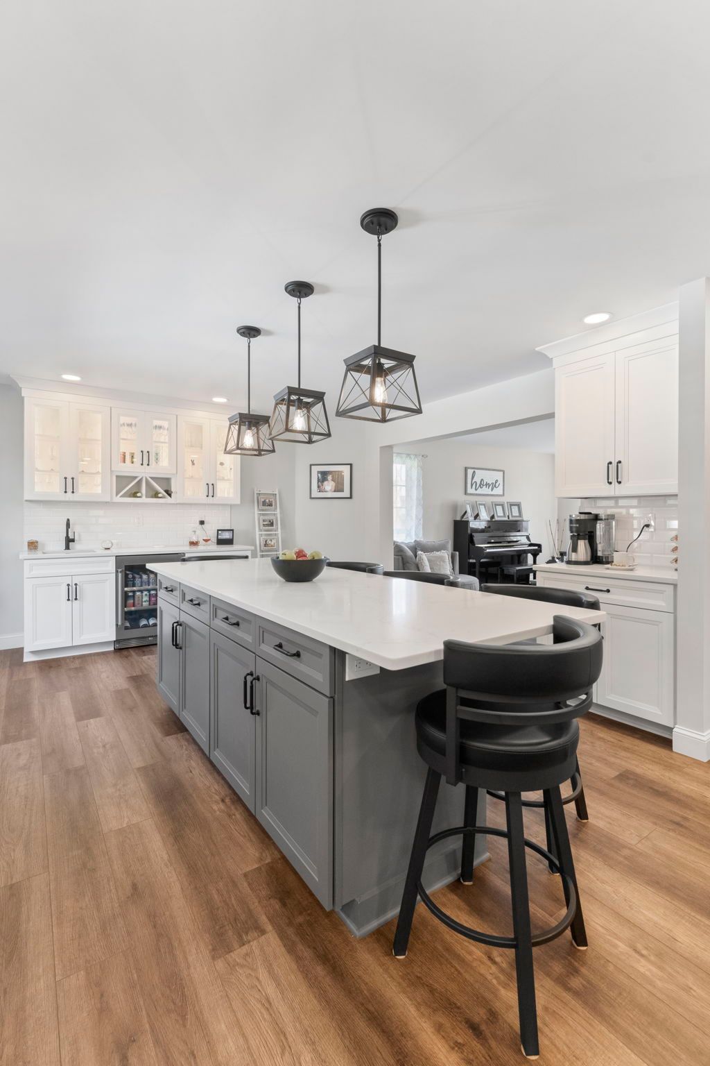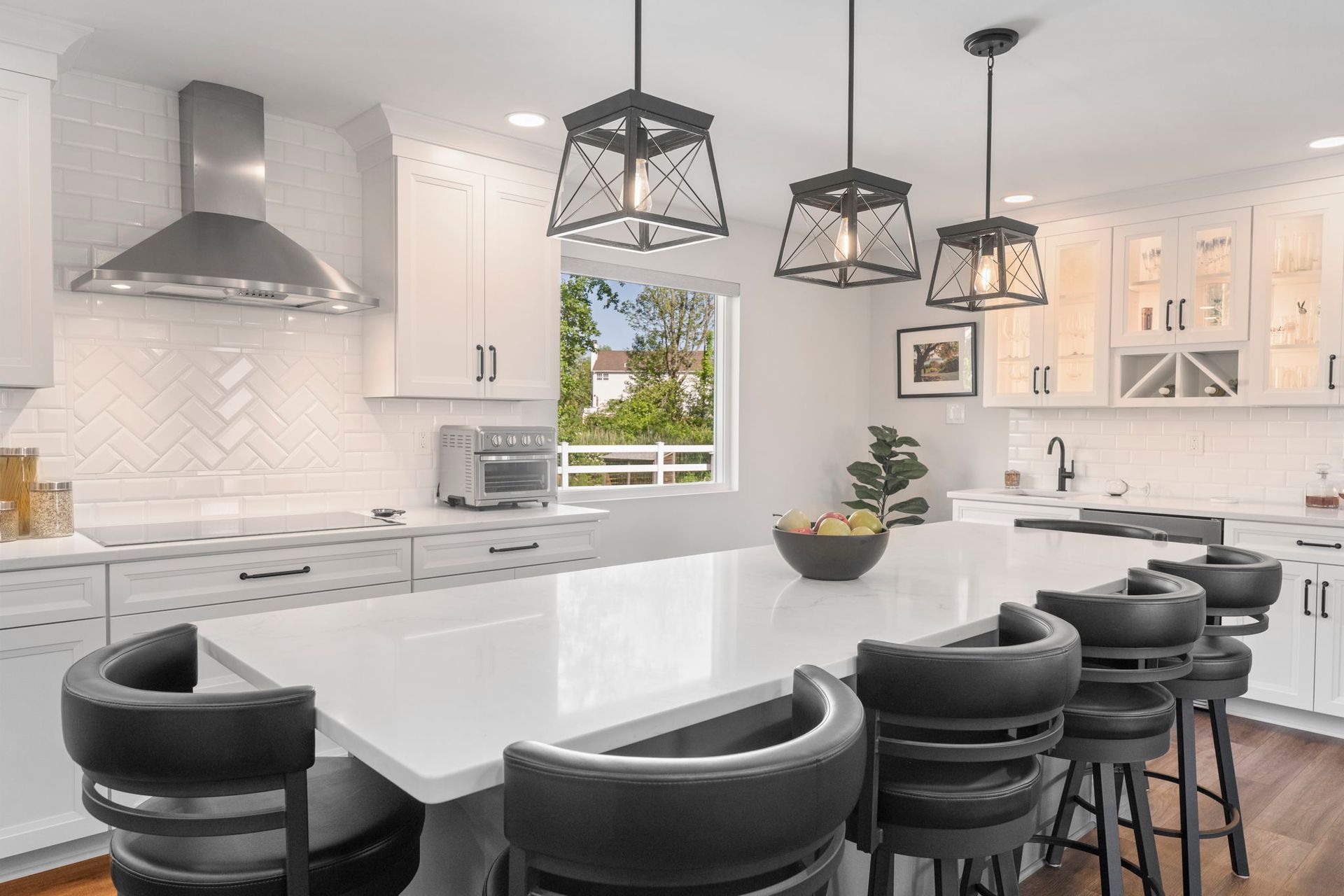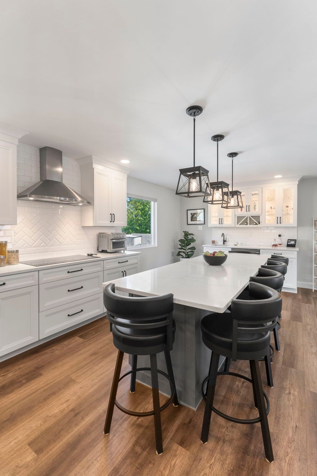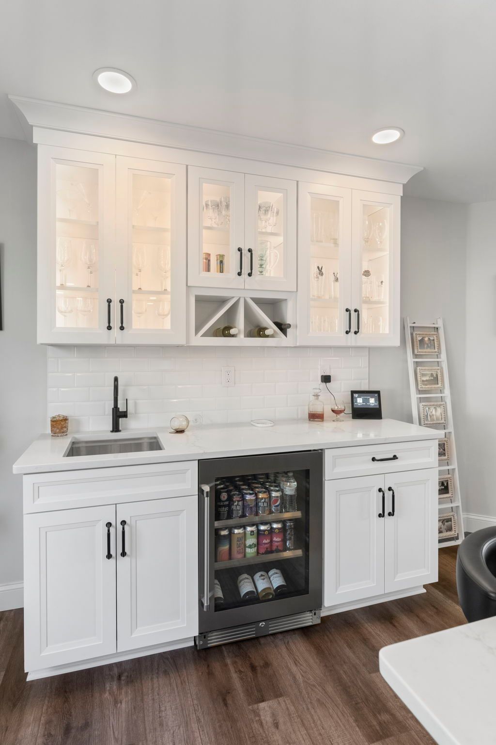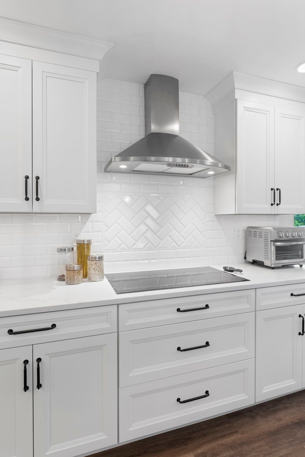 This contemporary kitchen combines stark white cabinetry, countertop, and backsplash with a darker island. The cabinets are Waypoint in linen including some glass transom cabinets in the bar area, and the island is Waypoint in boulder. The backsplash is Bevel Bright White Ice, done in a subway style around most of the kitchen except beneath the range, where it is done in a herringbone style to draw the focus. Black pendants and barstools match black cabinet pulls, contrasting nicely against the white majority. The countertop is Calacatta Primo quartz, which has light grey veins running throughout. The bar contains a minifridge and lighting within glass cabinets for an elegant look.
