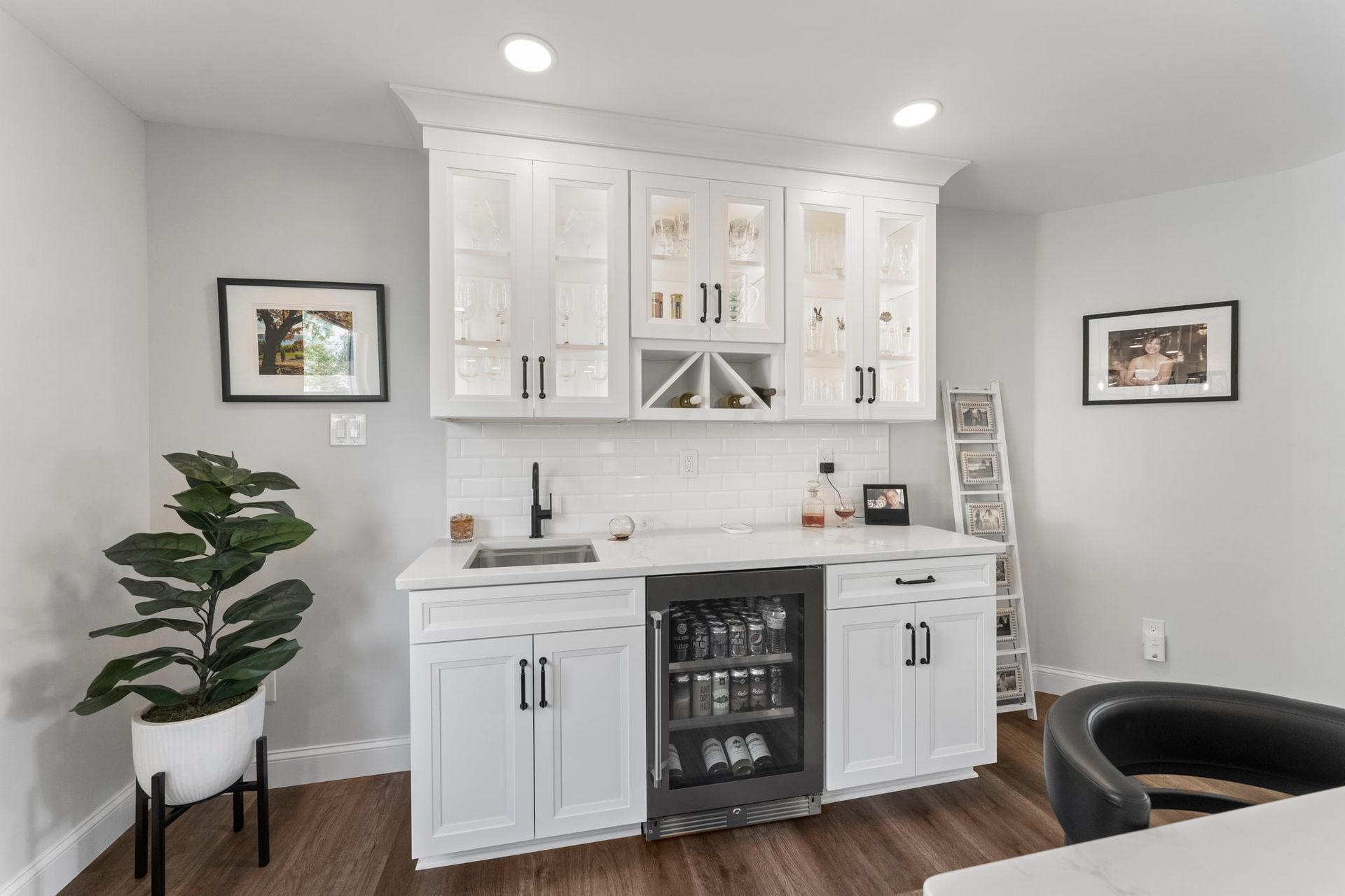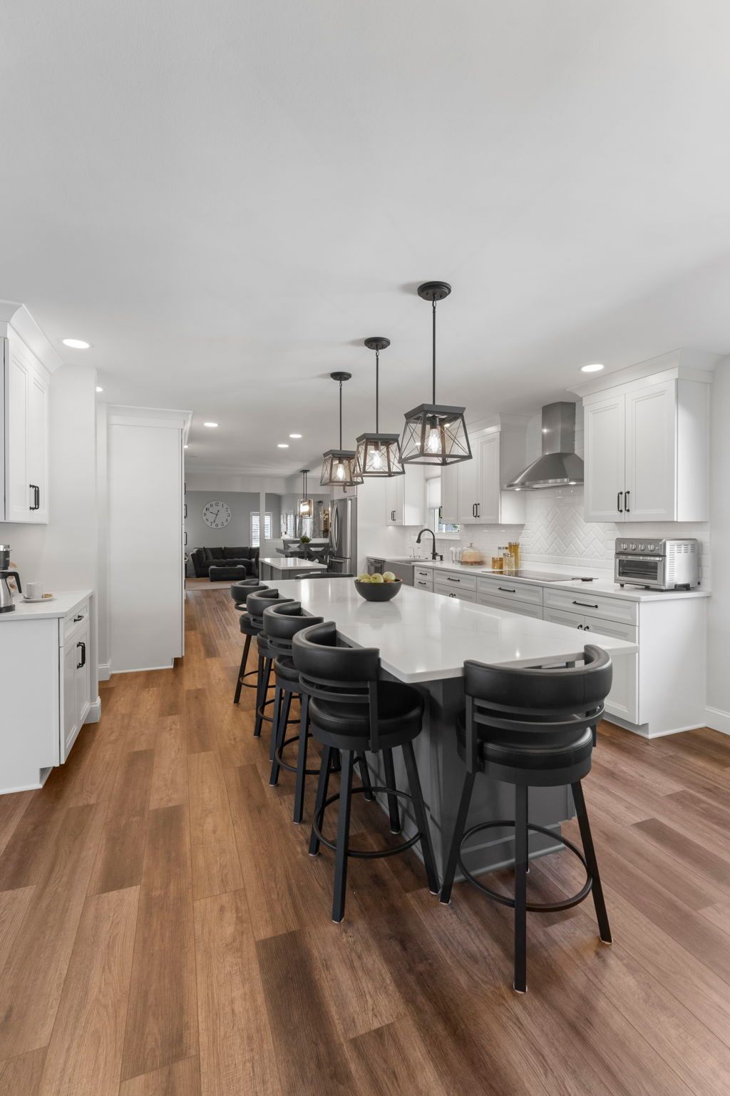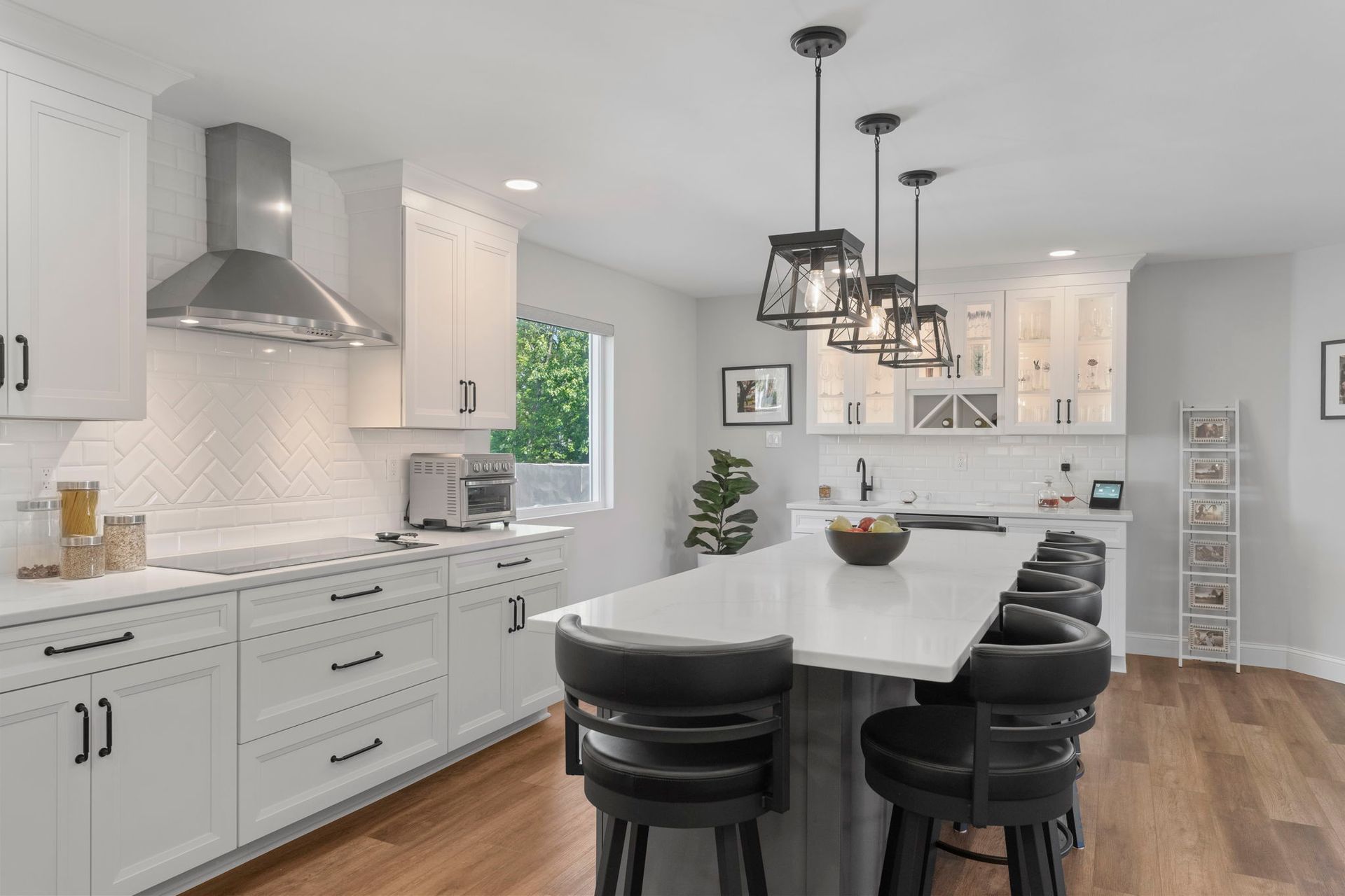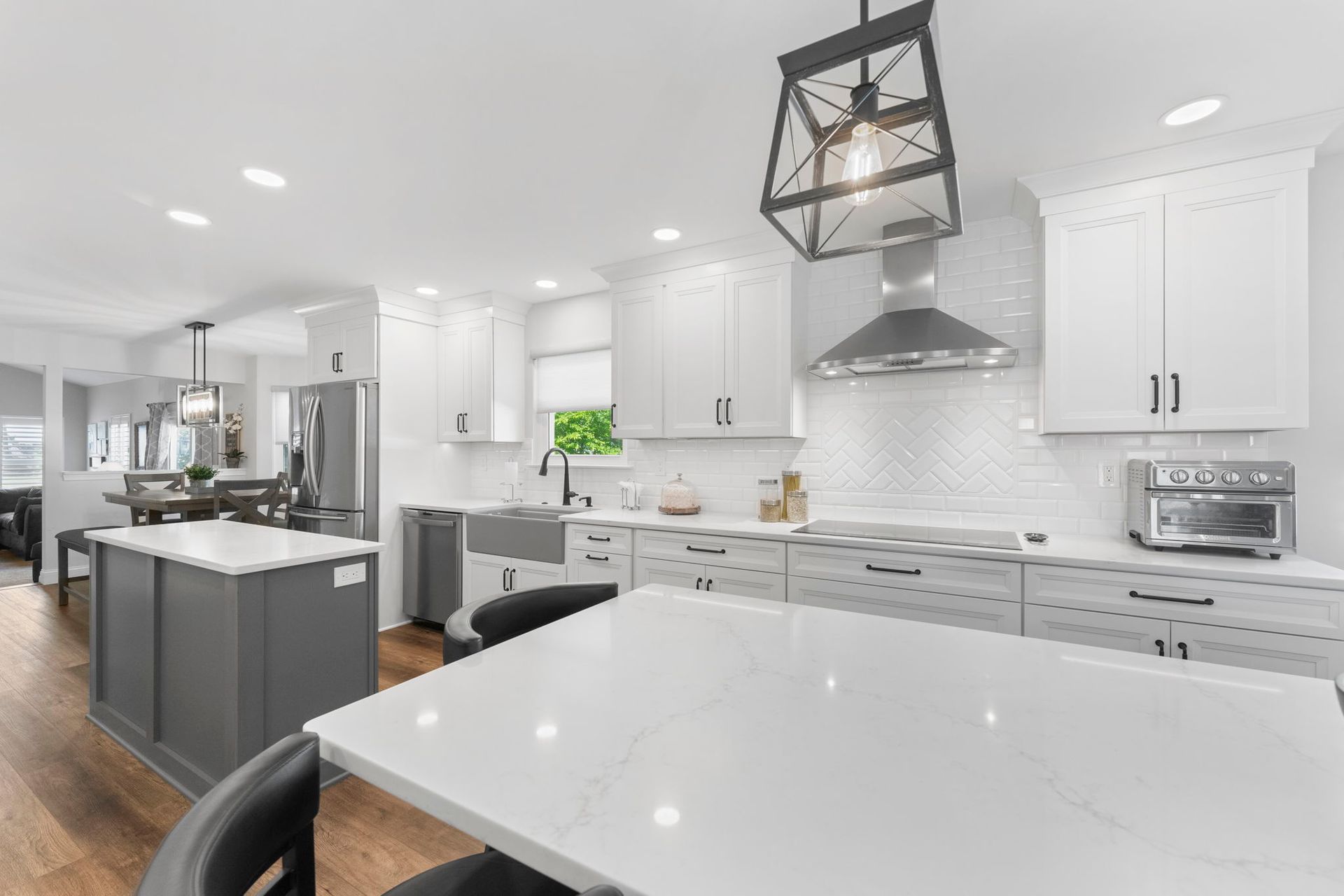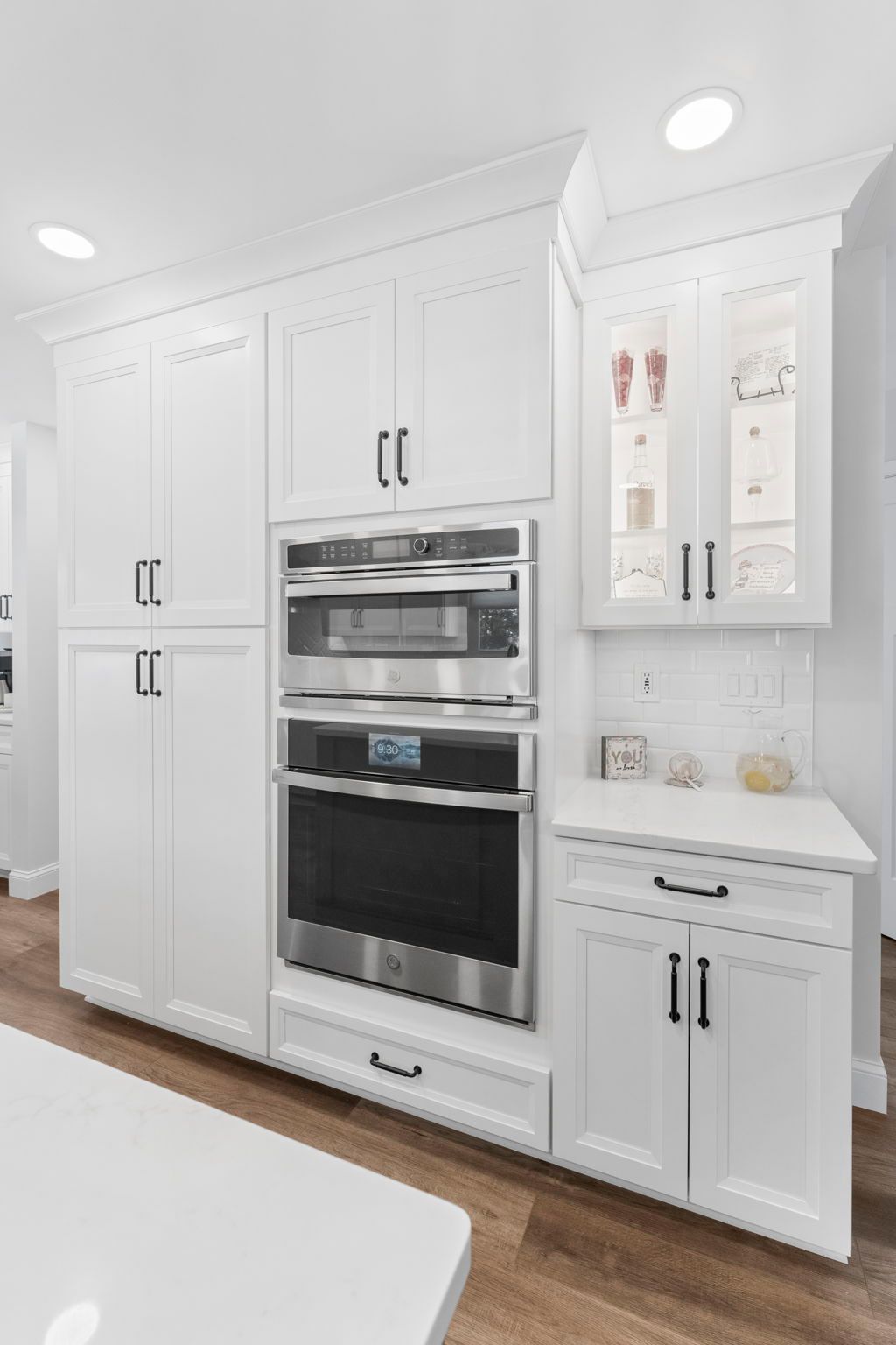 This contemporary kitchen combines stark white cabinetry, countertop, and backsplash with a darker island. The cabinets are Waypoint in linen including some glass transom cabinets in the bar area, and the island is Waypoint in boulder. The backsplash is Bevel Bright White Ice, done in a subway style around most of the kitchen except beneath the range, where it is done in a herringbone style to draw the focus. Black pendants and barstools match black cabinet pulls, contrasting nicely against the white majority. The countertop is Calacatta Primo quartz, which has light grey veins running throughout. The bar contains a minifridge and lighting within glass cabinets for an elegant look.