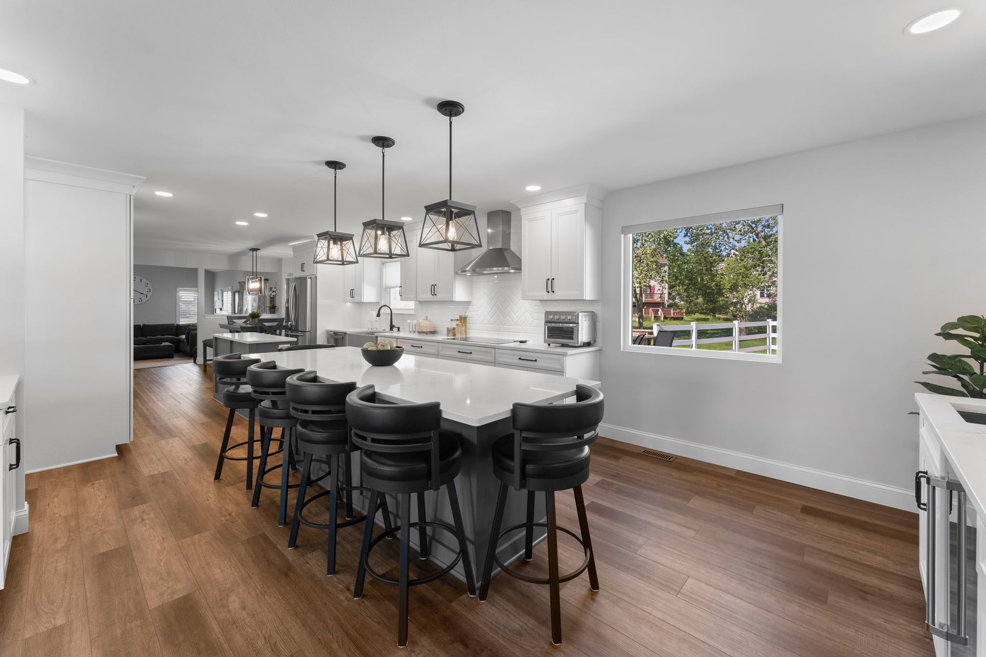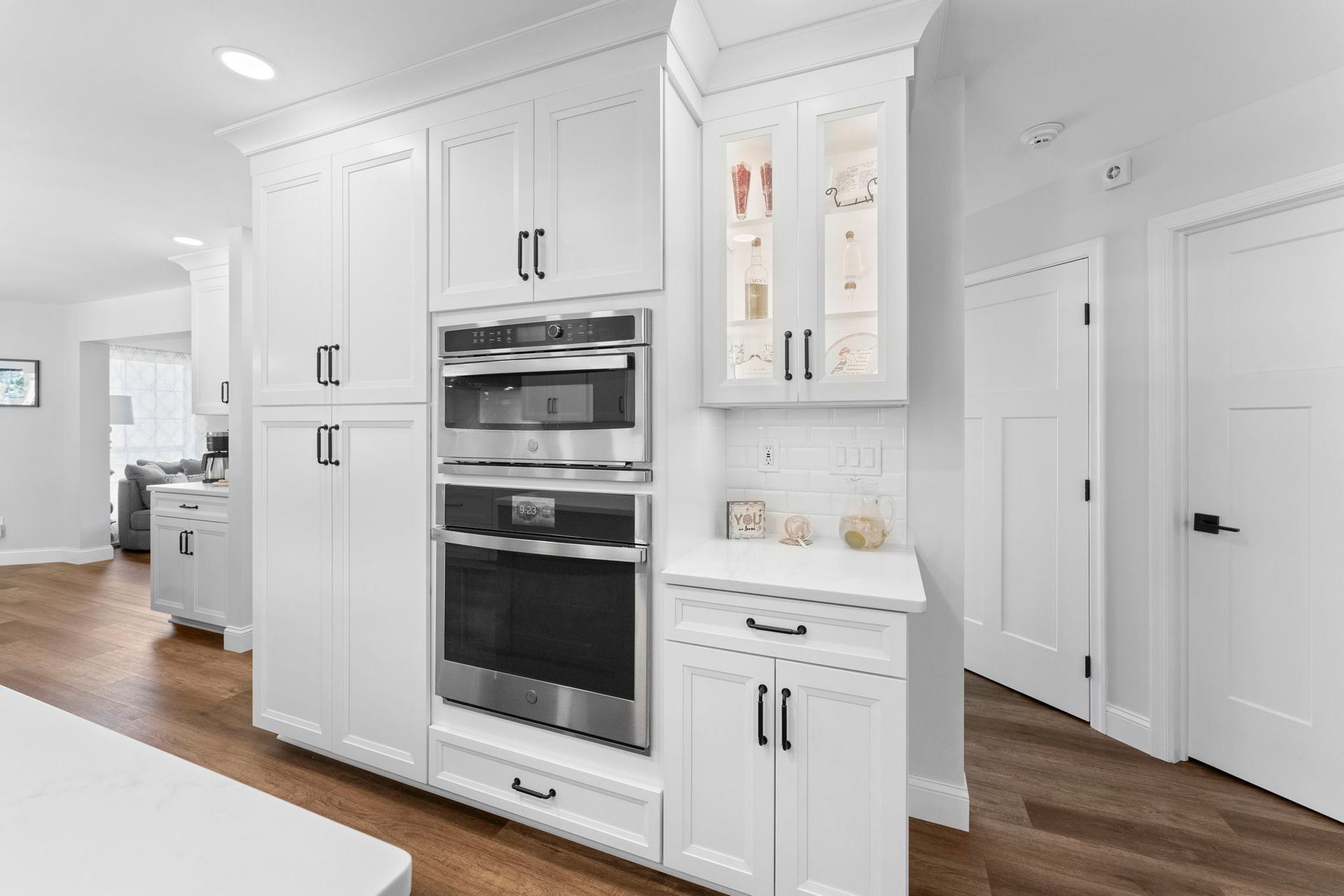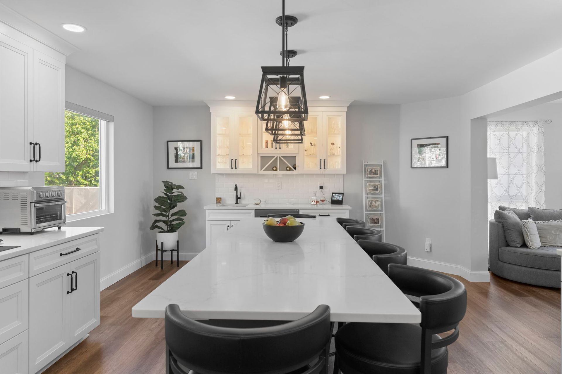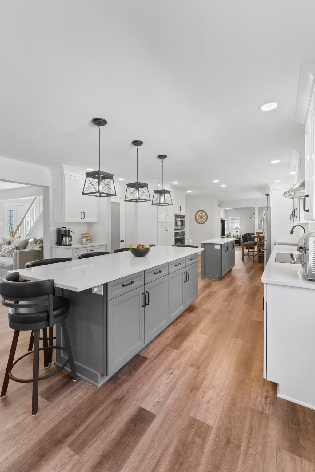 This contemporary kitchen combines stark white cabinetry, countertop, and backsplash with a darker island. The cabinets are Waypoint in linen including some glass transom cabinets in the bar area, and the island is Waypoint in boulder. The backsplash is Bevel Bright White Ice, done in a subway style around most of the kitchen except beneath the range, where it is done in a herringbone style to draw the focus. Black pendants and barstools match black cabinet pulls, contrasting nicely against the white majority. The countertop is Calacatta Primo quartz, which has light grey veins running throughout. The bar contains a minifridge and lighting within glass cabinets for an elegant look.