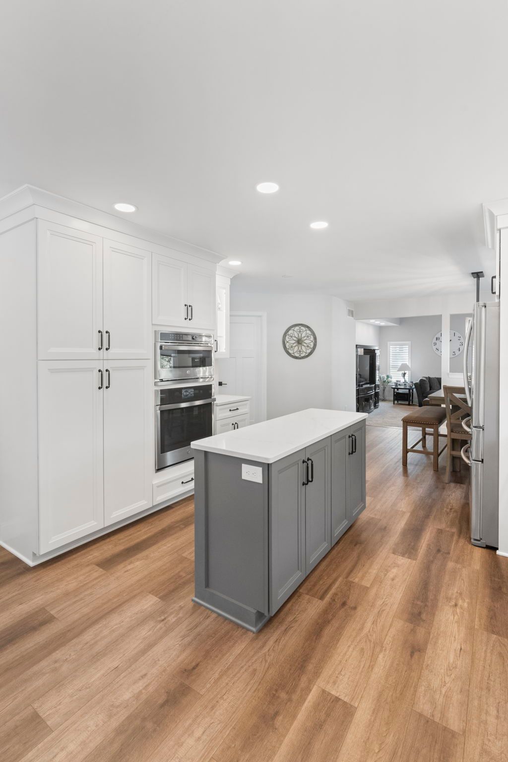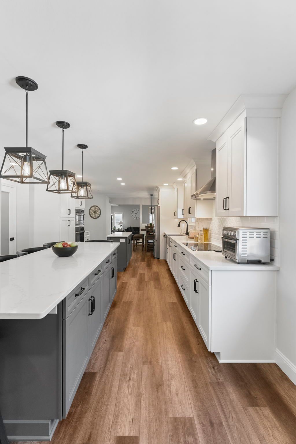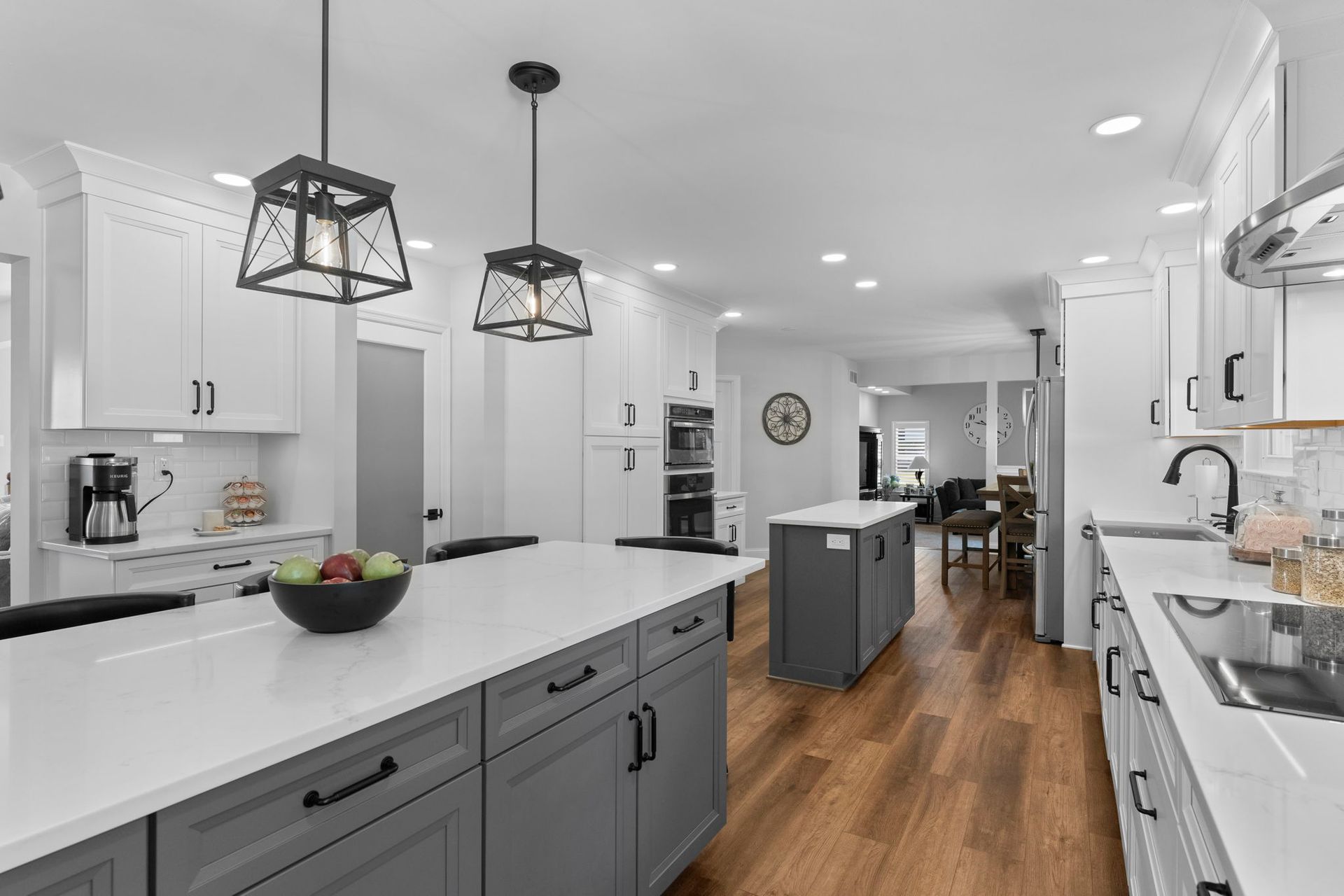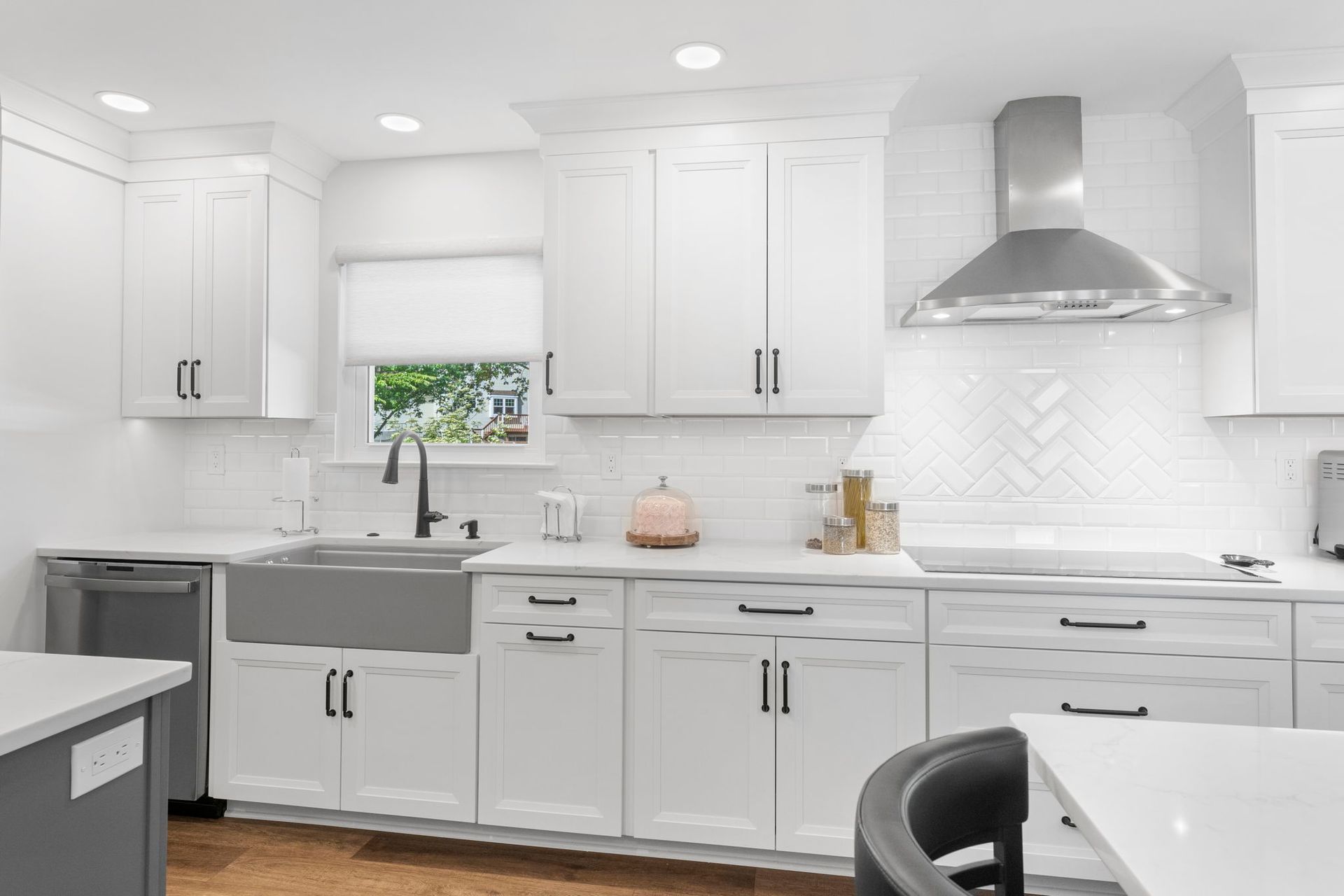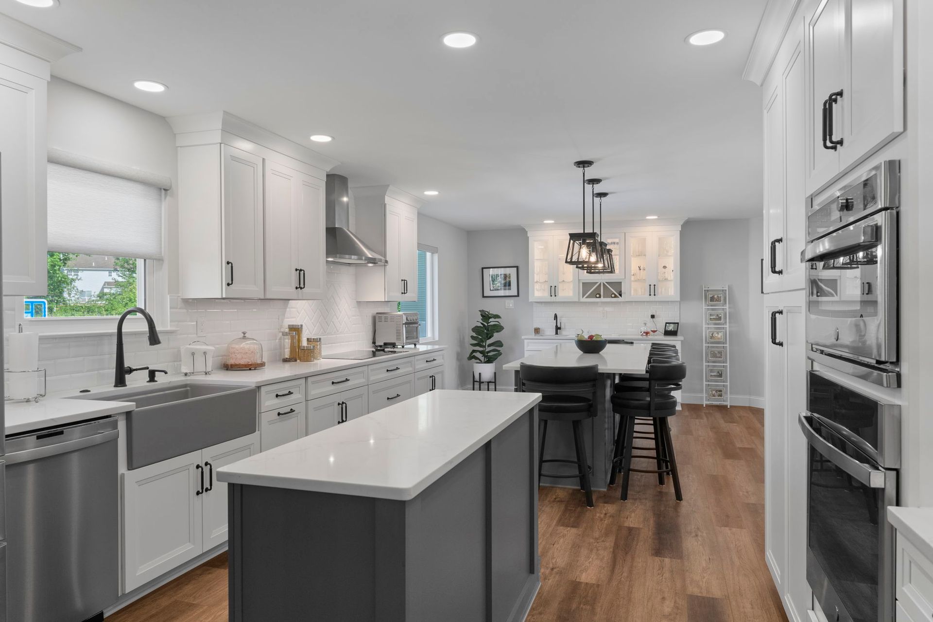 This contemporary kitchen combines stark white cabinetry, countertop, and backsplash with a darker island. The cabinets are Waypoint in linen including some glass transom cabinets in the bar area, and the island is Waypoint in boulder. The backsplash is Bevel Bright White Ice, done in a subway style around most of the kitchen except beneath the range, where it is done in a herringbone style to draw the focus. Black pendants and barstools match black cabinet pulls, contrasting nicely against the white majority. The countertop is Calacatta Primo quartz, which has light grey veins running throughout. The bar contains a minifridge and lighting within glass cabinets for an elegant look.