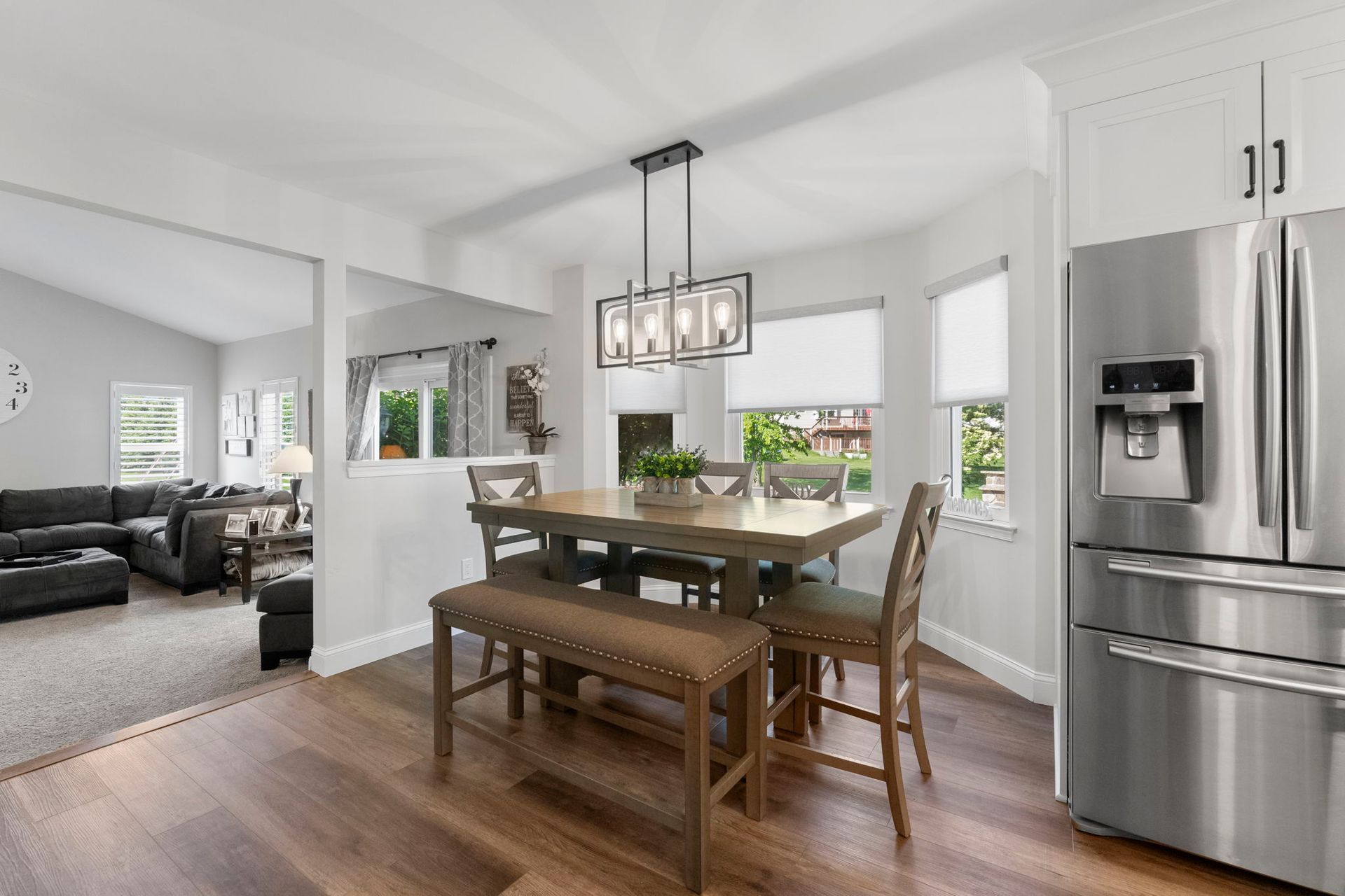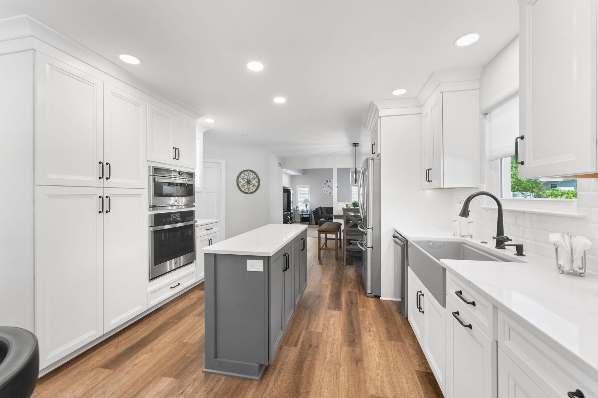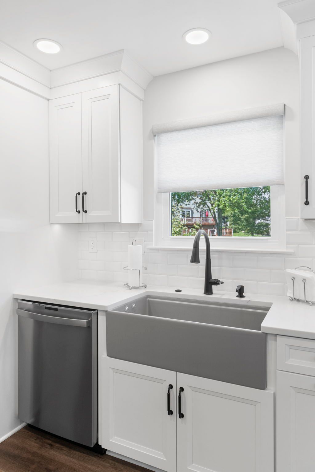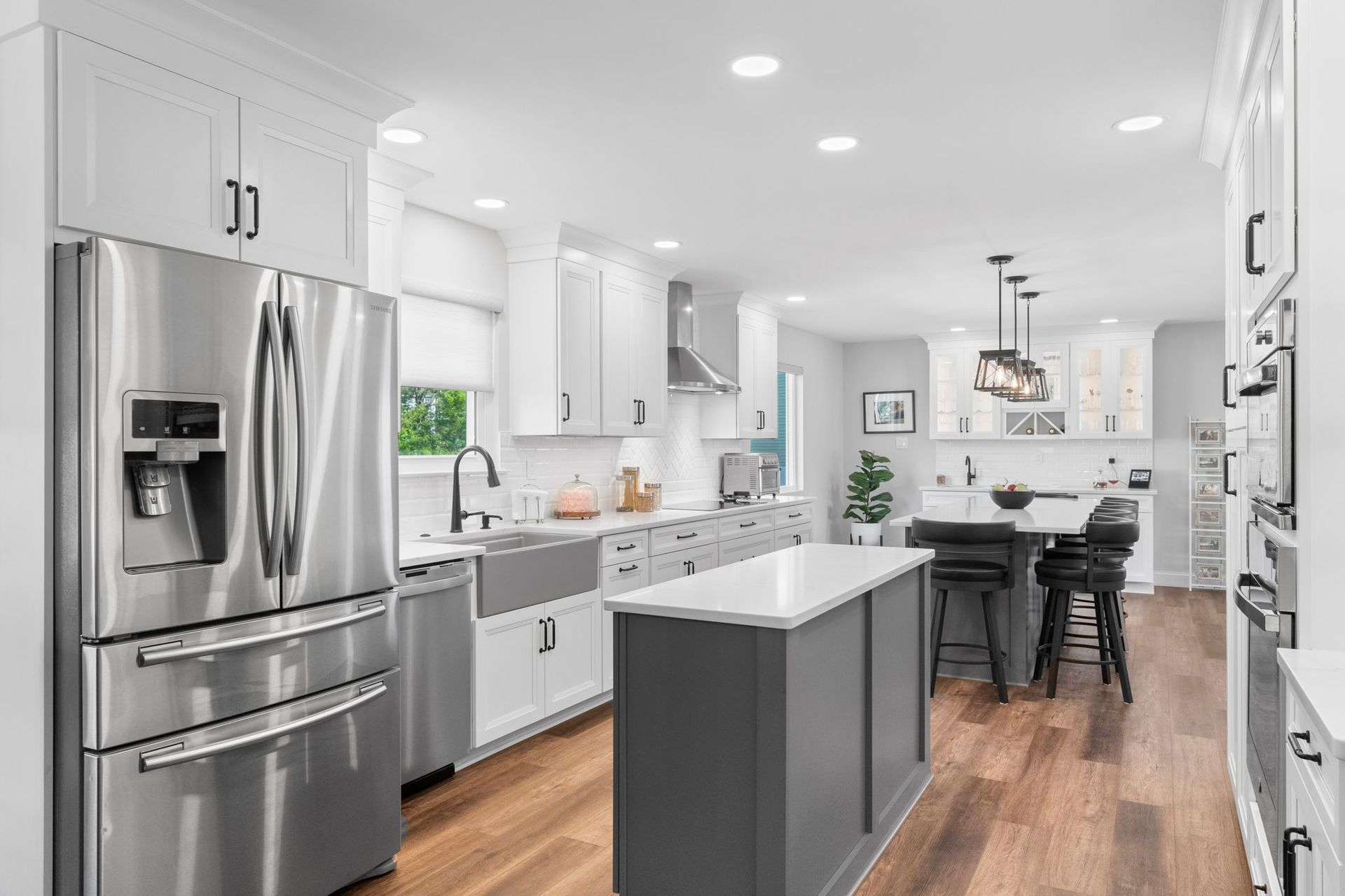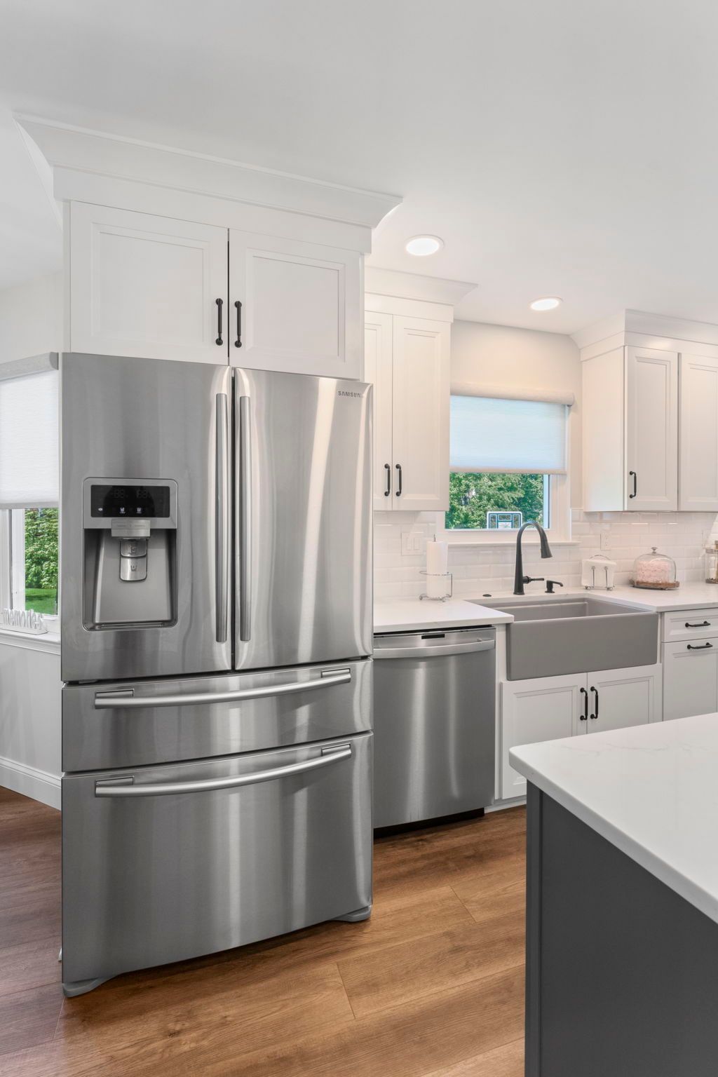 This contemporary kitchen combines stark white cabinetry, countertop, and backsplash with a darker island. The cabinets are Waypoint in linen including some glass transom cabinets in the bar area, and the island is Waypoint in boulder. The backsplash is Bevel Bright White Ice, done in a subway style around most of the kitchen except beneath the range, where it is done in a herringbone style to draw the focus. Black pendants and barstools match black cabinet pulls, contrasting nicely against the white majority. The countertop is Calacatta Primo quartz, which has light grey veins running throughout. The bar contains a minifridge and lighting within glass cabinets for an elegant look.