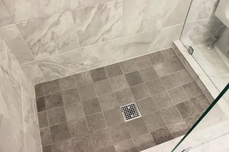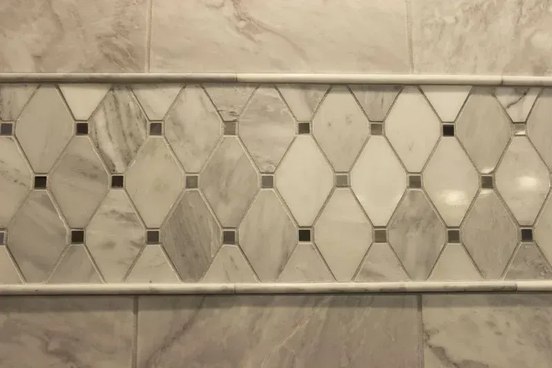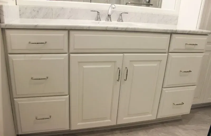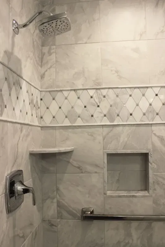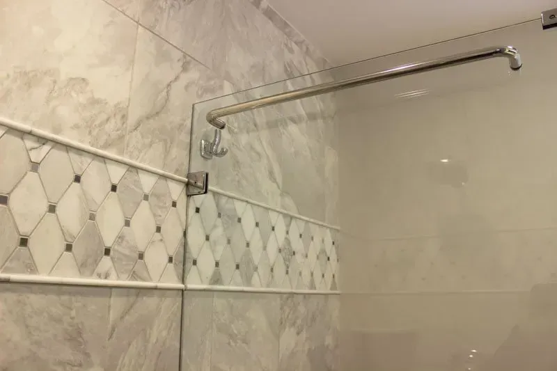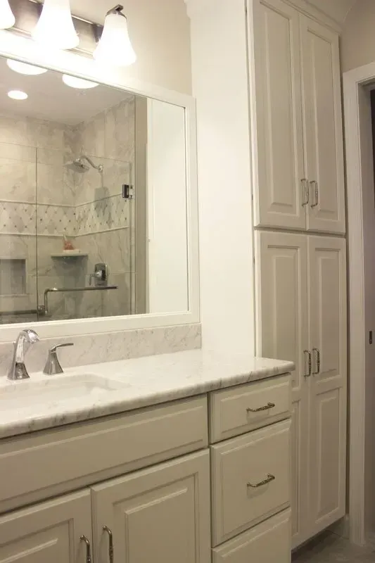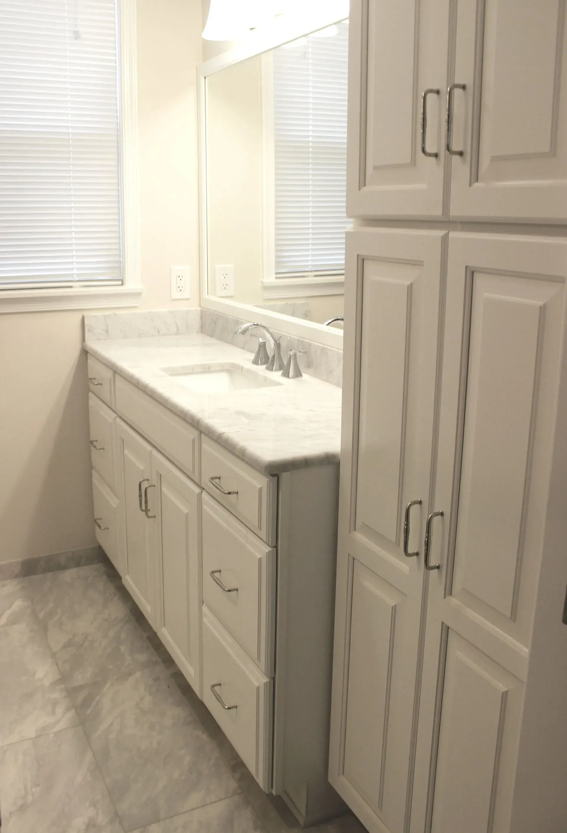 This bathroom in Philadelphia was remodeled with maple wood Waypoint Cabinets in Linen, marble countertops, chrome hardware & faucets, custom glass shower doors and custom tile work.