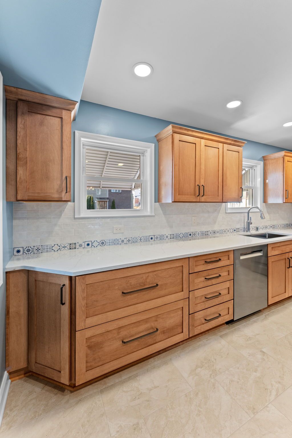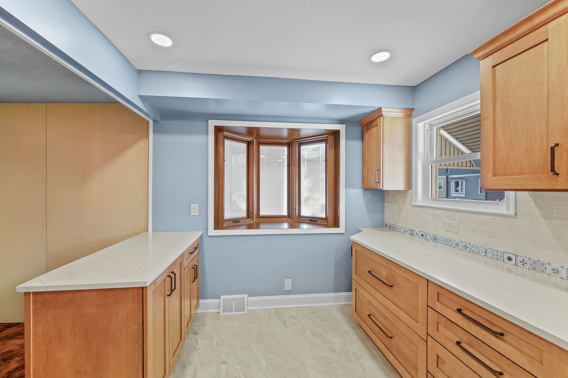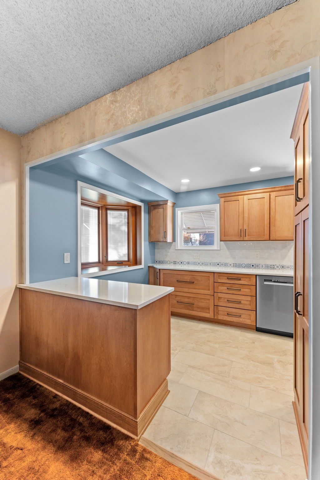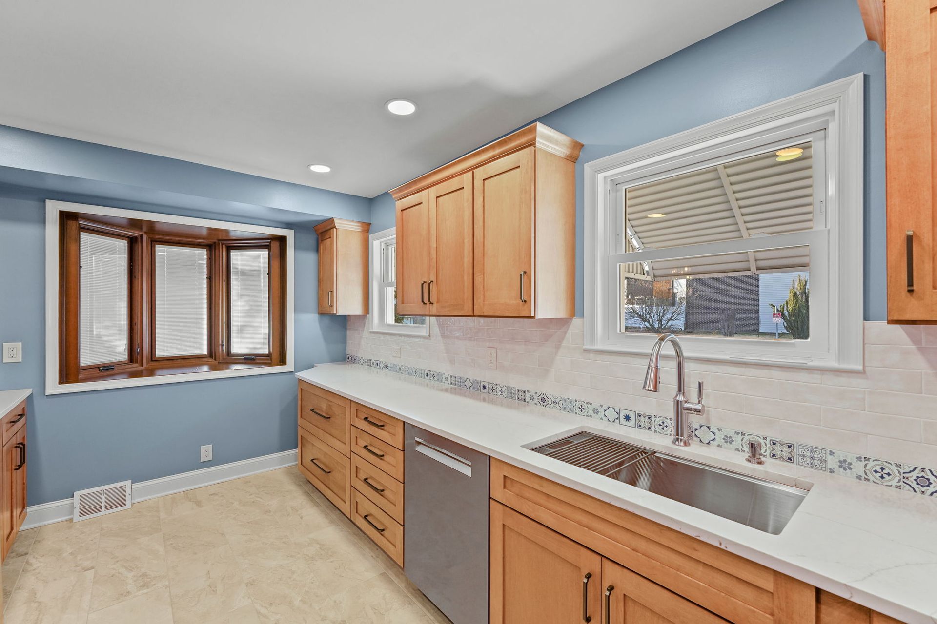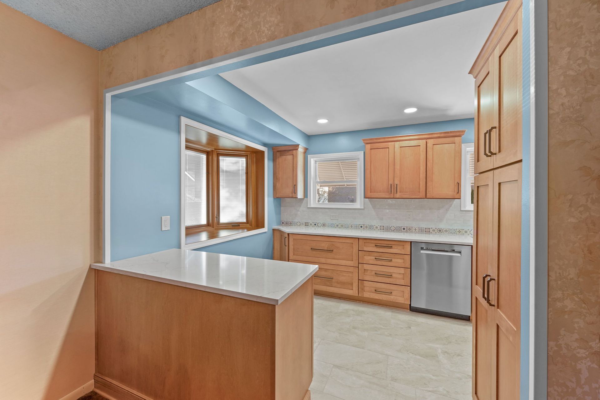 This kitchen incorporates warm wood tones with a cool paint color, bridged by neutral cream tones in their countertop and backsplash. The cabinetry is Wellborn, maple wood in the finish Ginger, and the door style is Prairie. The countertop is Pental quartz in the color Luce Ore, it wraps around most of the kitchen and is on the peninsula by the entrance. The backsplash has a decorative line of Dal Tile Sublimity Mindful Sequence, a nice pop of color that ties the kitchen and the walls together. The remaining backsplash is made of Tile Gallery Soft White Crackle, arranged in the popular subway style. The flooring is Happy Floors, Sonoma Wind, with a marble threshold in the color Pana Chiaro. This kitchen also includes recessed lighting, a steel hood, a soap dispenser, and a Delta farmhouse sink with additions. The client previously installed their bay window and Weiler's did the white molding around it.