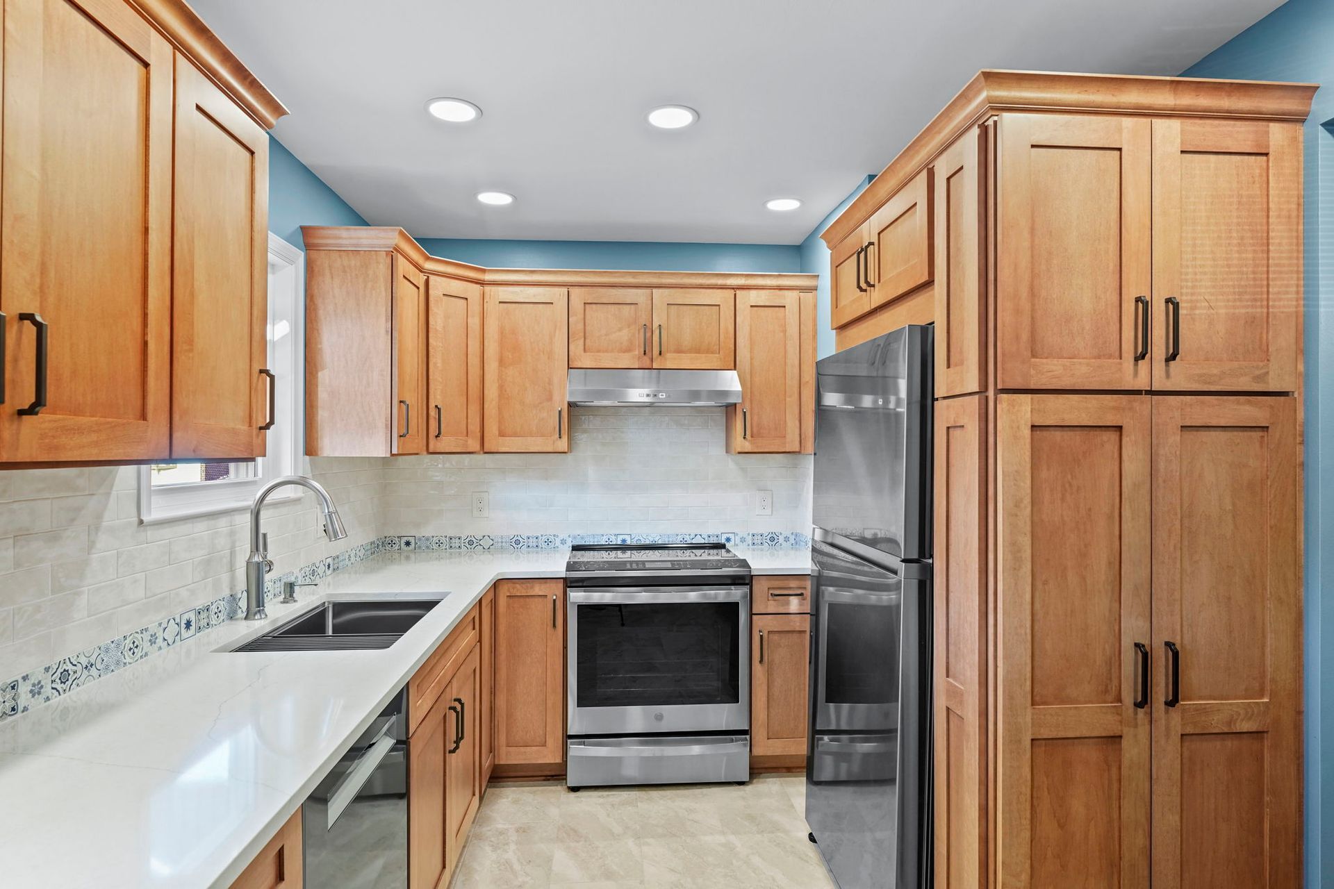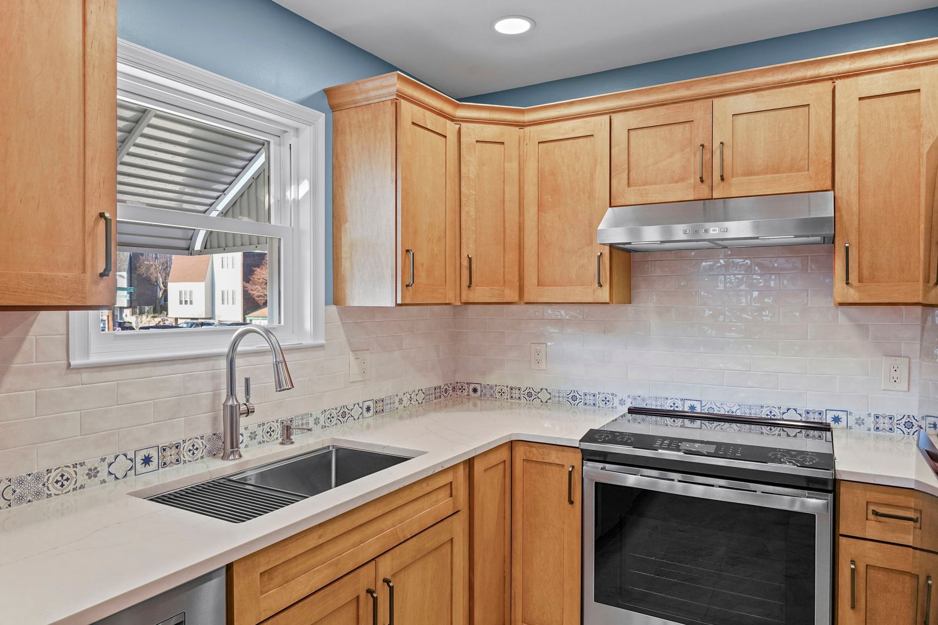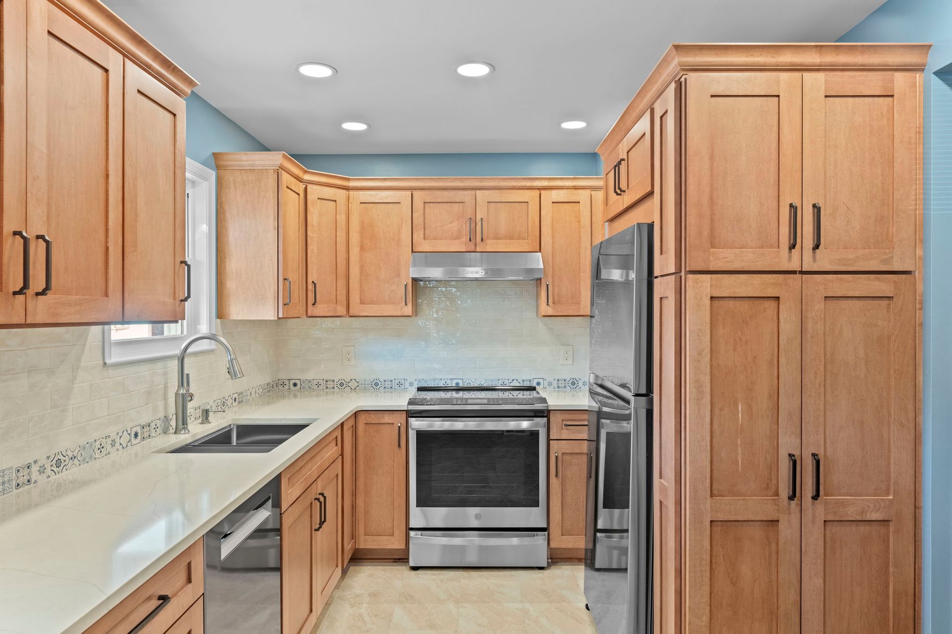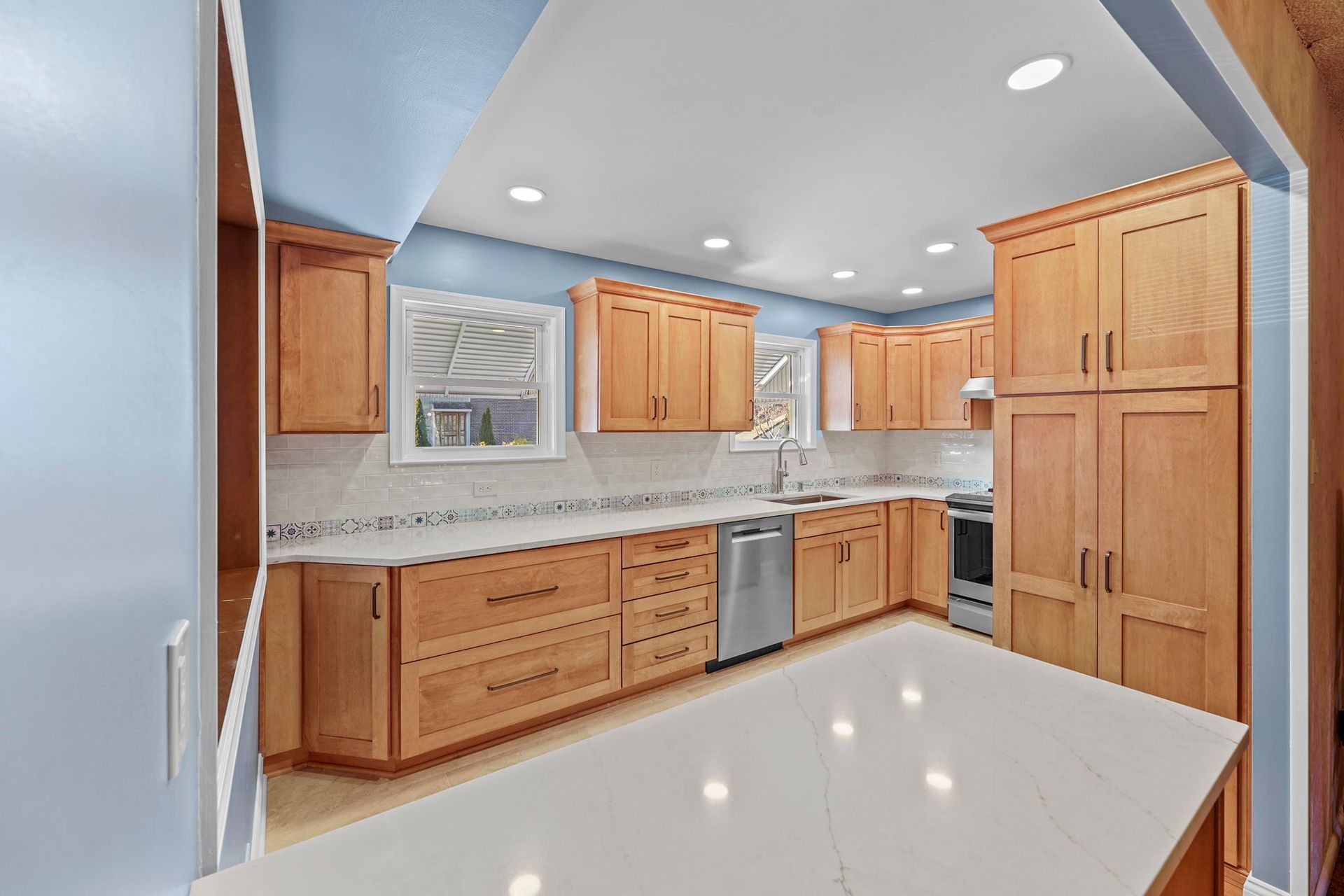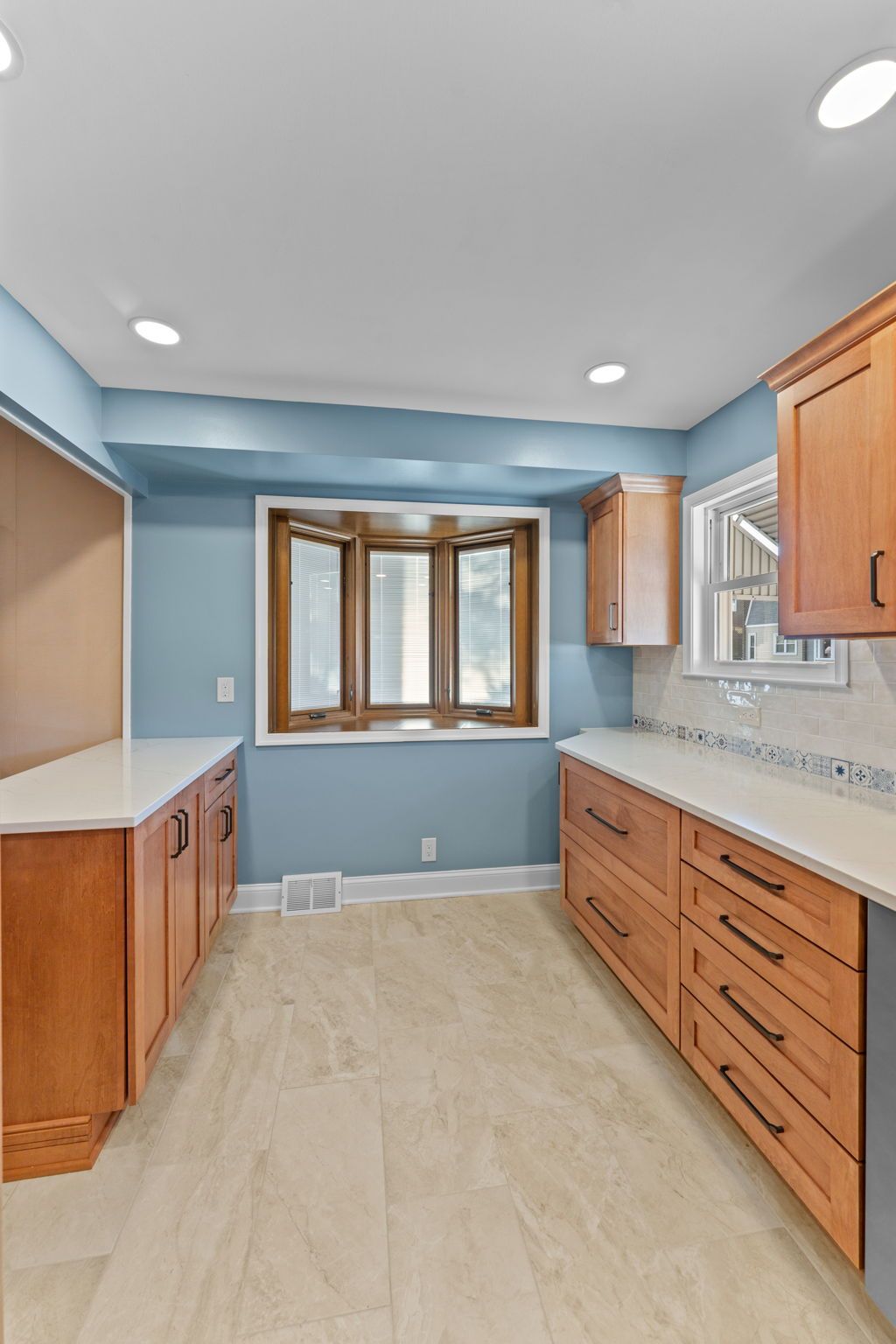 This kitchen incorporates warm wood tones with a cool paint color, bridged by neutral cream tones in their countertop and backsplash. The cabinetry is Wellborn, maple wood in the finish Ginger, and the door style is Prairie. The countertop is Pental quartz in the color Luce Ore, it wraps around most of the kitchen and is on the peninsula by the entrance. The backsplash has a decorative line of Dal Tile Sublimity Mindful Sequence, a nice pop of color that ties the kitchen and the walls together. The remaining backsplash is made of Tile Gallery Soft White Crackle, arranged in the popular subway style. The flooring is Happy Floors, Sonoma Wind, with a marble threshold in the color Pana Chiaro. This kitchen also includes recessed lighting, a steel hood, a soap dispenser, and a Delta farmhouse sink with additions. The client previously installed their bay window and Weiler's did the white molding around it.