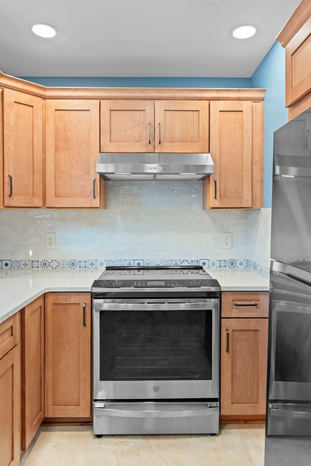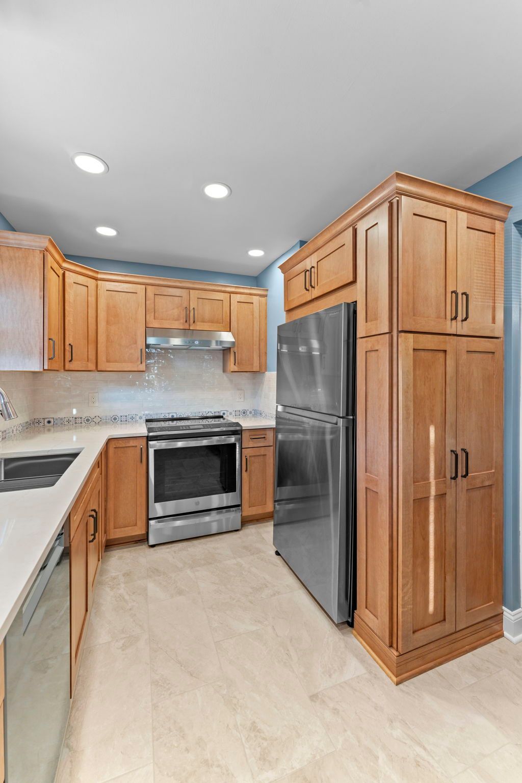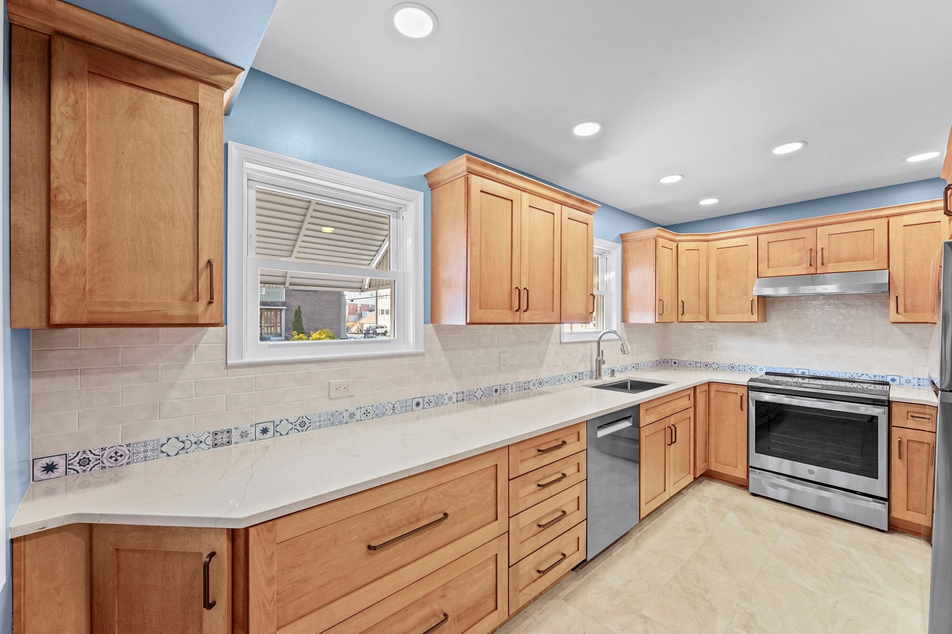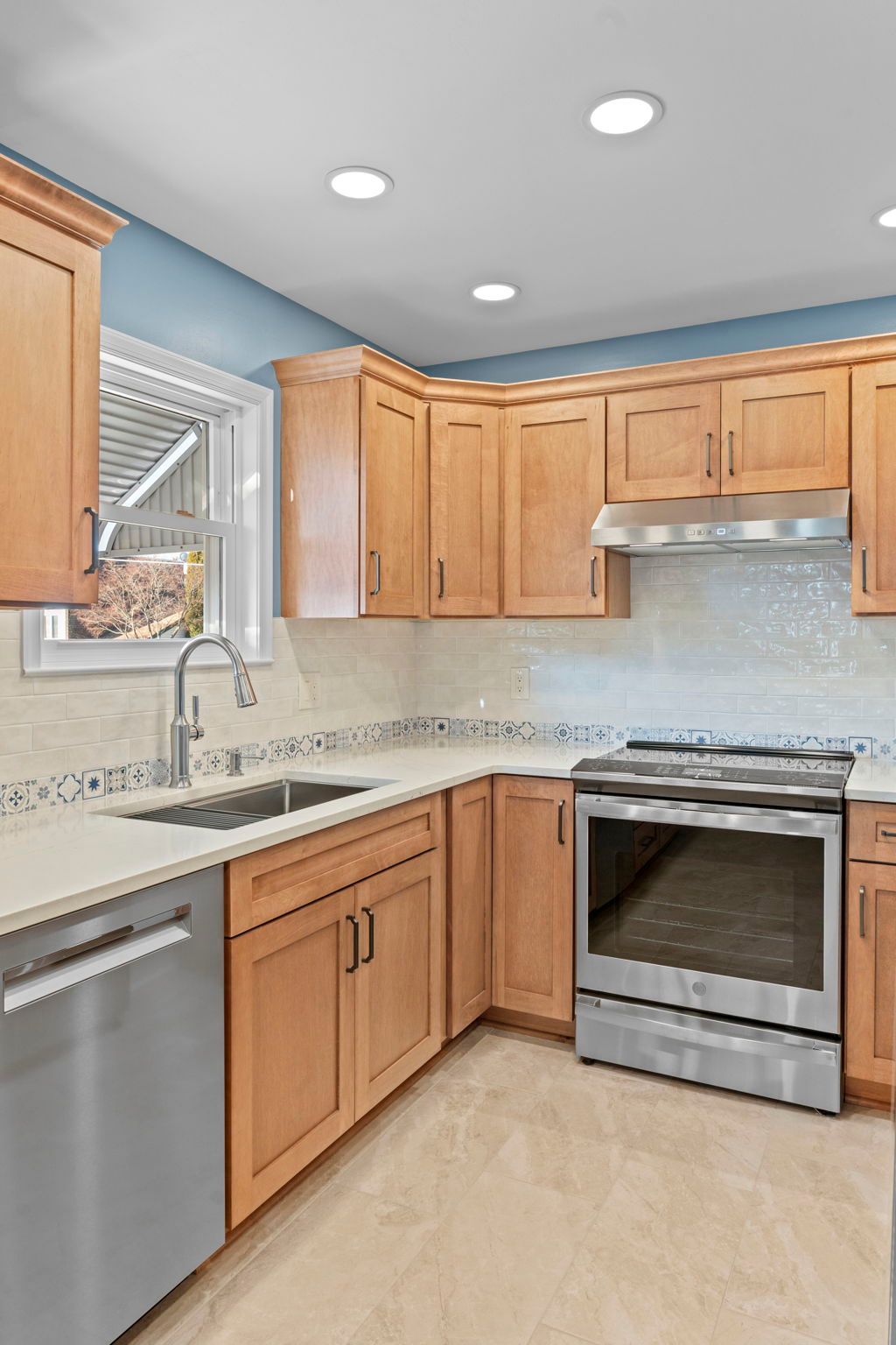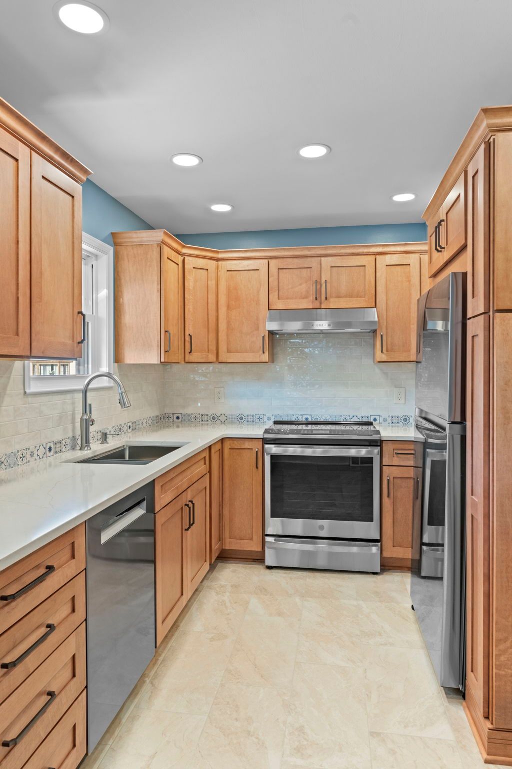 This kitchen incorporates warm wood tones with a cool paint color, bridged by neutral cream tones in their countertop and backsplash. The cabinetry is Wellborn, maple wood in the finish Ginger, and the door style is Prairie. The countertop is Pental quartz in the color Luce Ore, it wraps around most of the kitchen and is on the peninsula by the entrance. The backsplash has a decorative line of Dal Tile Sublimity Mindful Sequence, a nice pop of color that ties the kitchen and the walls together. The remaining backsplash is made of Tile Gallery Soft White Crackle, arranged in the popular subway style. The flooring is Happy Floors, Sonoma Wind, with a marble threshold in the color Pana Chiaro. This kitchen also includes recessed lighting, a steel hood, a soap dispenser, and a Delta farmhouse sink with additions. The client previously installed their bay window and Weiler's did the white molding around it.
