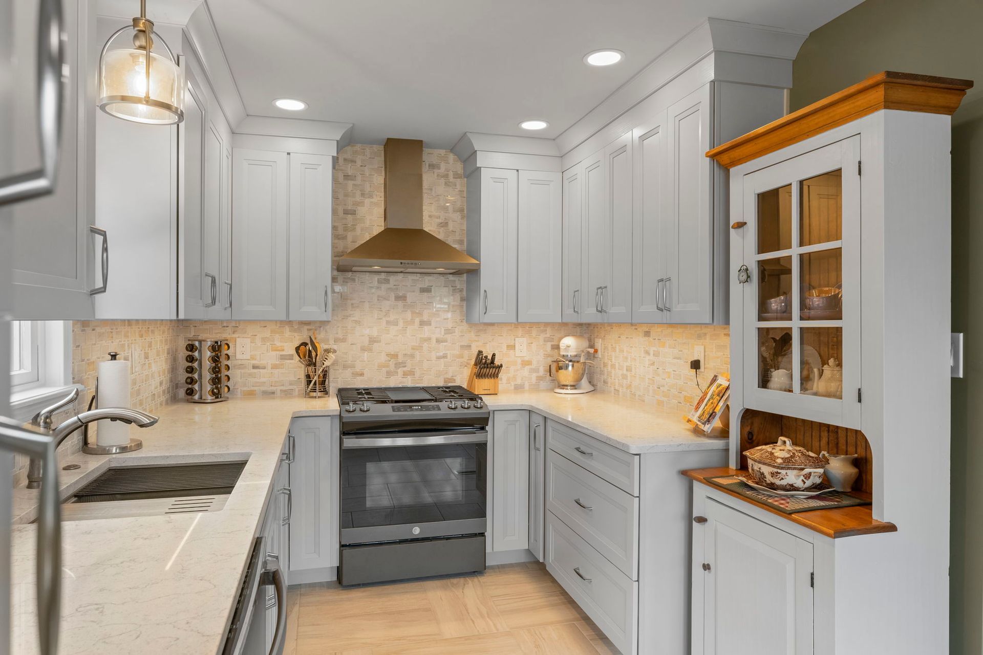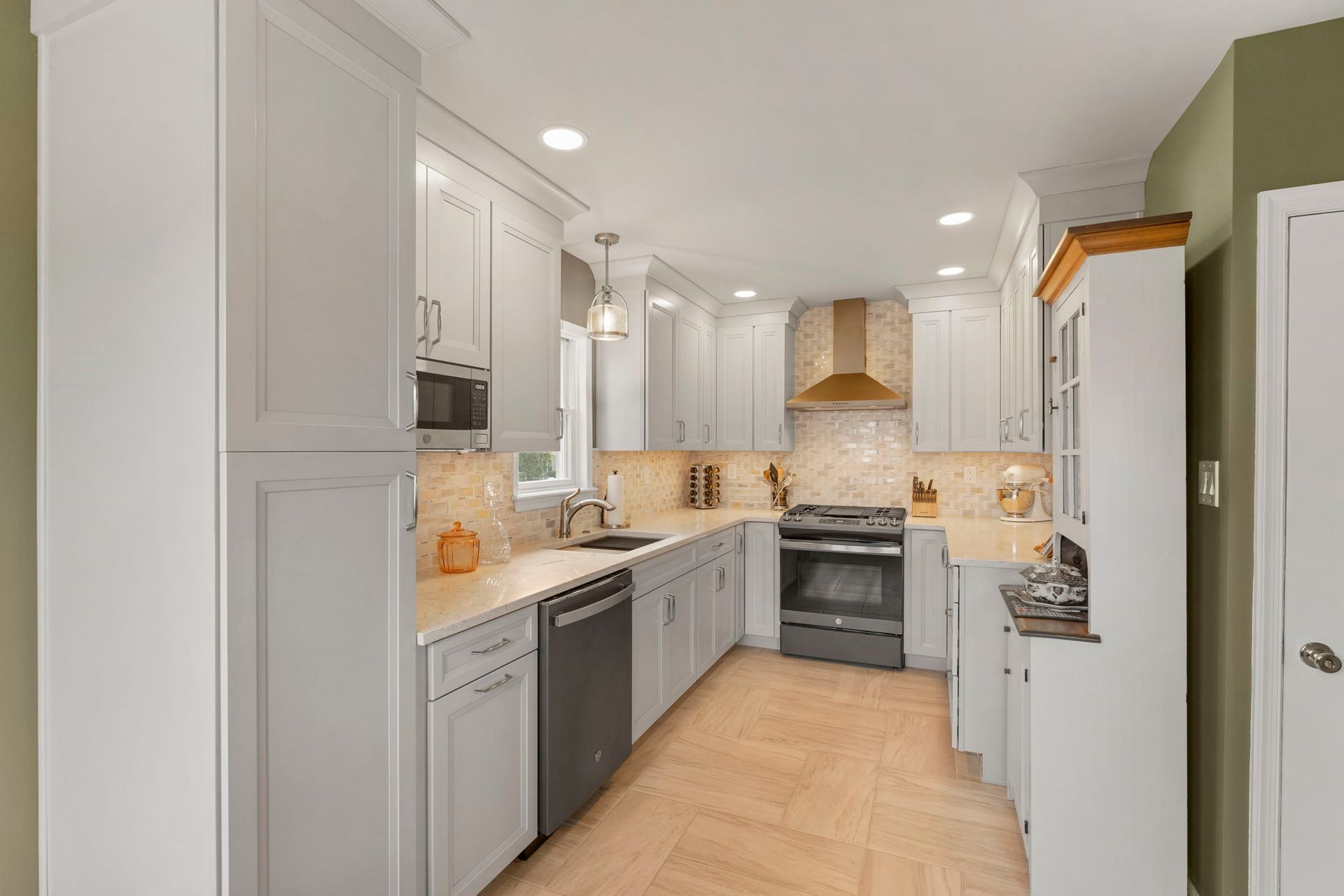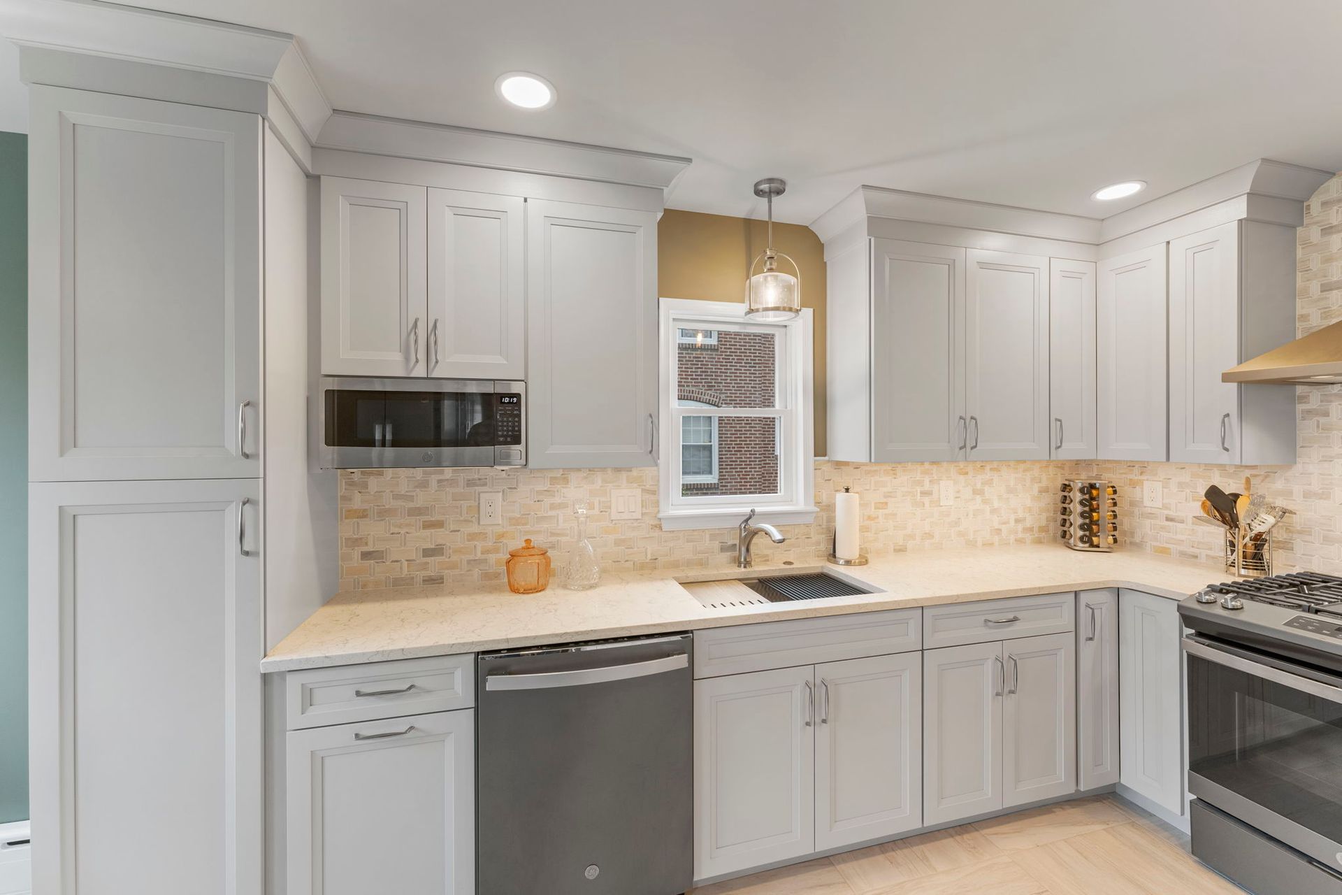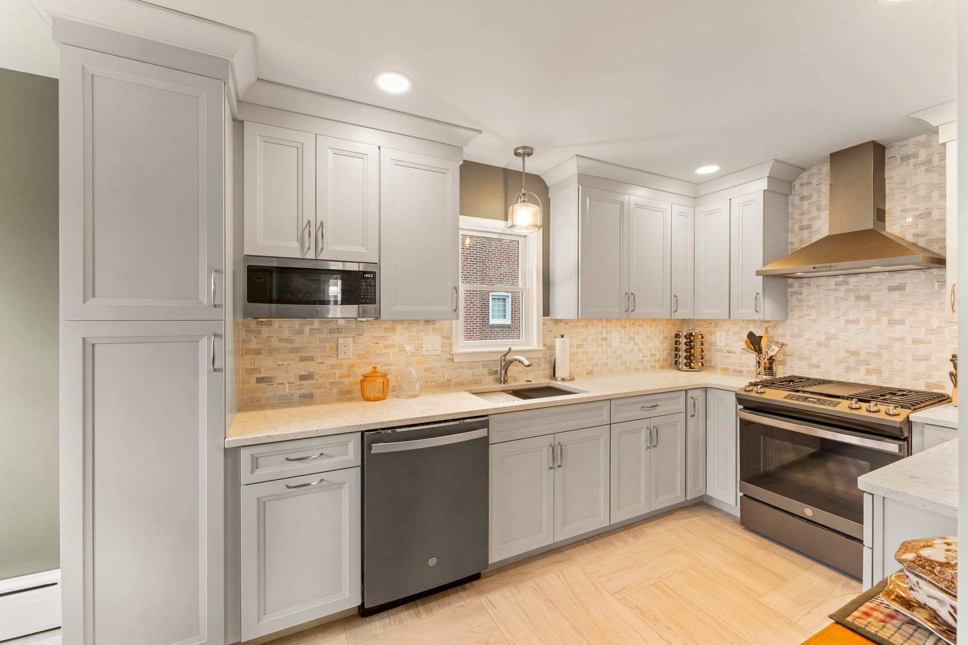 This contemporary Philadelphia kitchen embraces warm tones with light cabinets, resulting in a space that feels larger than its actual dimensions. Waypoint cabinets in the color Harbor extend to the ceiling and give the appearance of high ceilings, the raised backsplash and range also aid in this effect. Lighting includes the pendant above the sink, high hats, and under cabinet LEDs. Emerstone quartz in the color Maori draws in a bit of the warmth from the Angora Framework tan backsplash while still having splashes of light gray to match the cabinets. The floor is Bellagio Light LVP. The final space provides a gorgeous alley for cooking and hosting.