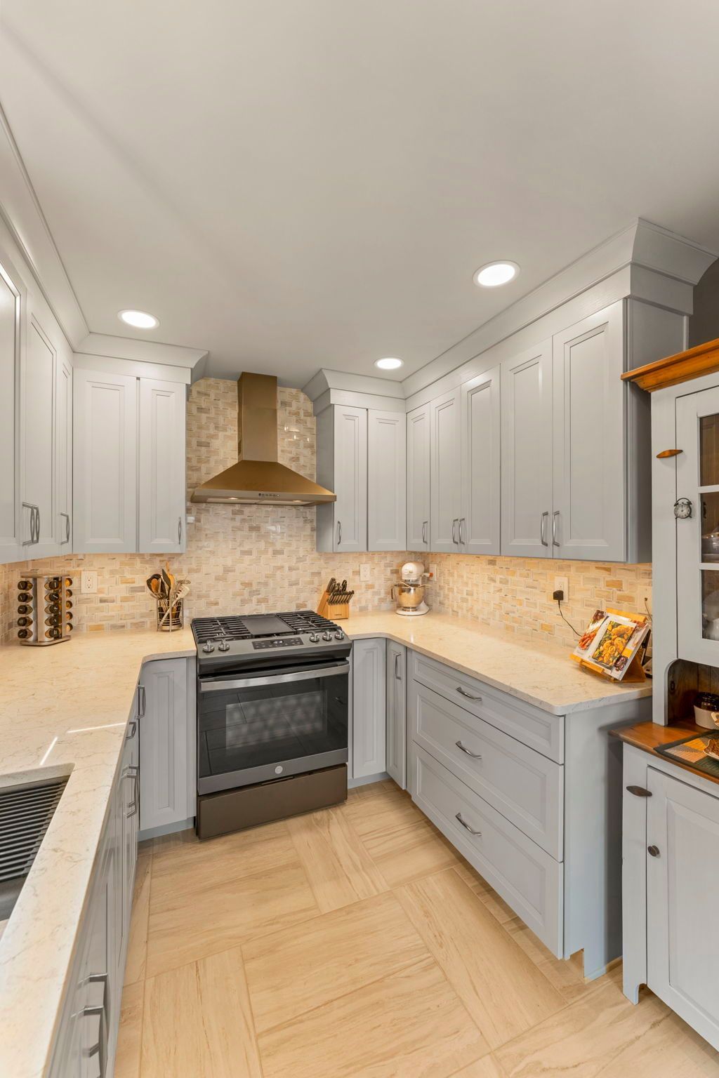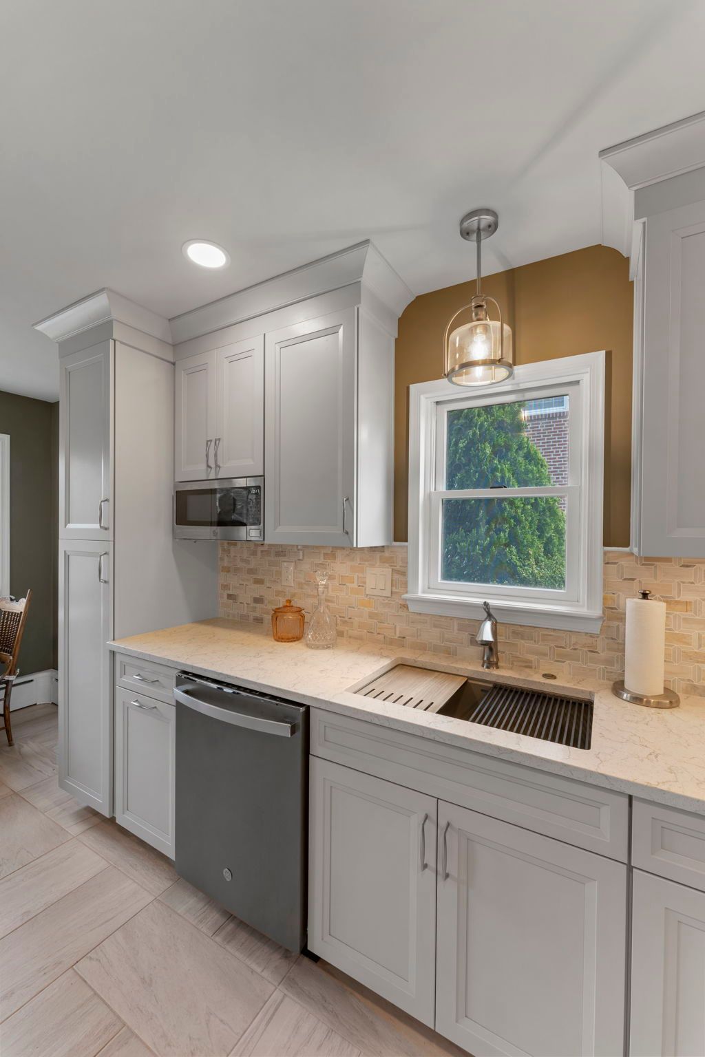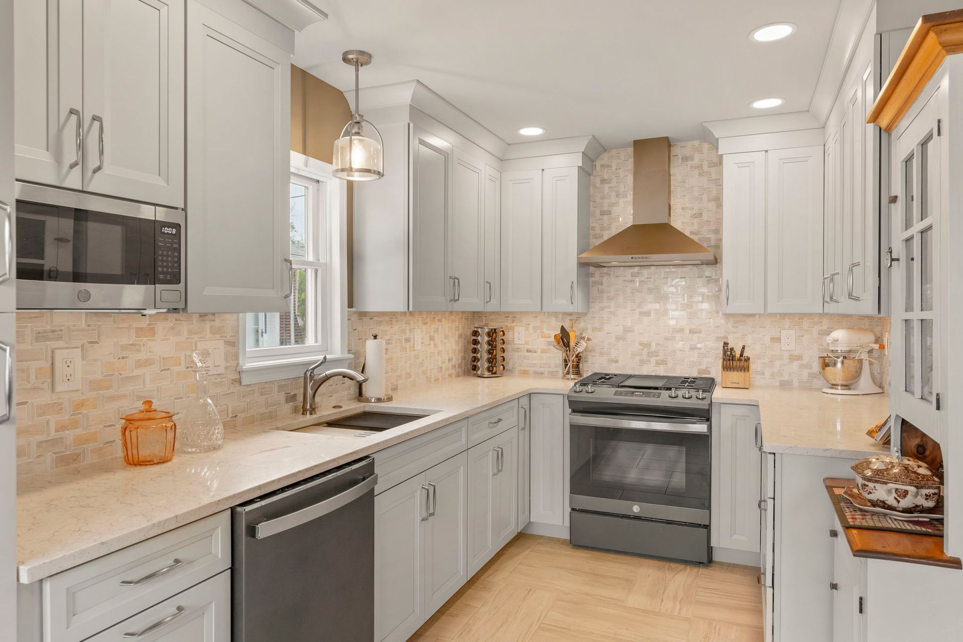 This contemporary Philadelphia kitchen embraces warm tones with light cabinets, resulting in a space that feels larger than its actual dimensions. Waypoint cabinets in the color Harbor extend to the ceiling and give the appearance of high ceilings, the raised backsplash and range also aid in this effect. Lighting includes the pendant above the sink, high hats, and under cabinet LEDs. Emerstone quartz in the color Maori draws in a bit of the warmth from the Angora Framework tan backsplash while still having splashes of light gray to match the cabinets. The floor is Bellagio Light LVP. The final space provides a gorgeous alley for cooking and hosting.