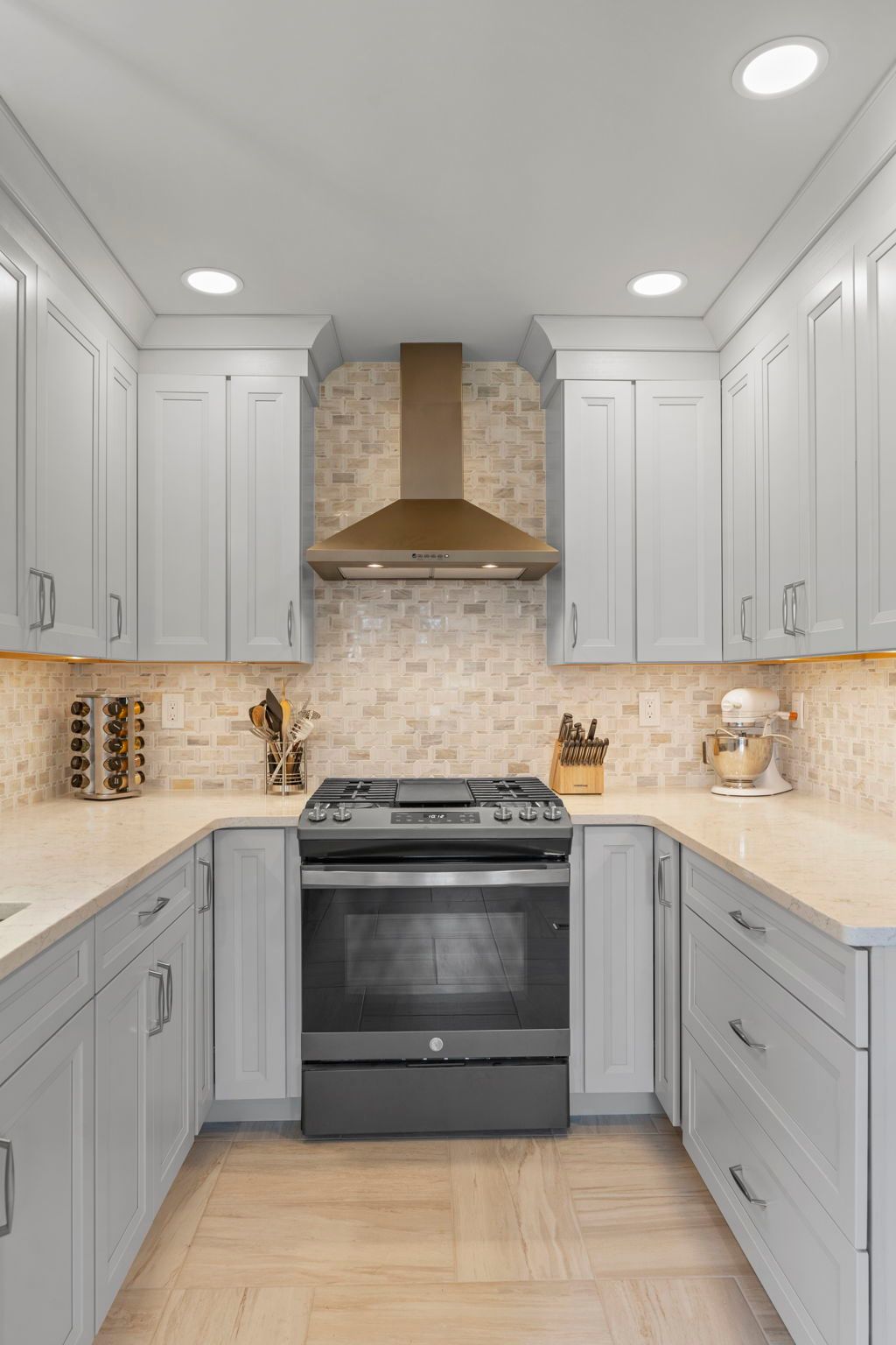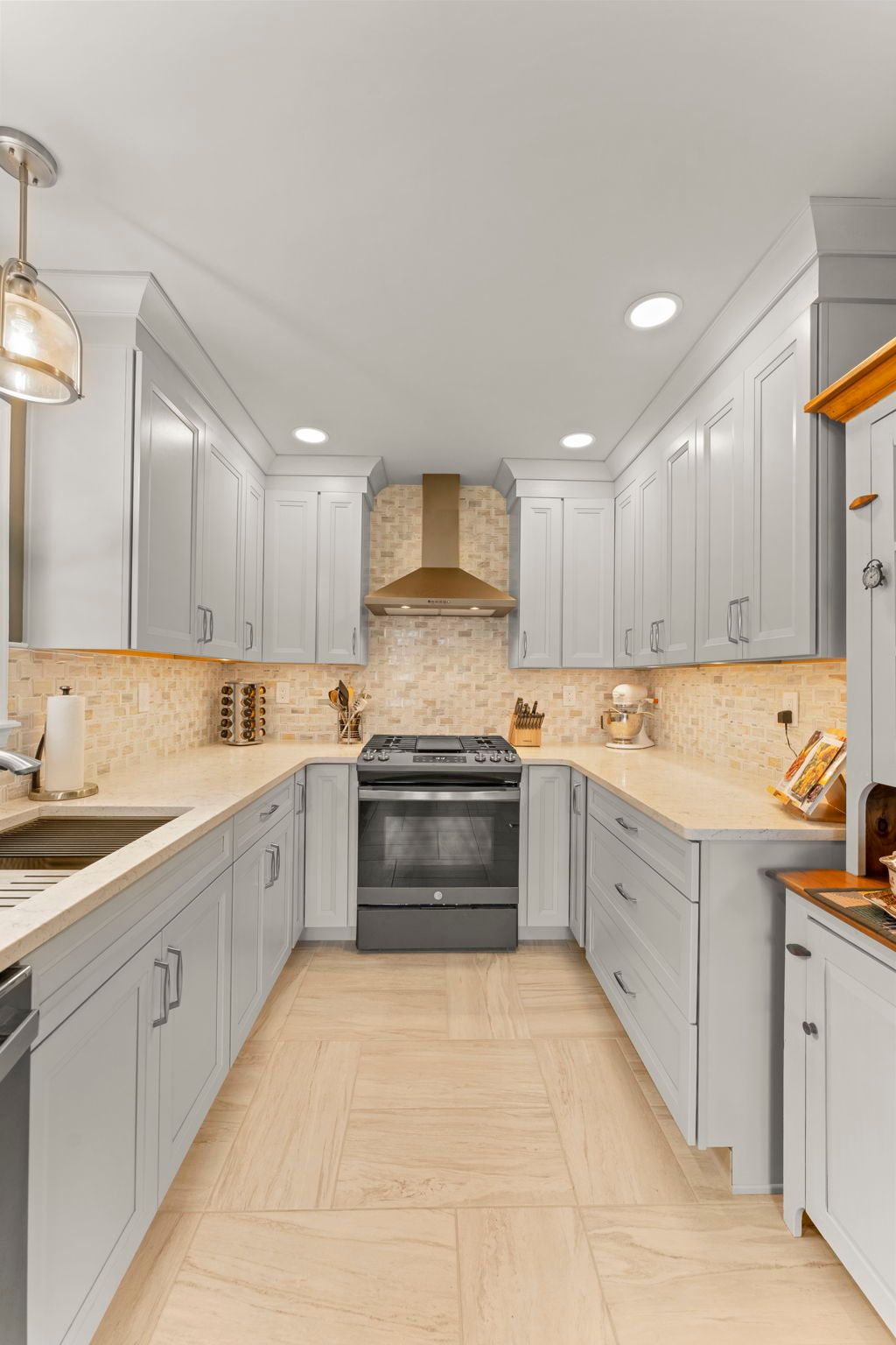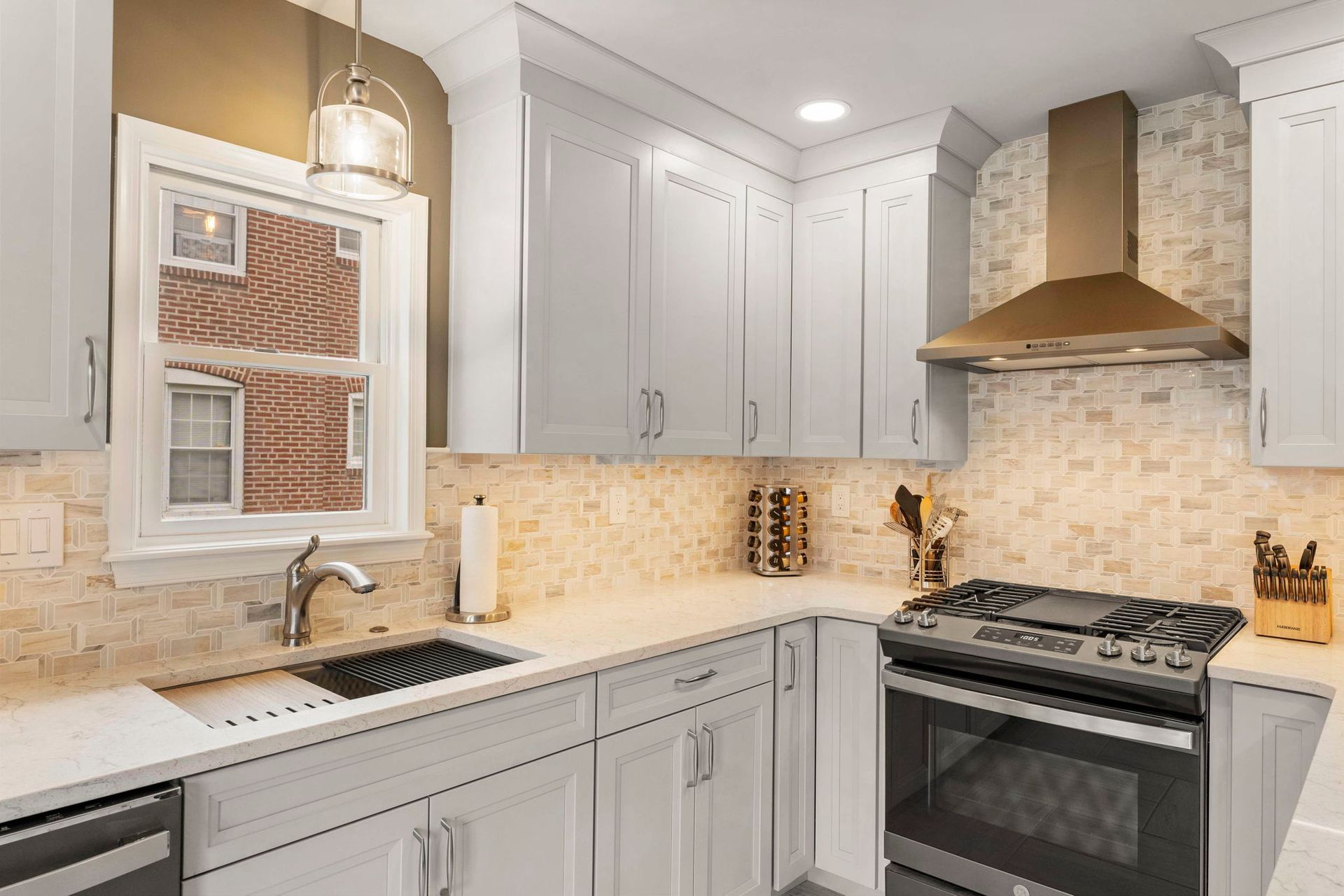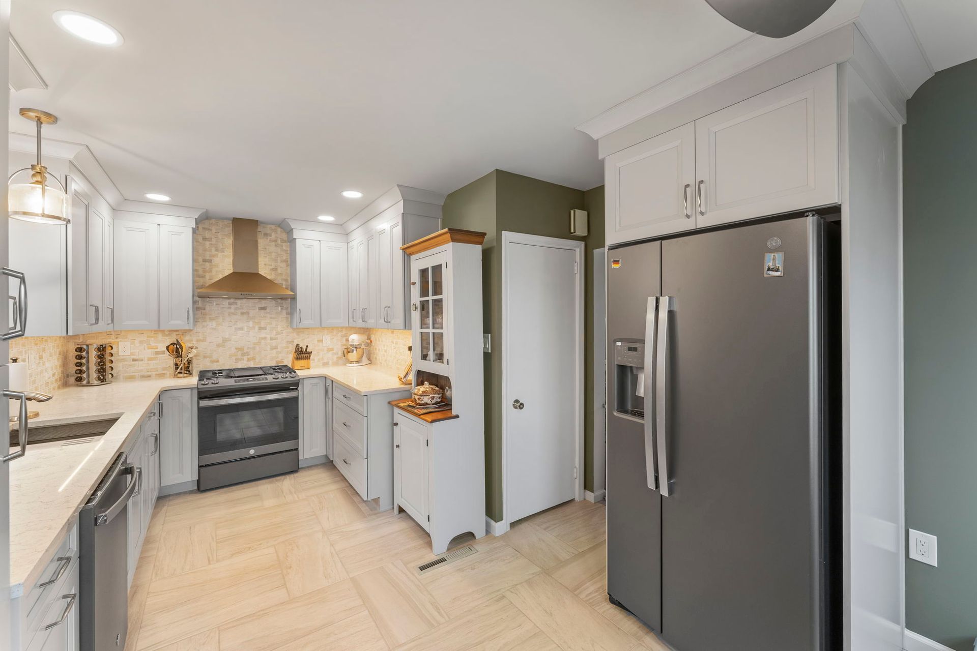 This contemporary Philadelphia kitchen embraces warm tones with light cabinets, resulting in a space that feels larger than its actual dimensions. Waypoint cabinets in the color Harbor extend to the ceiling and give the appearance of high ceilings, the raised backsplash and range also aid in this effect. Lighting includes the pendant above the sink, high hats, and under cabinet LEDs. Emerstone quartz in the color Maori draws in a bit of the warmth from the Angora Framework tan backsplash while still having splashes of light gray to match the cabinets. The floor is Bellagio Light LVP. The final space provides a gorgeous alley for cooking and hosting.