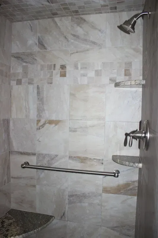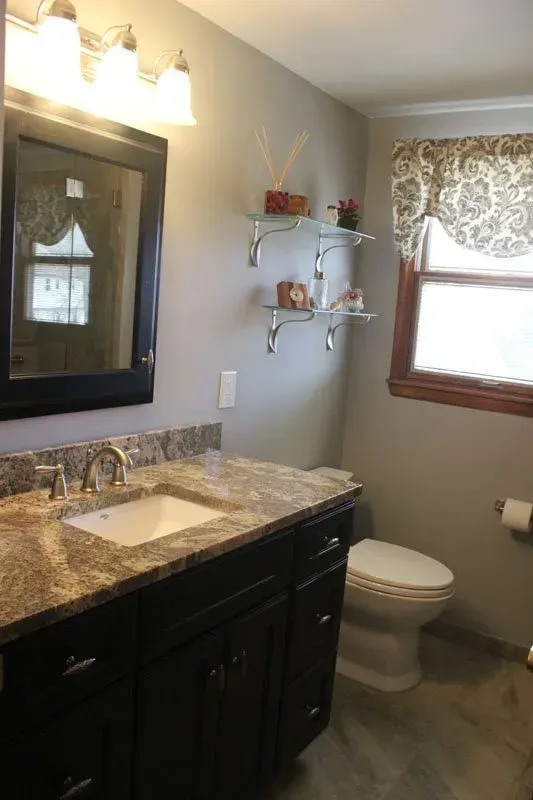 This bathroom in Southampton, PA was updated with Omega Dynasty vanity in cherry with blackberry stain, granite countertops, tile floor, expanded shower with custom tile work and heavy glass door and granite accents.
