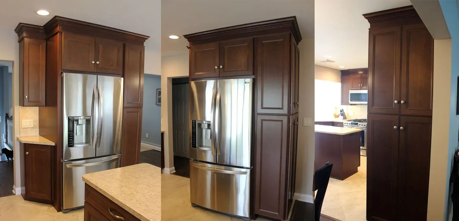 Plenty of cabinet space around this stainless steel refrigerator.