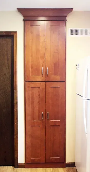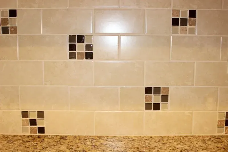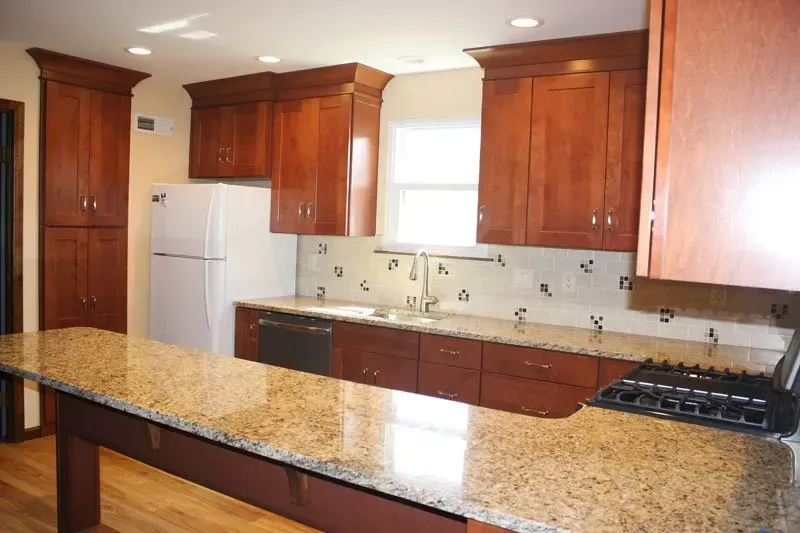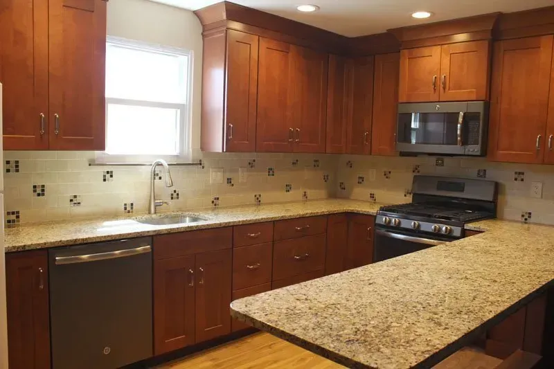This kitchen was updated with maple Waypoint cabinets in cognac, vinyl plank floor, Venetian Gold granite countertop, neutral tile backsplash with mosaic accent tiles and new slate appliances.