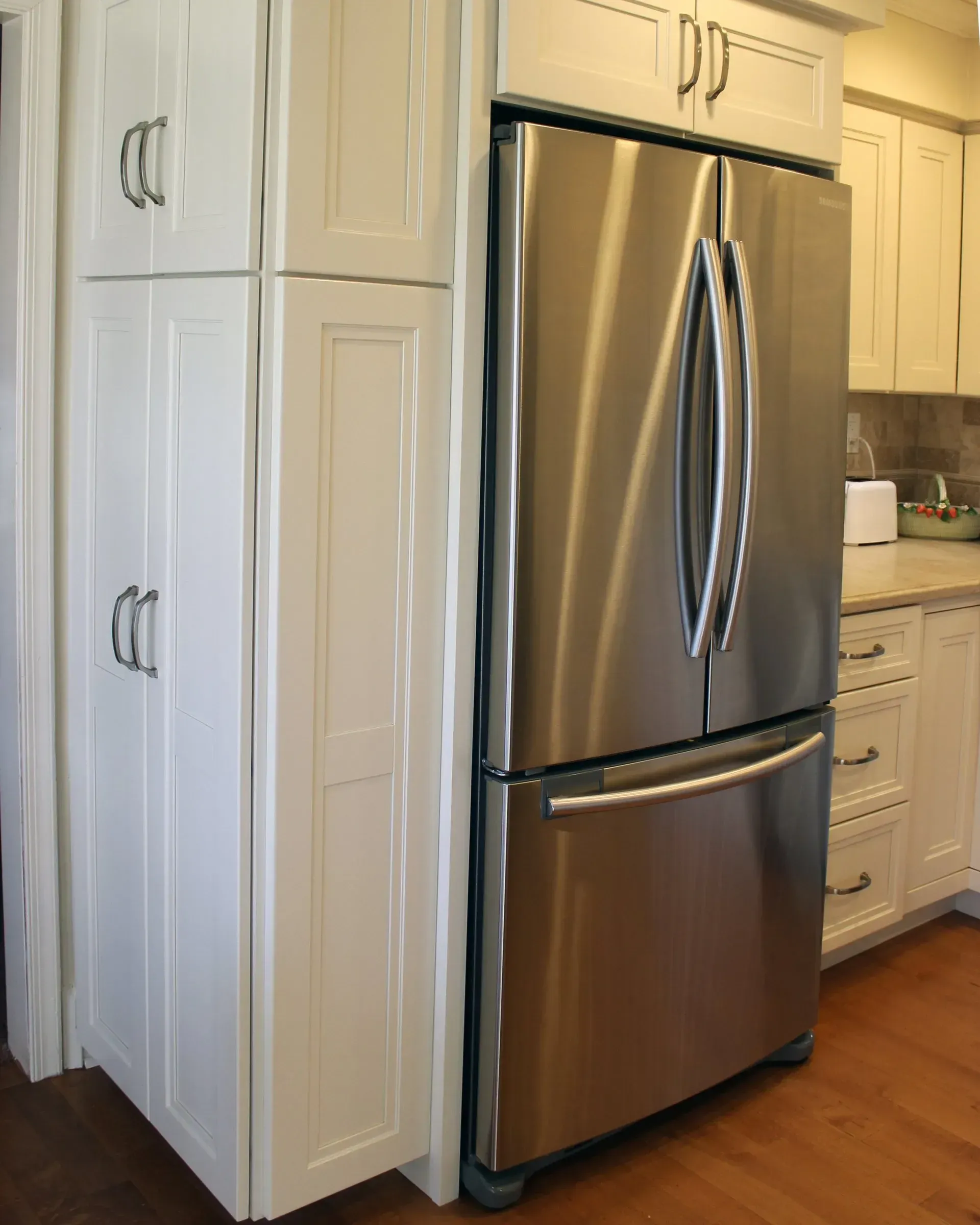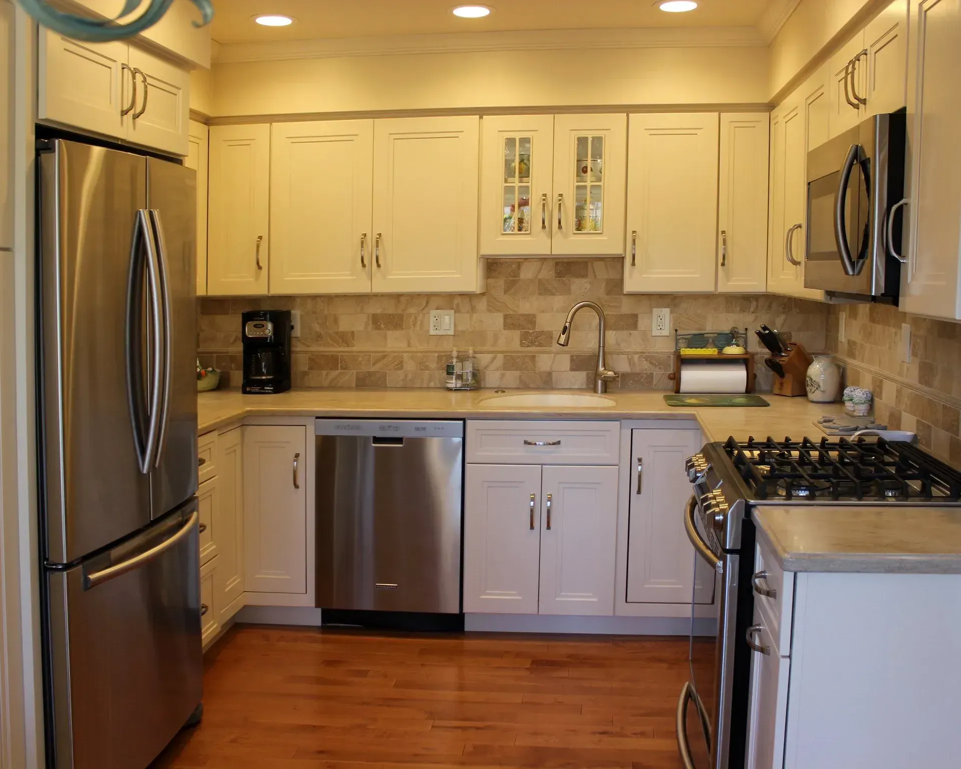 This kitchen was redesigned into a beautiful transitional kitchen with Dynasty by Omega Cabinets in Maple with an Oyster finish and a Corian countertop in Tumbleweed.