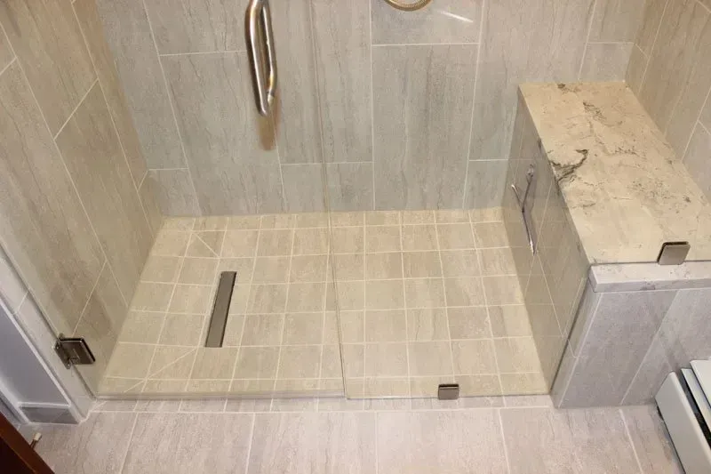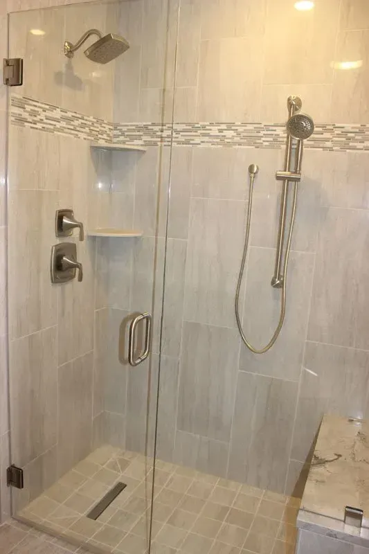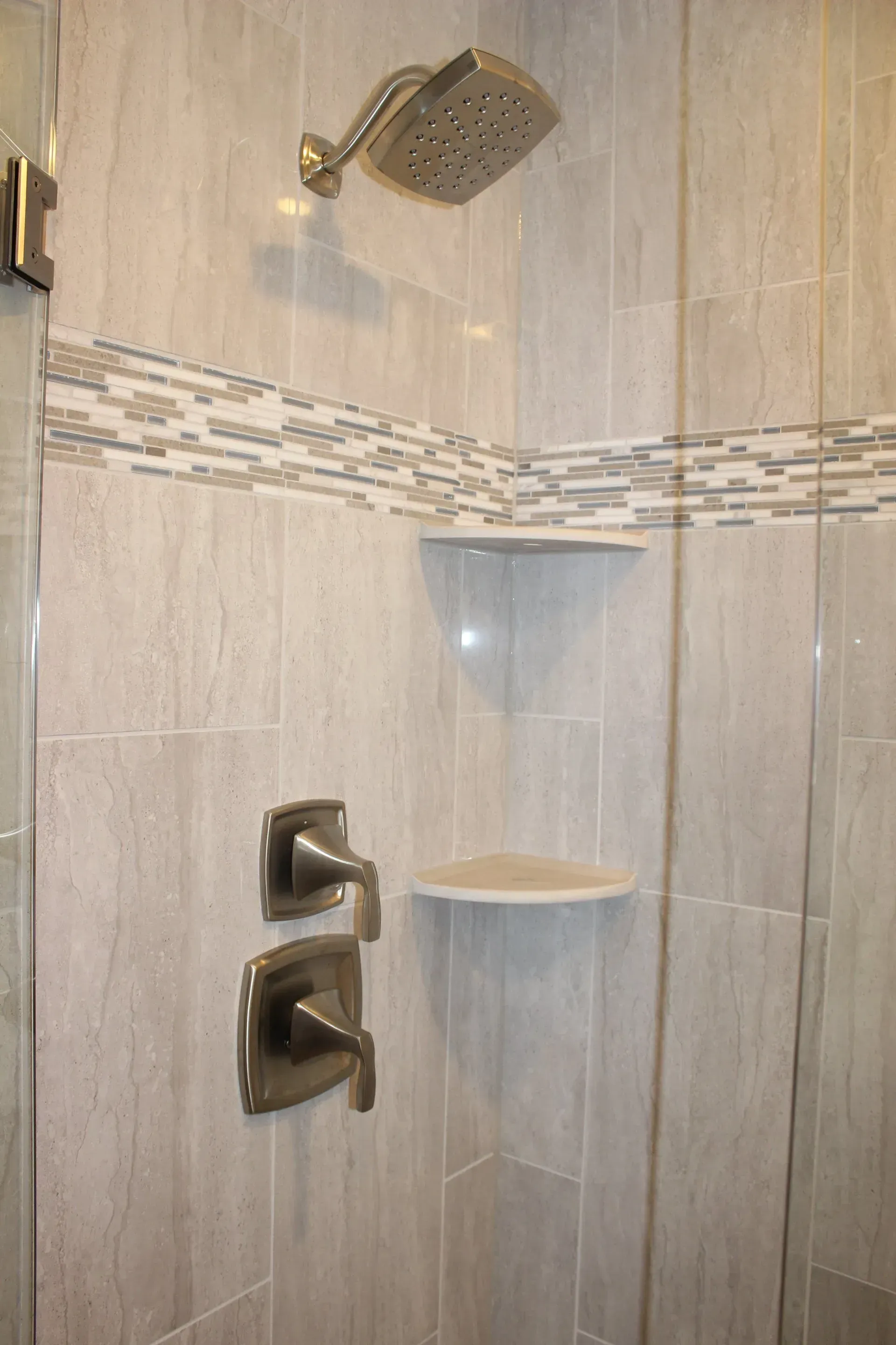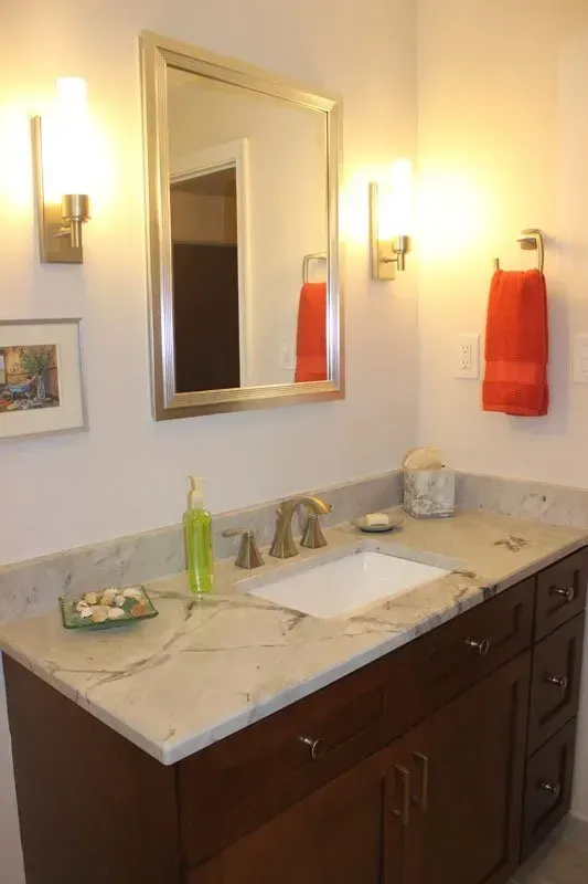 New Vanity with Omega Dynasty cabinets in cherry wood with an onyx stain and a quartz countertop.