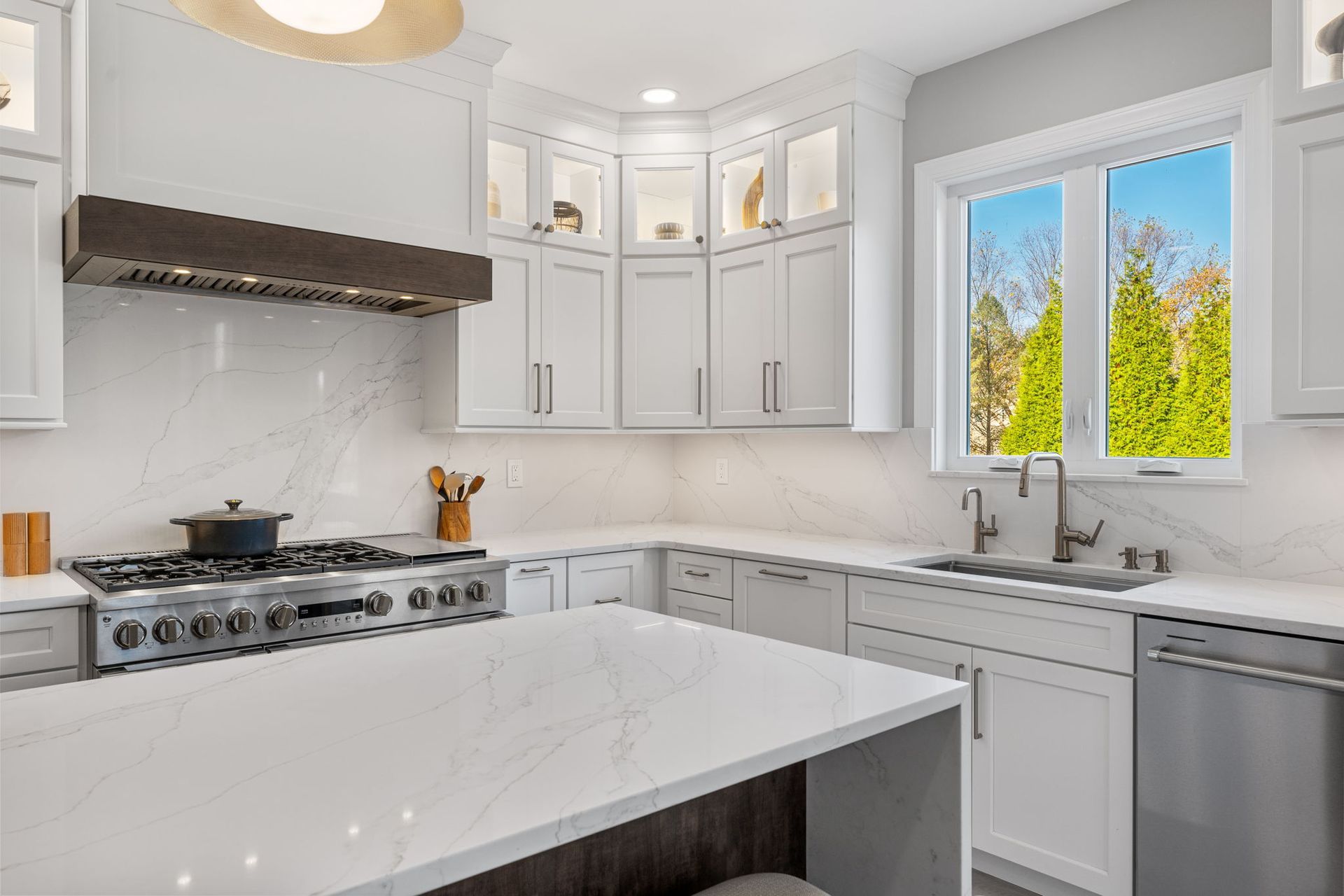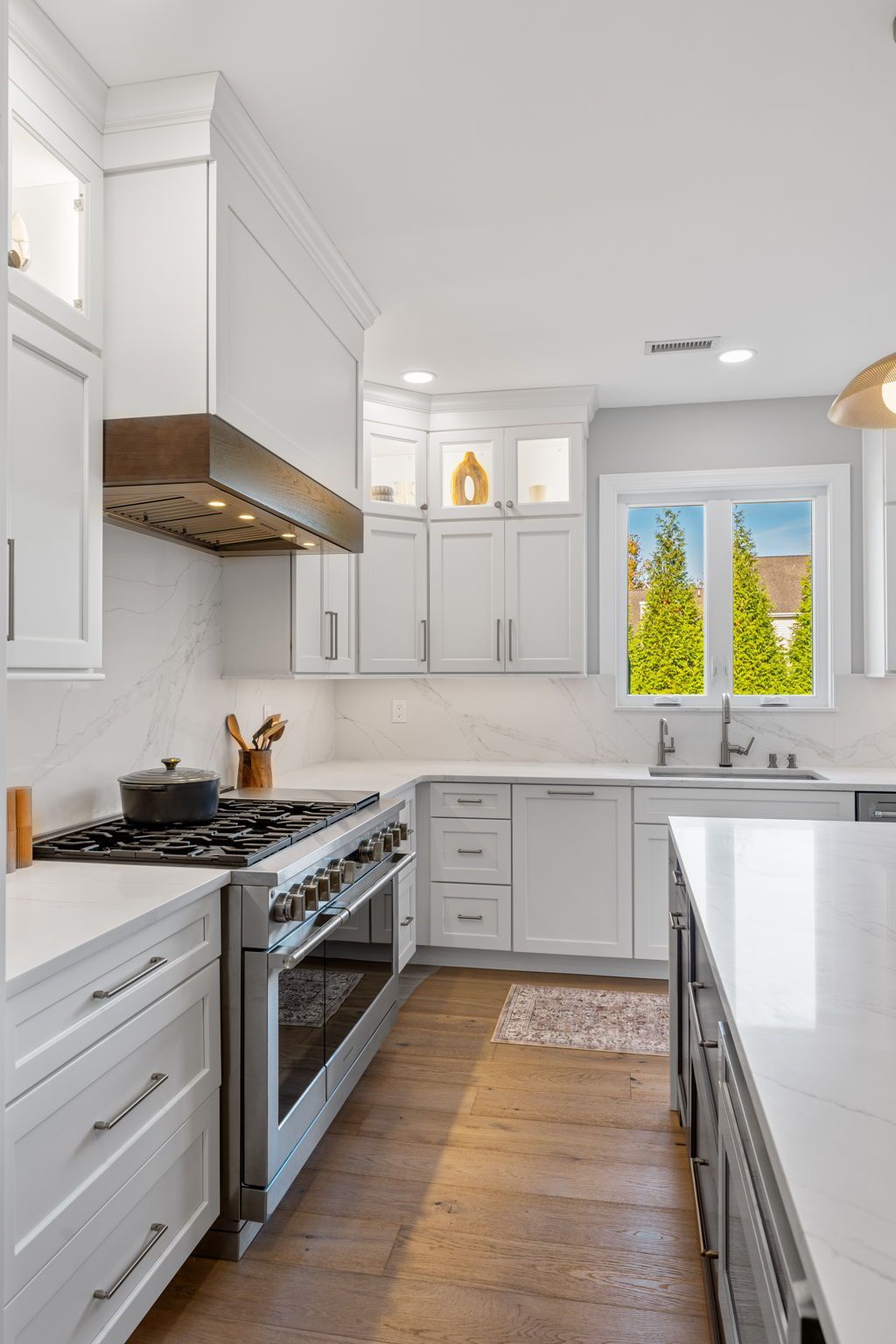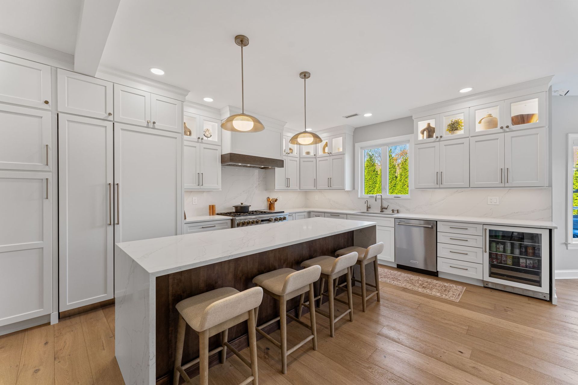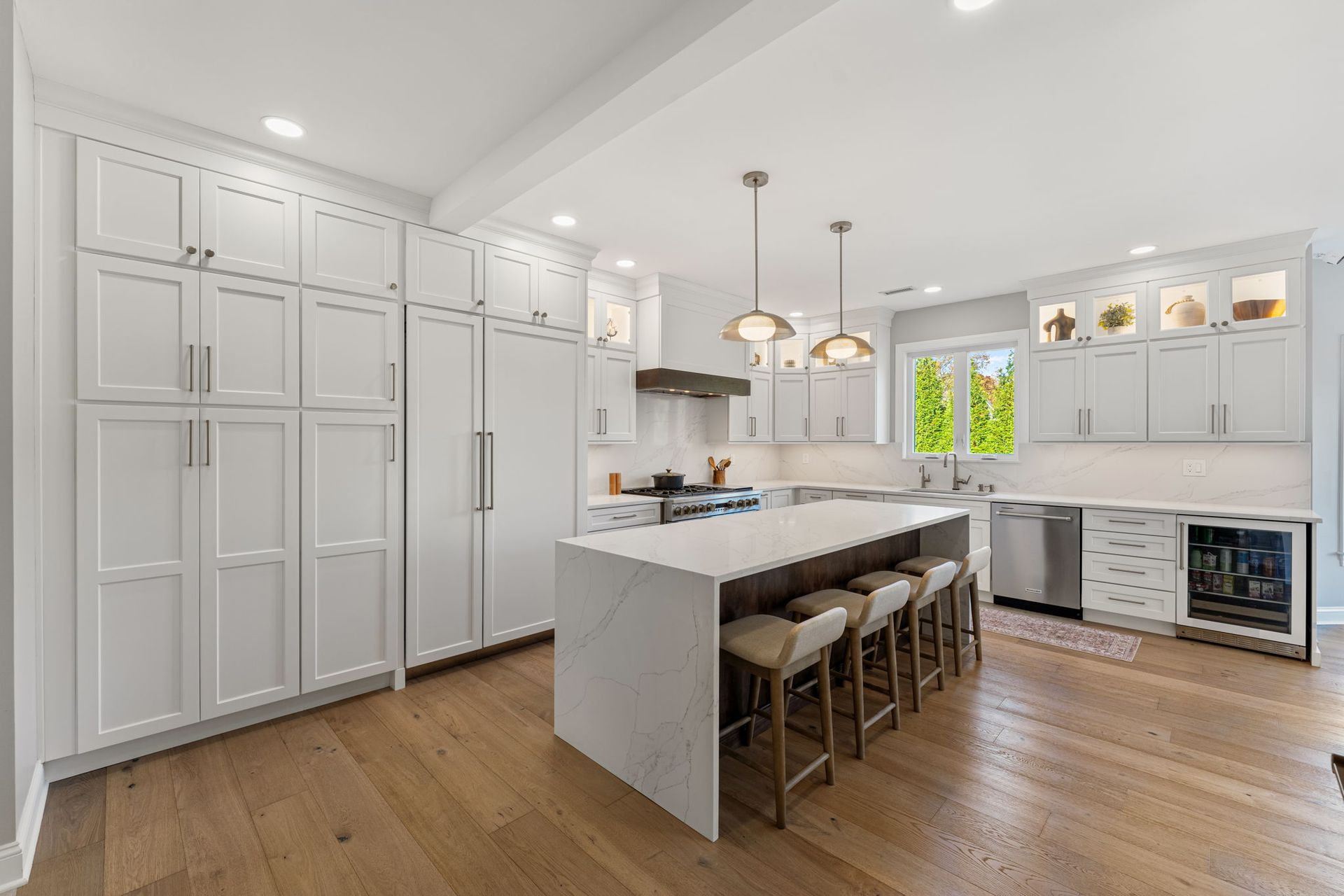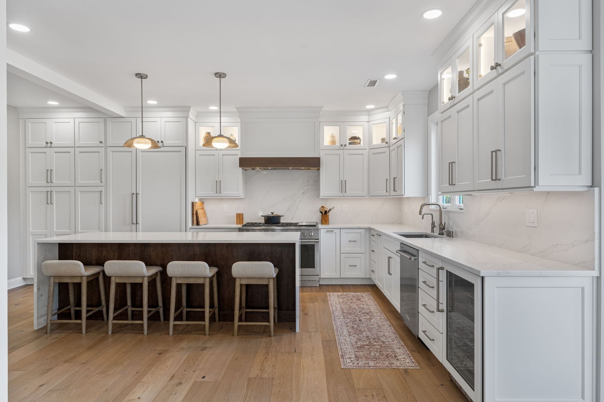 This beautiful modern kitchen uses white cabinets that extend to tall ceilings and an open floor plan to maximize the available space. All cabinets are from Wellborn, the majority of cabinets are MDF in the finish glacier, notice how they got a matching appliance panel for the refrigerator for an upscale look. The island is cherry wood in the finish gauntlet. The countertop is porcelain Macchia Vecchia, it's also used for the full height backsplash and island with two waterfall sides. The porcelain is meant to imitate marble, and it adds a luxurious touch to its minimalistic surroundings. The flooring is LVP provided by the client. Lighting includes pendants, high hats, under cabinet and inner cabinet LEDs. Special touches include a wine fridge on the same side as the dishwasher, an extra wide oven/stovetop, upper glass transom cabinets for showcasing, and a darker wood cap on the white range to tie in the darker island.