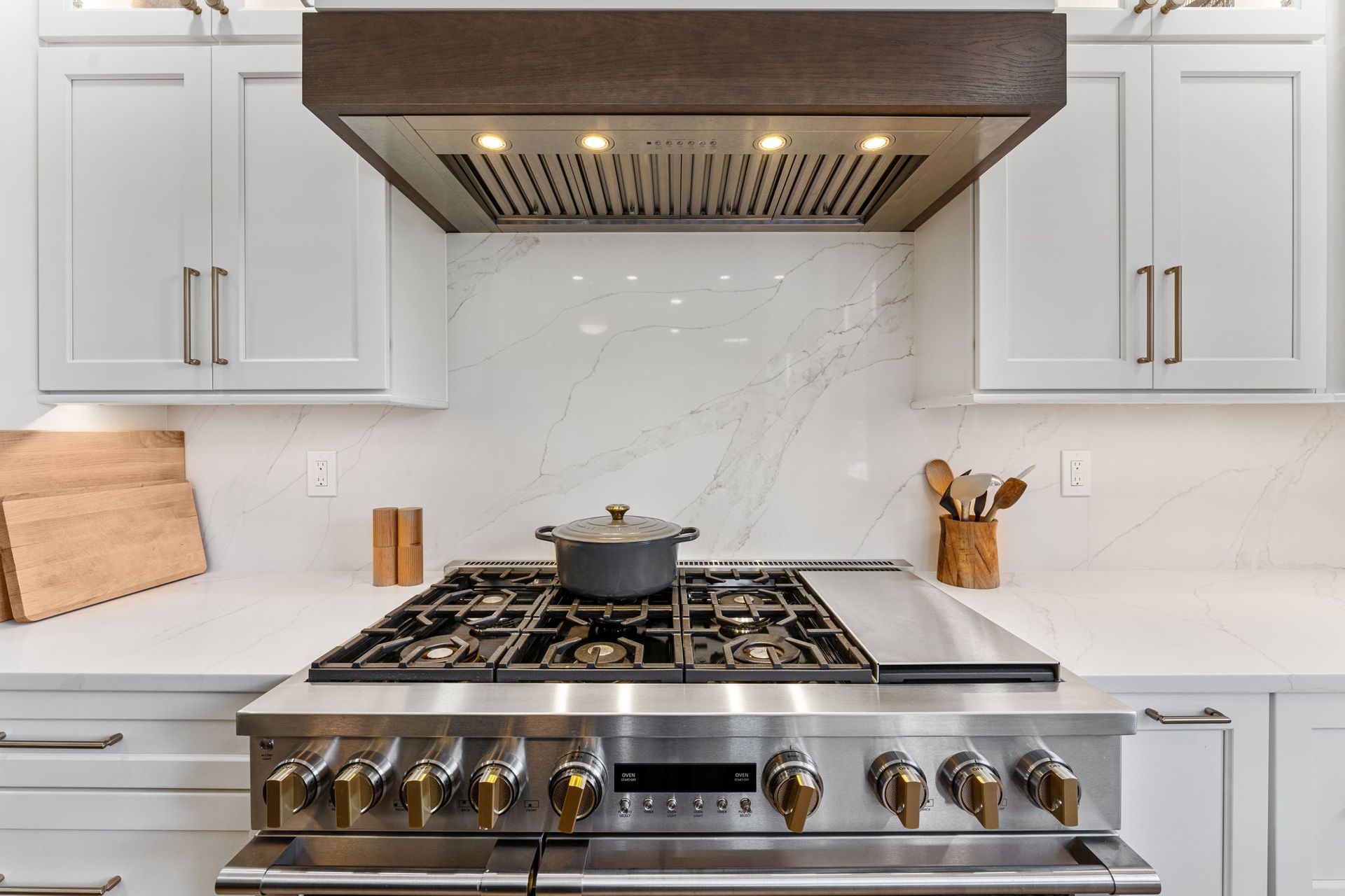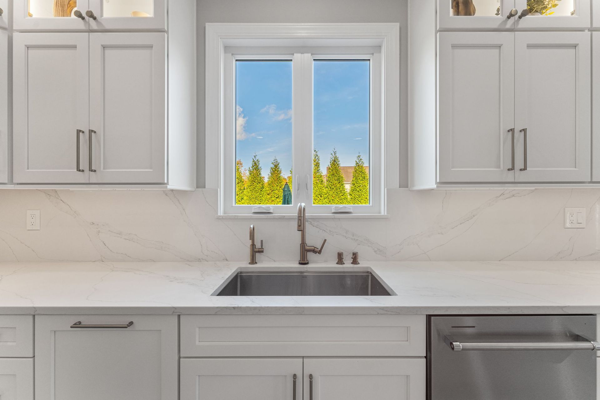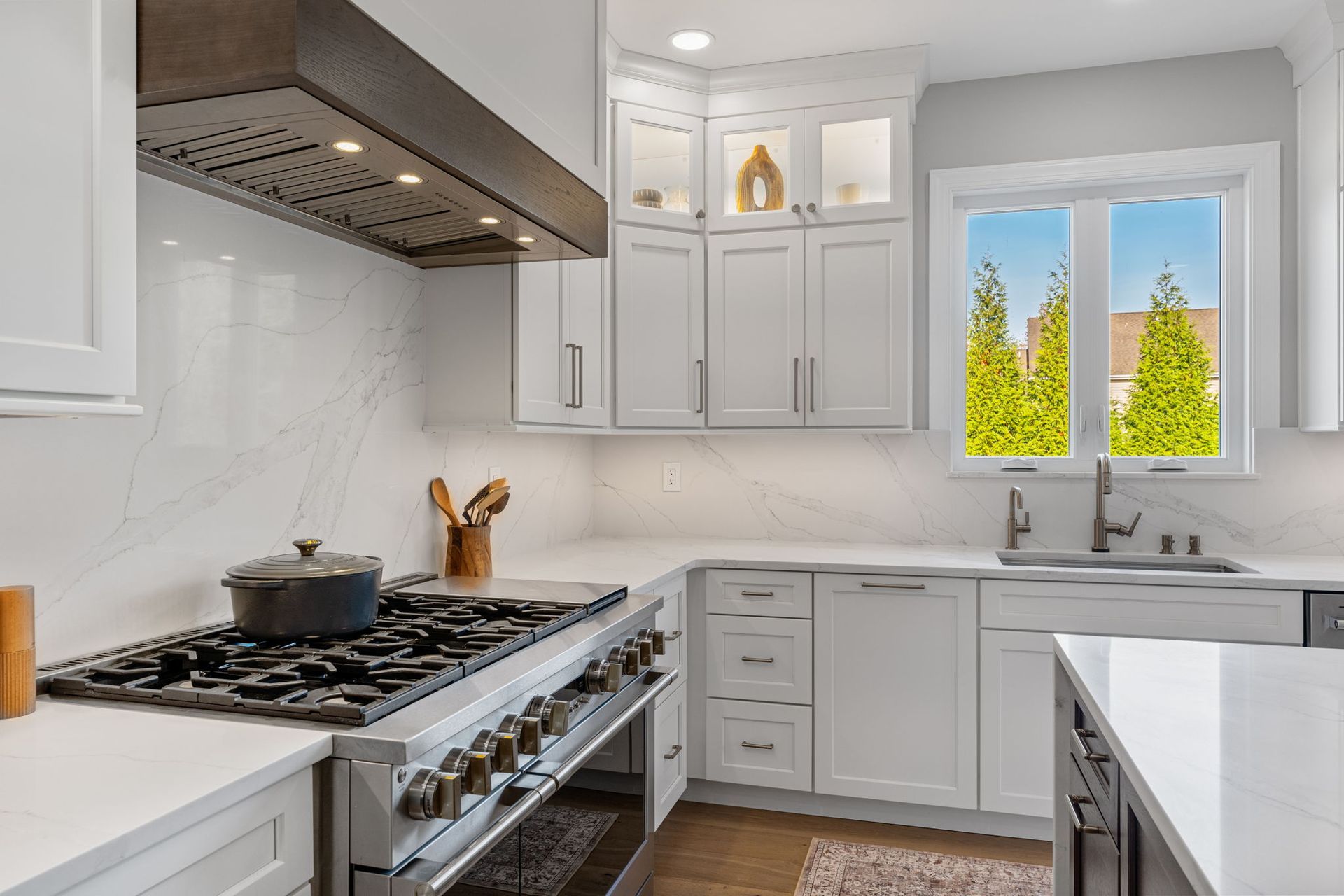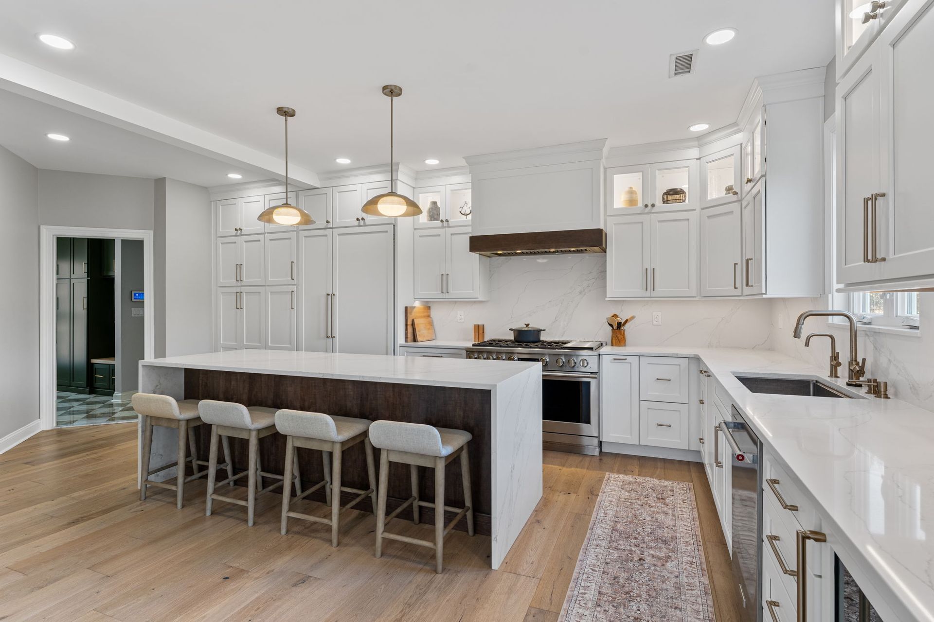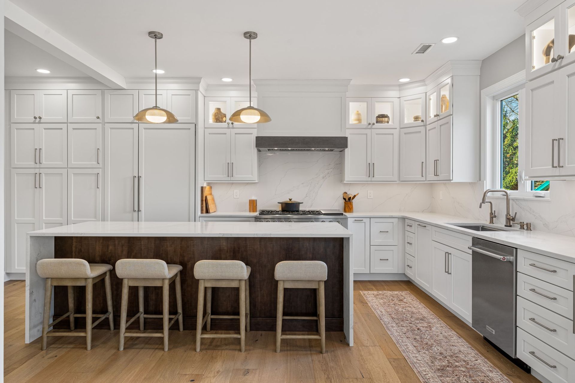 This beautiful modern kitchen uses white cabinets that extend to tall ceilings and an open floor plan to maximize the available space. All cabinets are from Wellborn, the majority of cabinets are MDF in the finish glacier, notice how they got a matching appliance panel for the refrigerator for an upscale look. The island is cherry wood in the finish gauntlet. The countertop is porcelain Macchia Vecchia, it's also used for the full height backsplash and island with two waterfall sides. The porcelain is meant to imitate marble, and it adds a luxurious touch to its minimalistic surroundings. The flooring is LVP provided by the client. Lighting includes pendants, high hats, under cabinet and inner cabinet LEDs. Special touches include a wine fridge on the same side as the dishwasher, an extra wide oven/stovetop, upper glass transom cabinets for showcasing, and a darker wood cap on the white range to tie in the darker island.